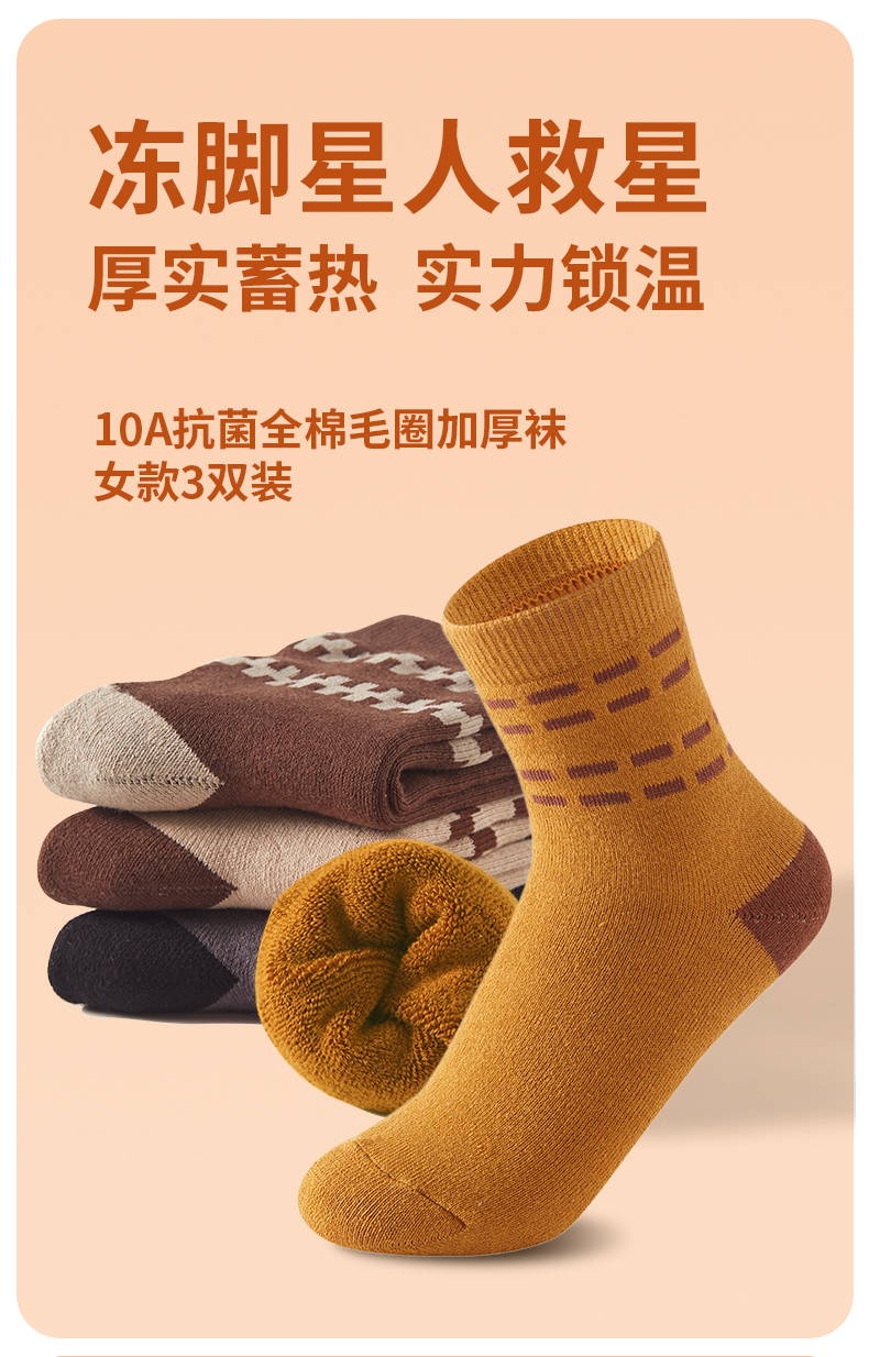 恒源祥 10A抗菌全棉毛圈加厚袜女款3双装 HYX061WZ