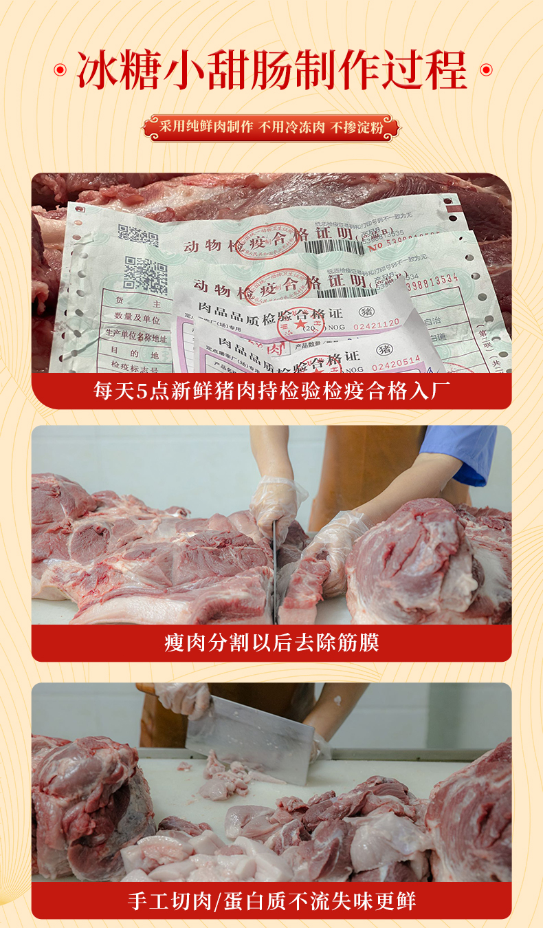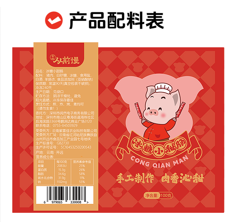 【产品配料】猪肉、白砂糖、冰糖、食用盐、白酒、羊肠衣、食品添加剂(亚硝酸钠)
