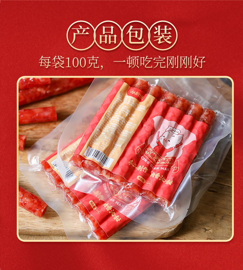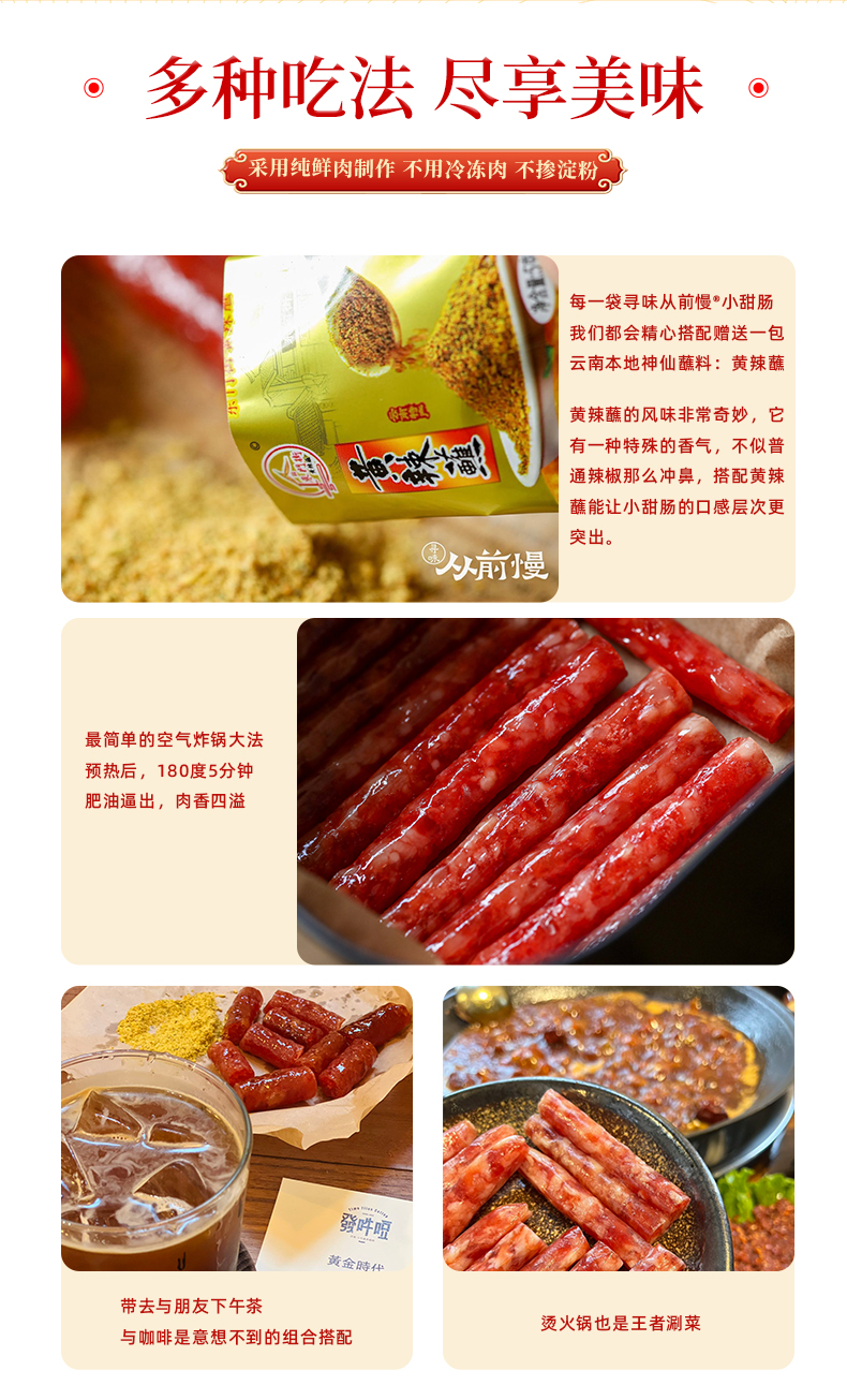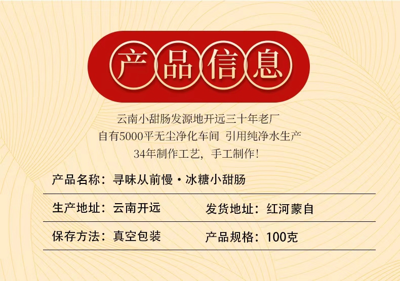 【品名/规格】【寻味从前慢】冰糖小甜肠(100g/袋,6-7根/袋)每一袋寻味从前慢®小甜肠都会搭赠一包云南本地神仙蘸料(黄辣蘸)