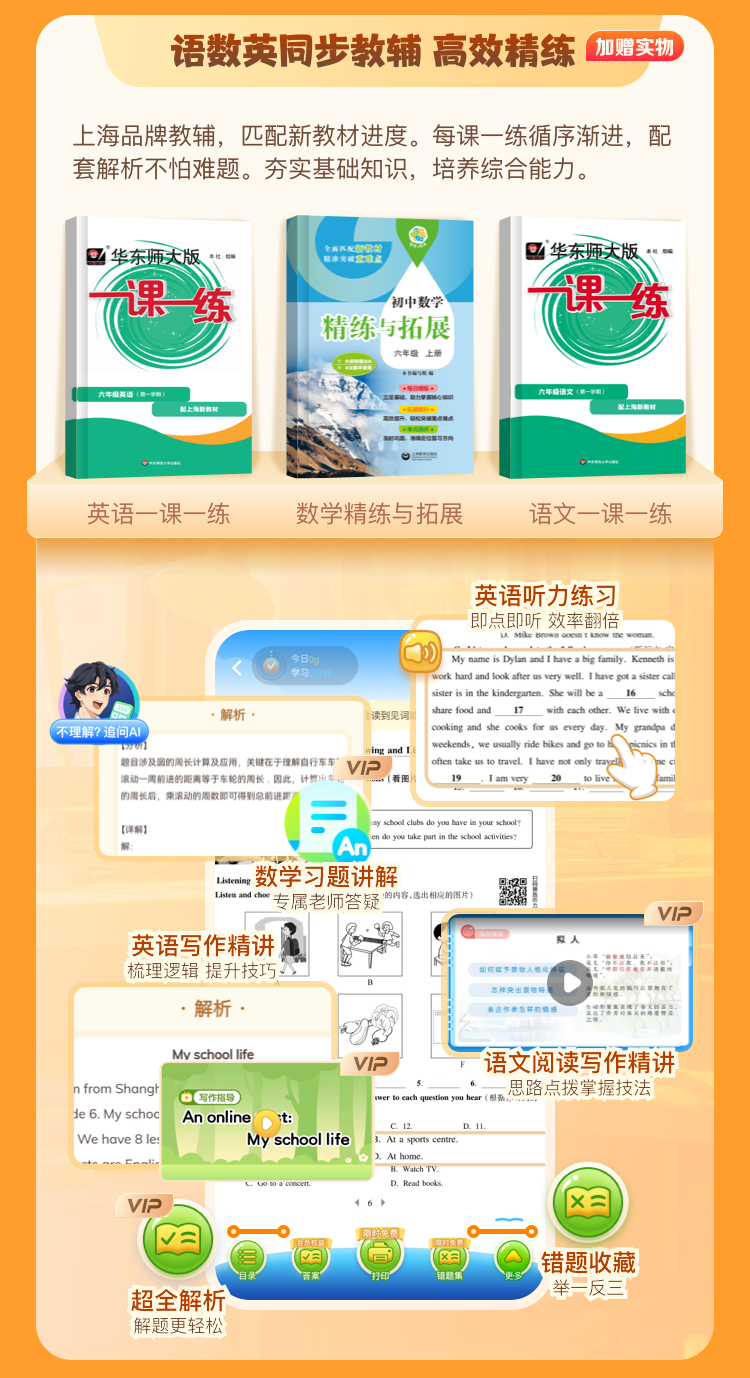 6、7年级专享 | VIP会员畅学(赠英语&语文《一课一练》+《数学精练与拓展》,同步课本预复习,智能点读、知识讲解;同步教辅高效学,专项提升、重难突破)