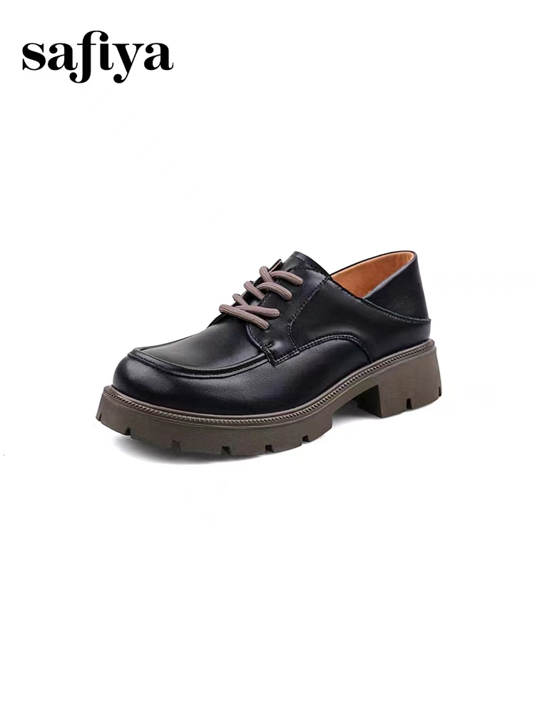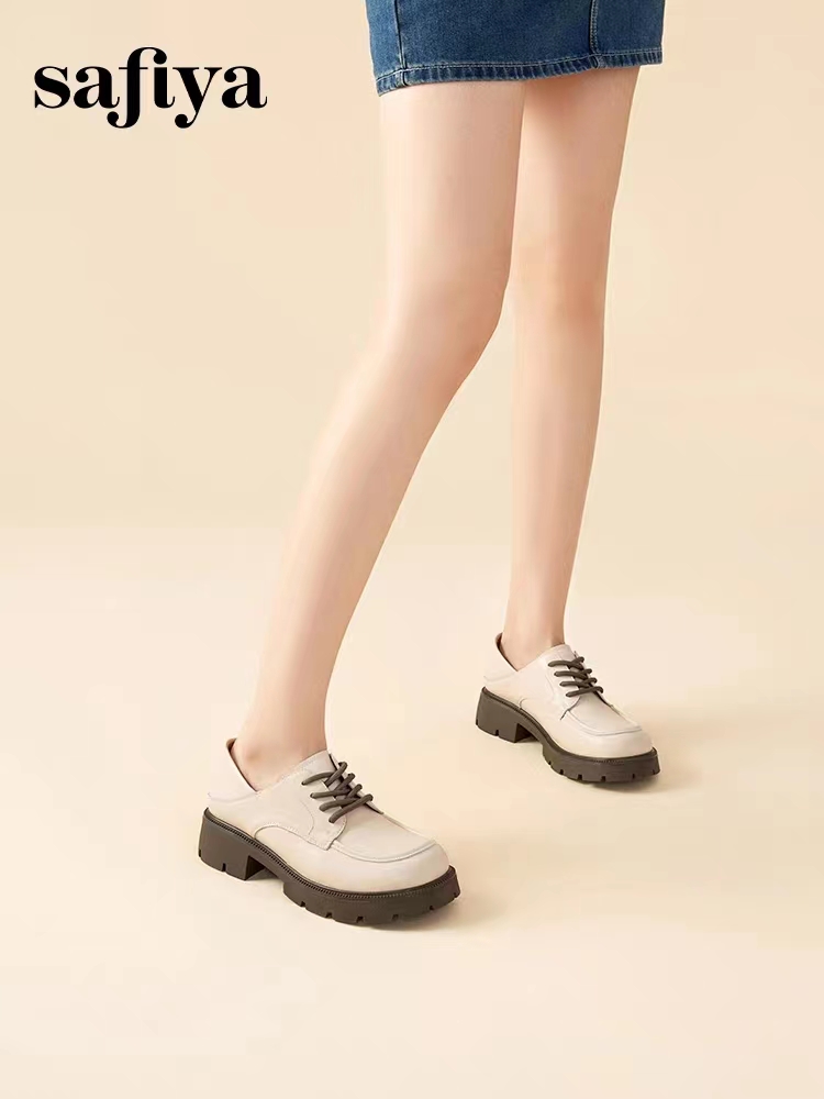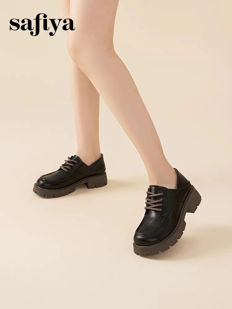 索菲亚2023复古学院风系带圆头英伦厚底女皮鞋