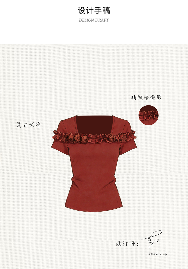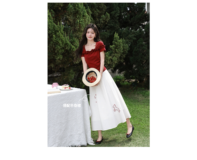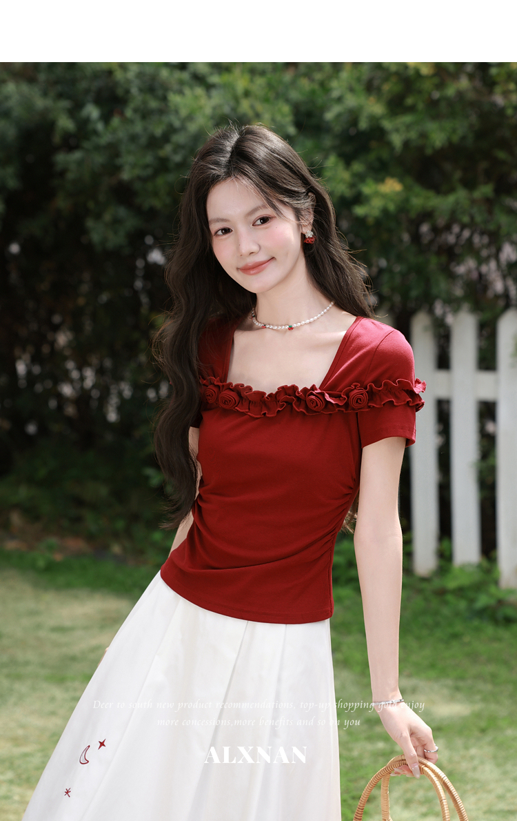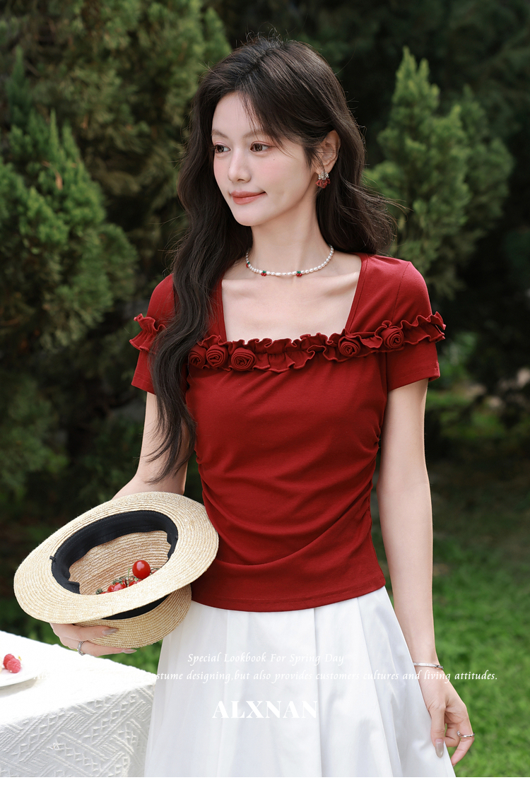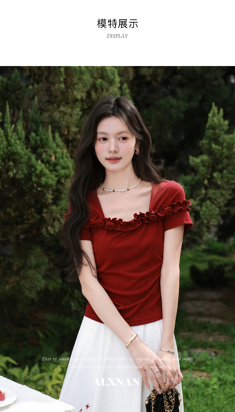 鹿向南「蔓野玫瑰」法式方领红色T恤女夏季新款显瘦气质短袖上衣