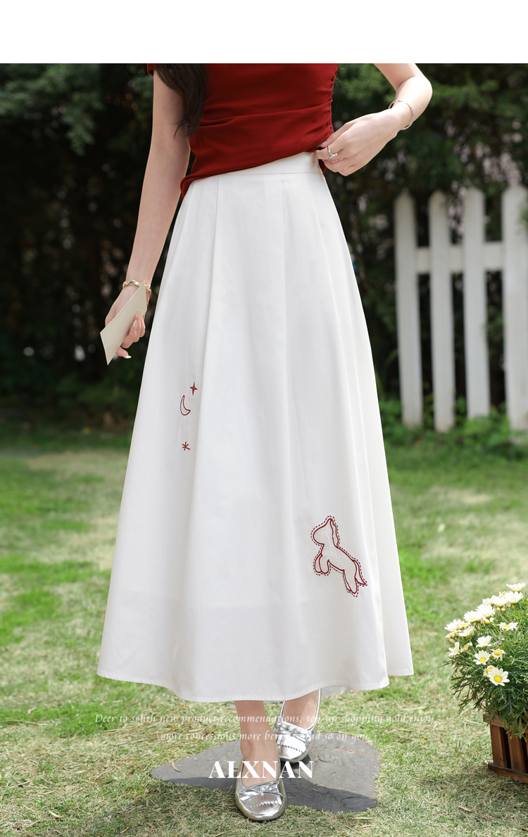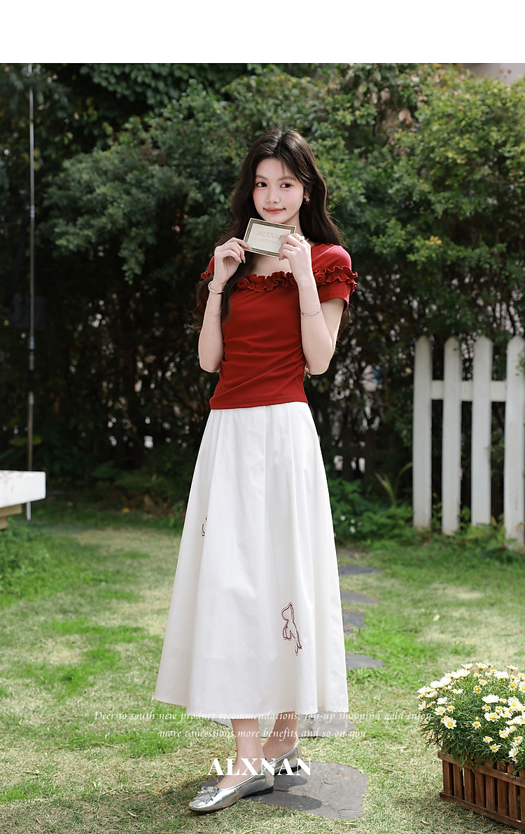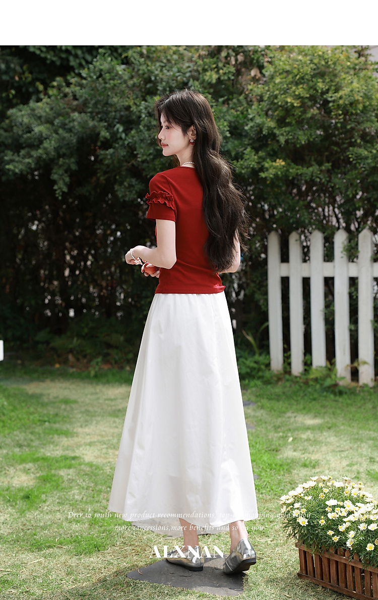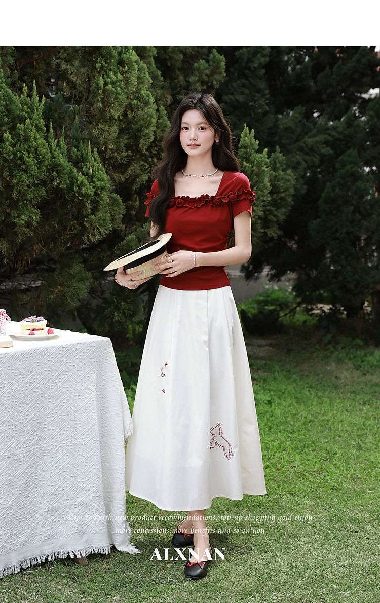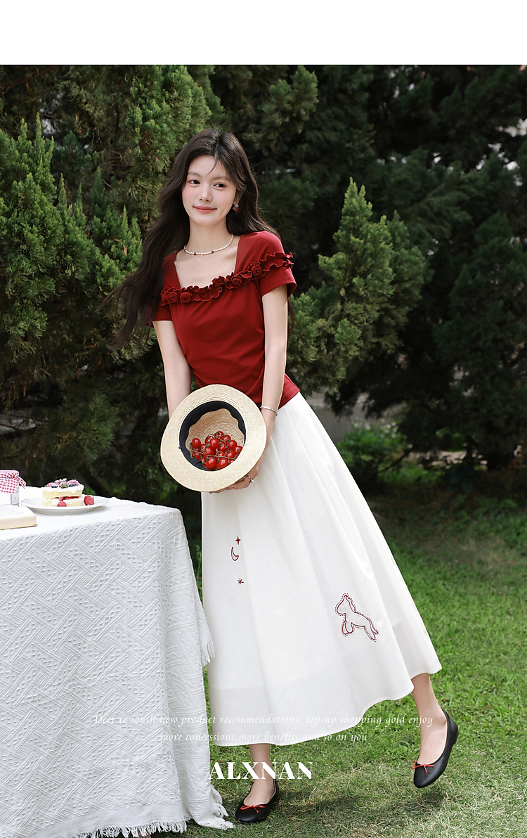 鹿向南「蔓野玫瑰」法式方领红色T恤女夏季新款显瘦气质短袖上衣