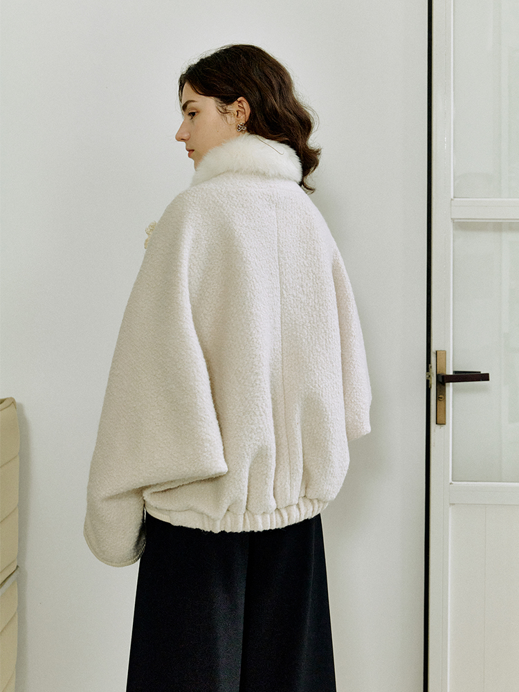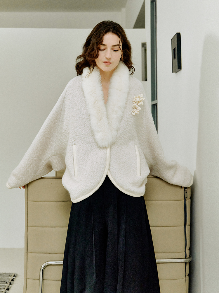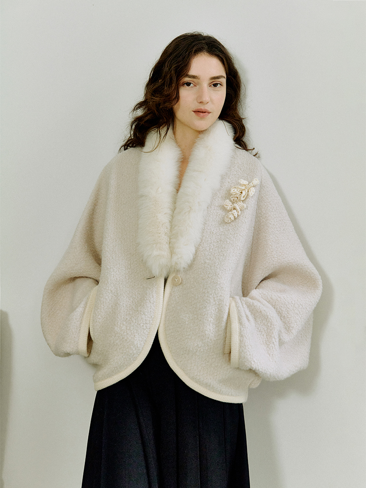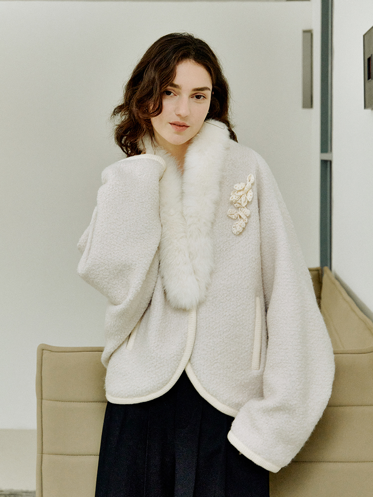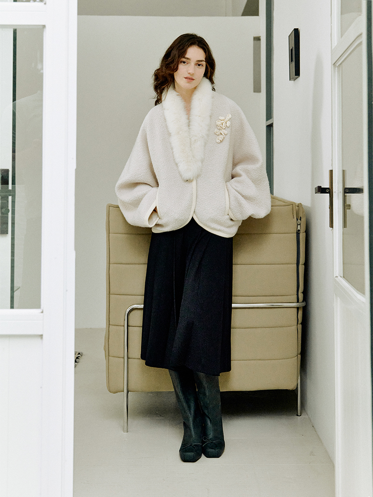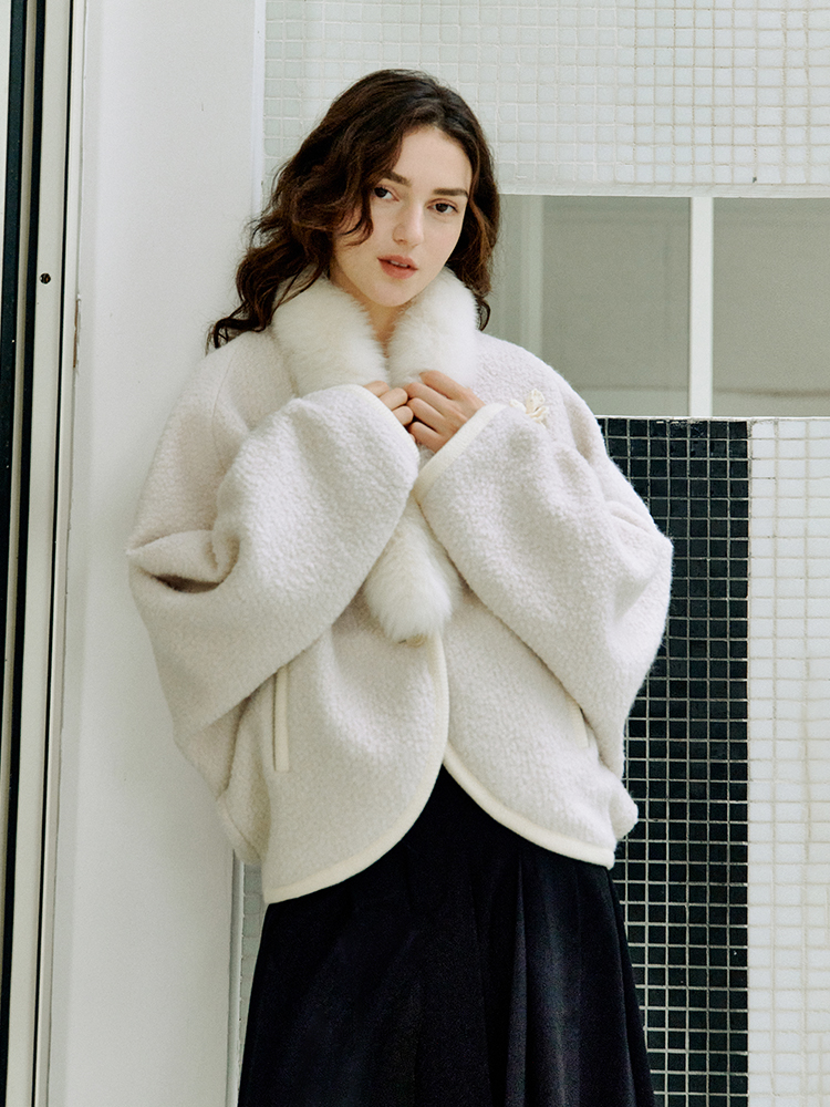 ForPoem 现货 25/FW原创设计圈圈羊毛弧形下摆气质宽松狐狸毛领外套