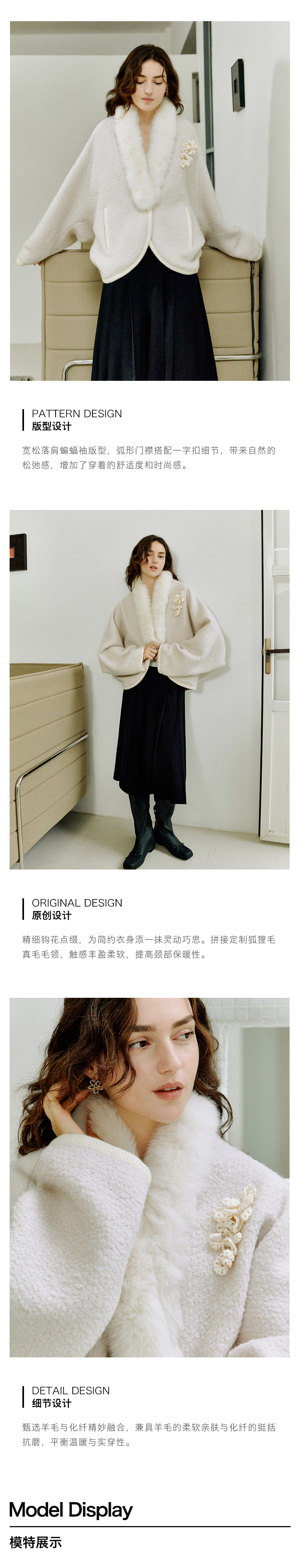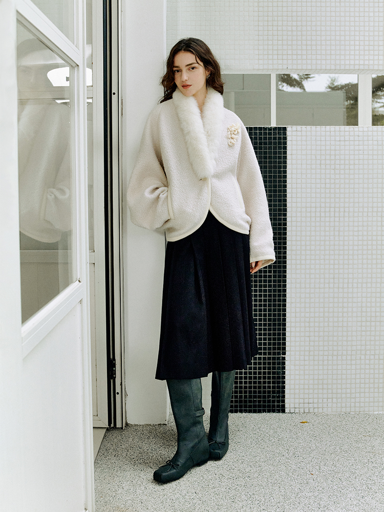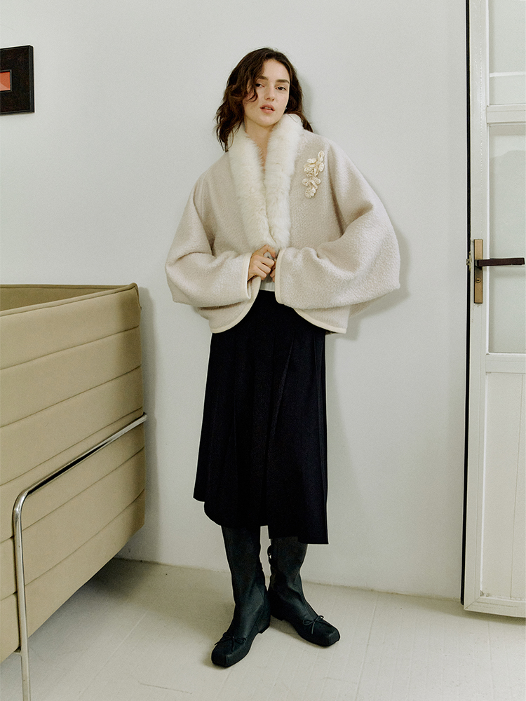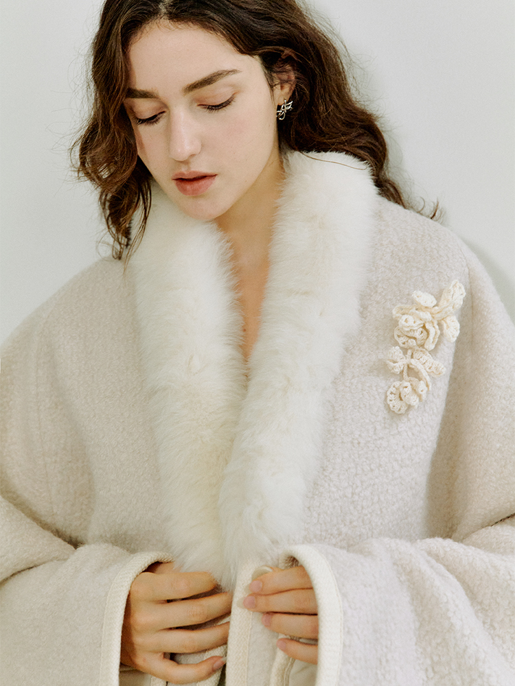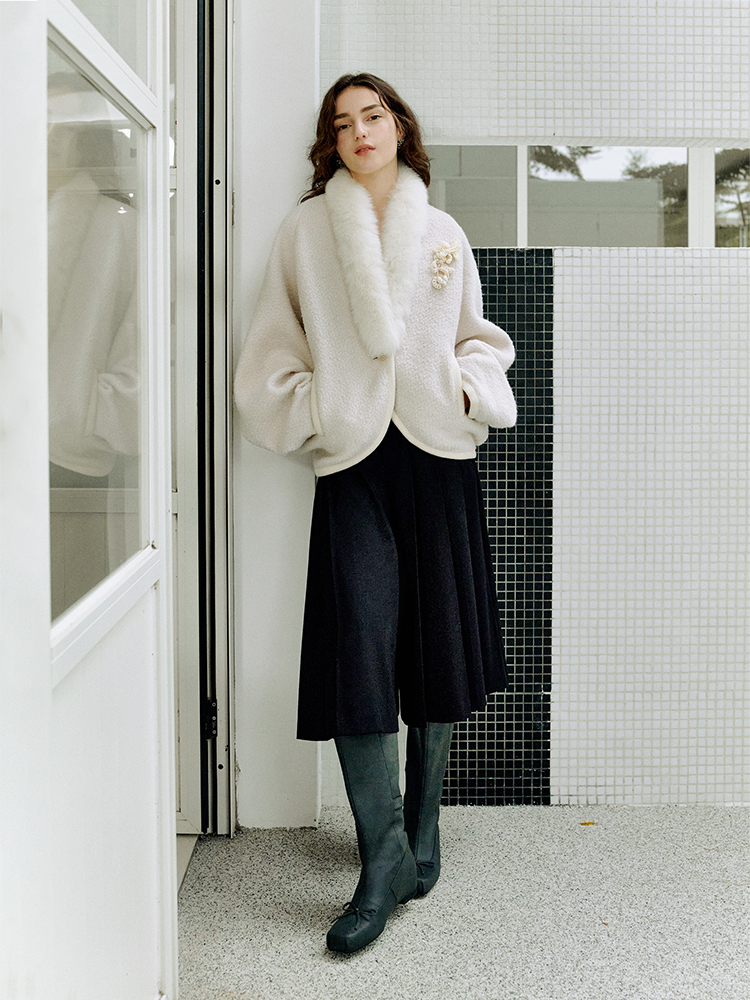 ForPoem 现货 25/FW原创设计圈圈羊毛弧形下摆气质宽松狐狸毛领外套