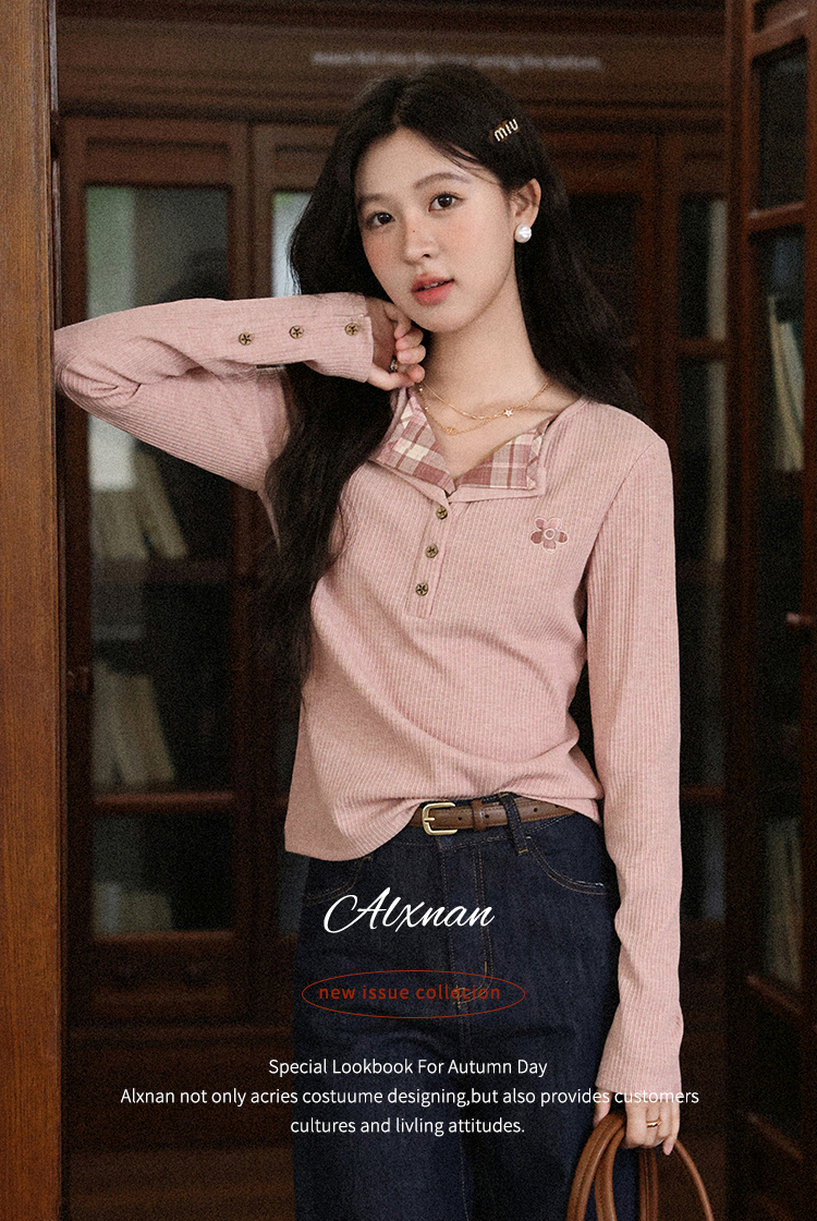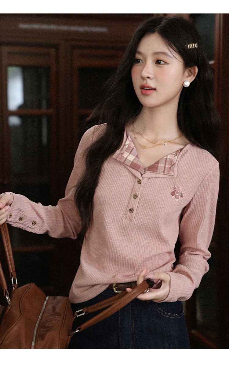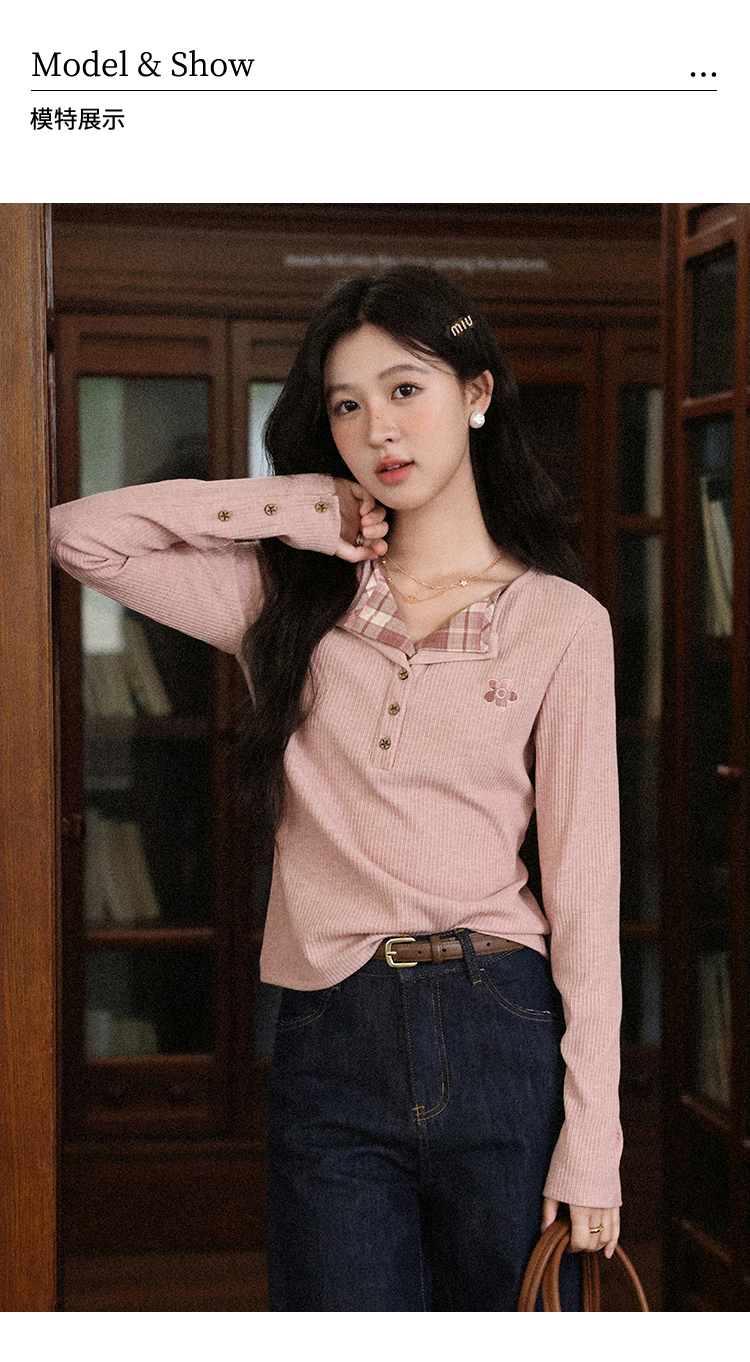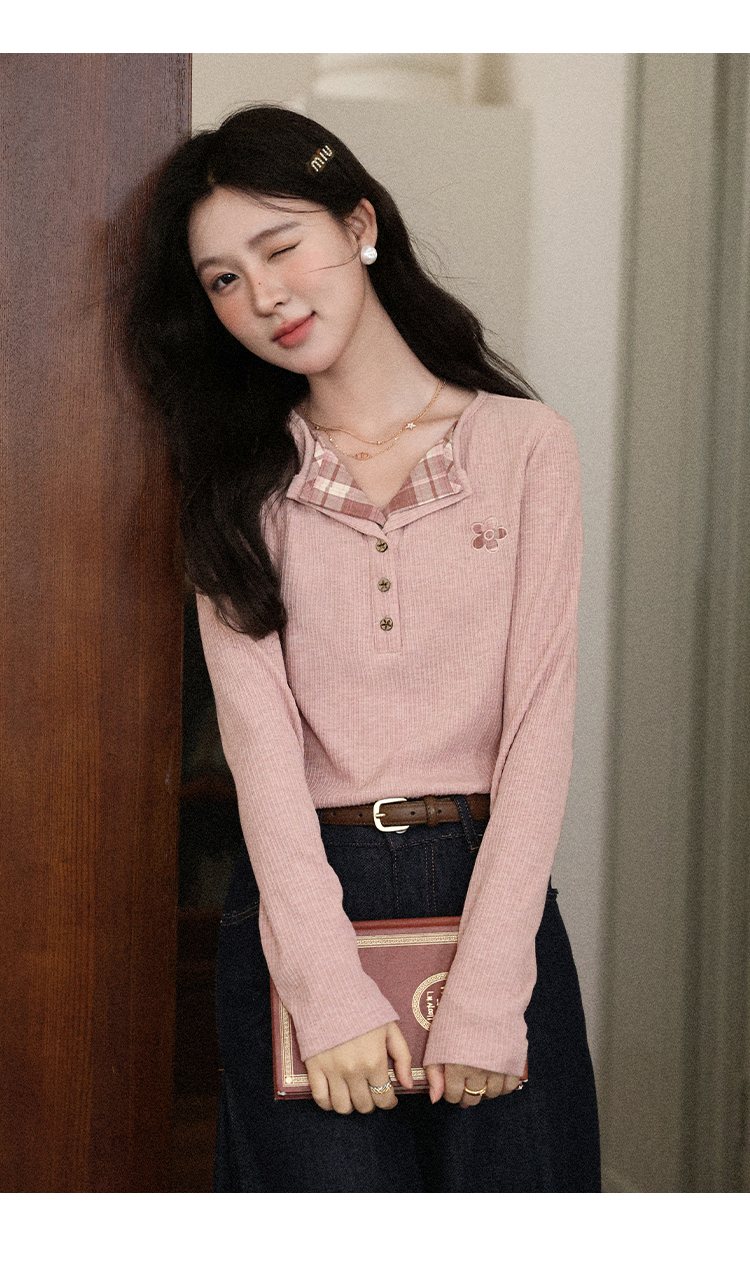 鹿向南「奶芙莓莓」假两件设计感长袖粉色T恤女秋季新款独特上衣