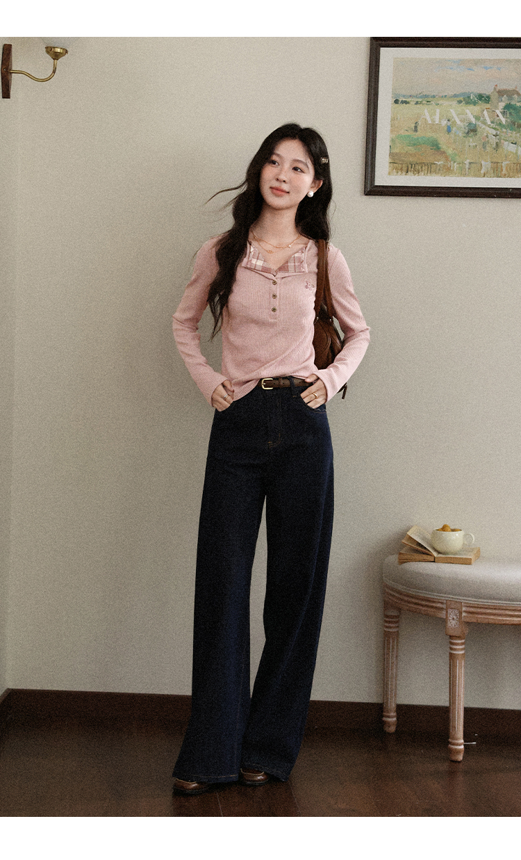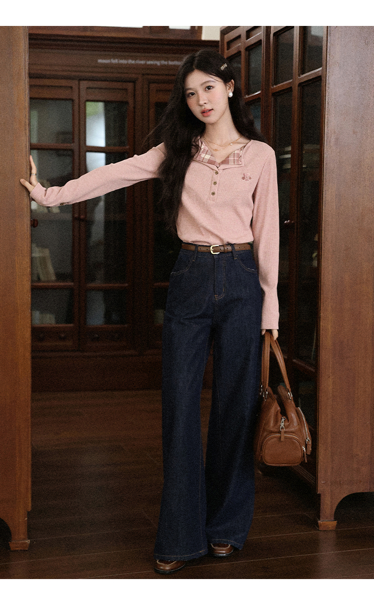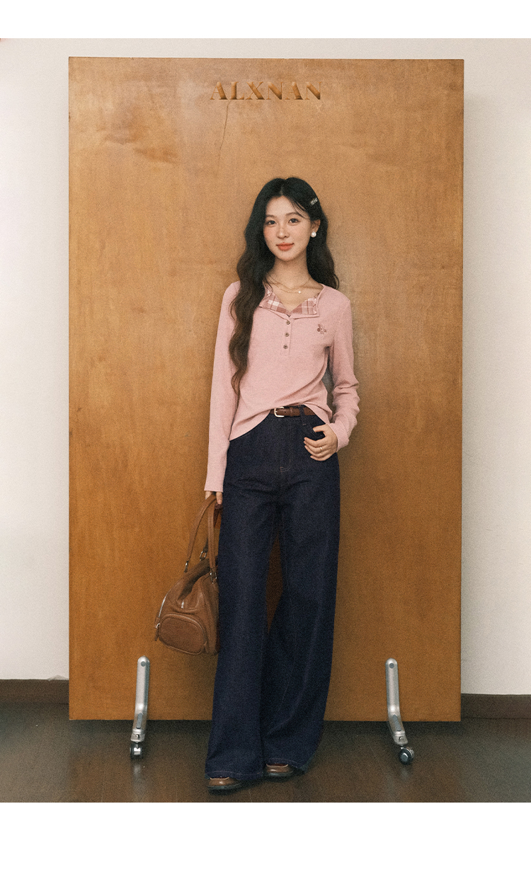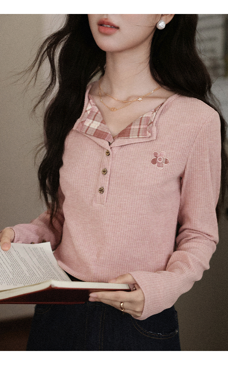 鹿向南「奶芙莓莓」假两件设计感长袖粉色T恤女秋季新款独特上衣
