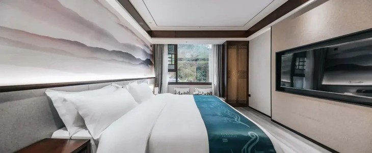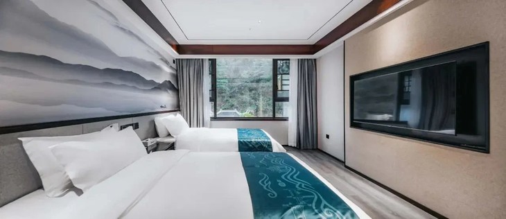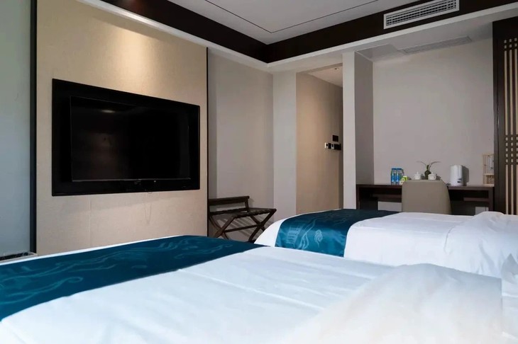 客房面山而筑,晨起窗帘一拉,山景便撞进房间,新鲜空气裹着山林气息涌来,秀丽风光铺满眼帘。房间配套超齐全,衣柜、床头柜收纳日常,中央空调、液晶网络电视、电热水壶备妥便利,24 小时热水淋浴 + 干湿分离卫浴,抽水马桶、毛巾拖鞋贴心候着,把舒适嵌进每一处细节~