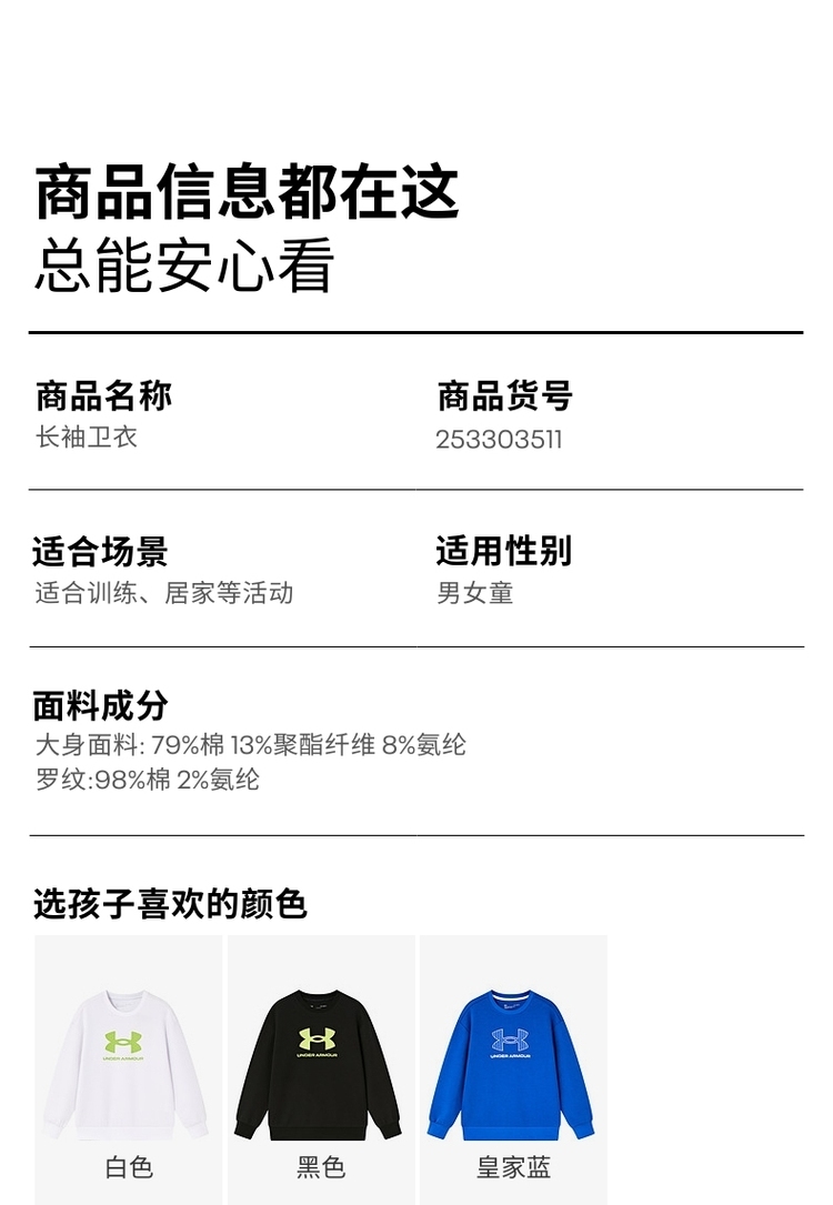 【正品直发】Under Armour安德玛儿童秋冬新款舒适运动套头卫衣251103131/253303704A/253303511【爆款卫衣合集】