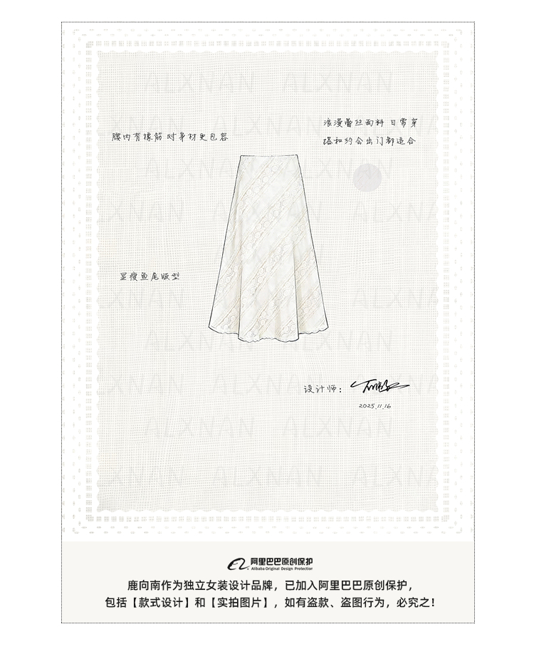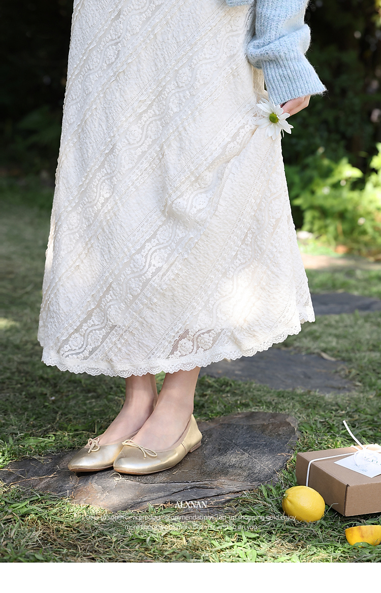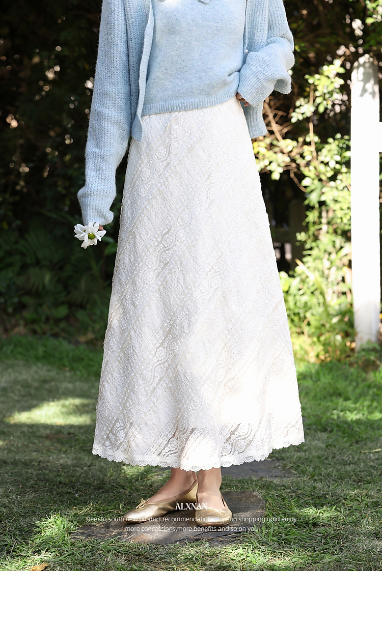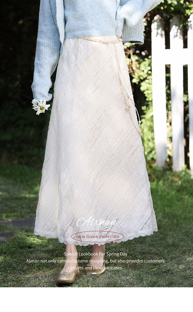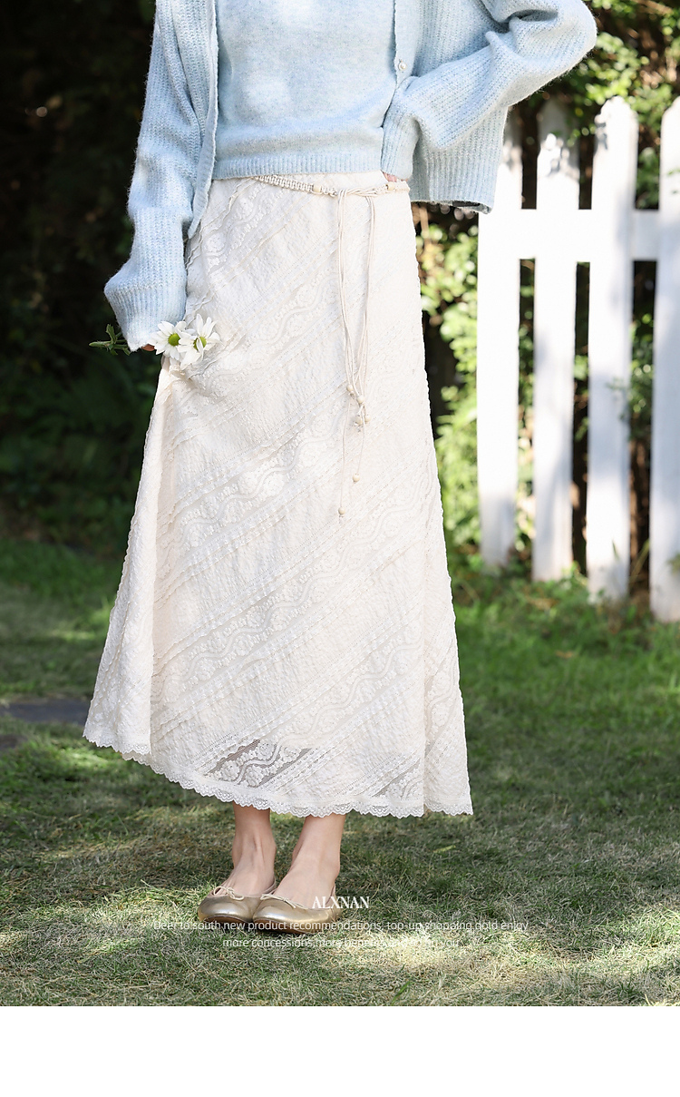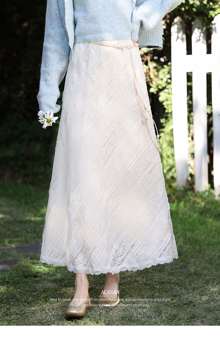 鹿向南「佩里月光」杏色蕾丝花边长款半身裙女春气质显瘦A字长裙