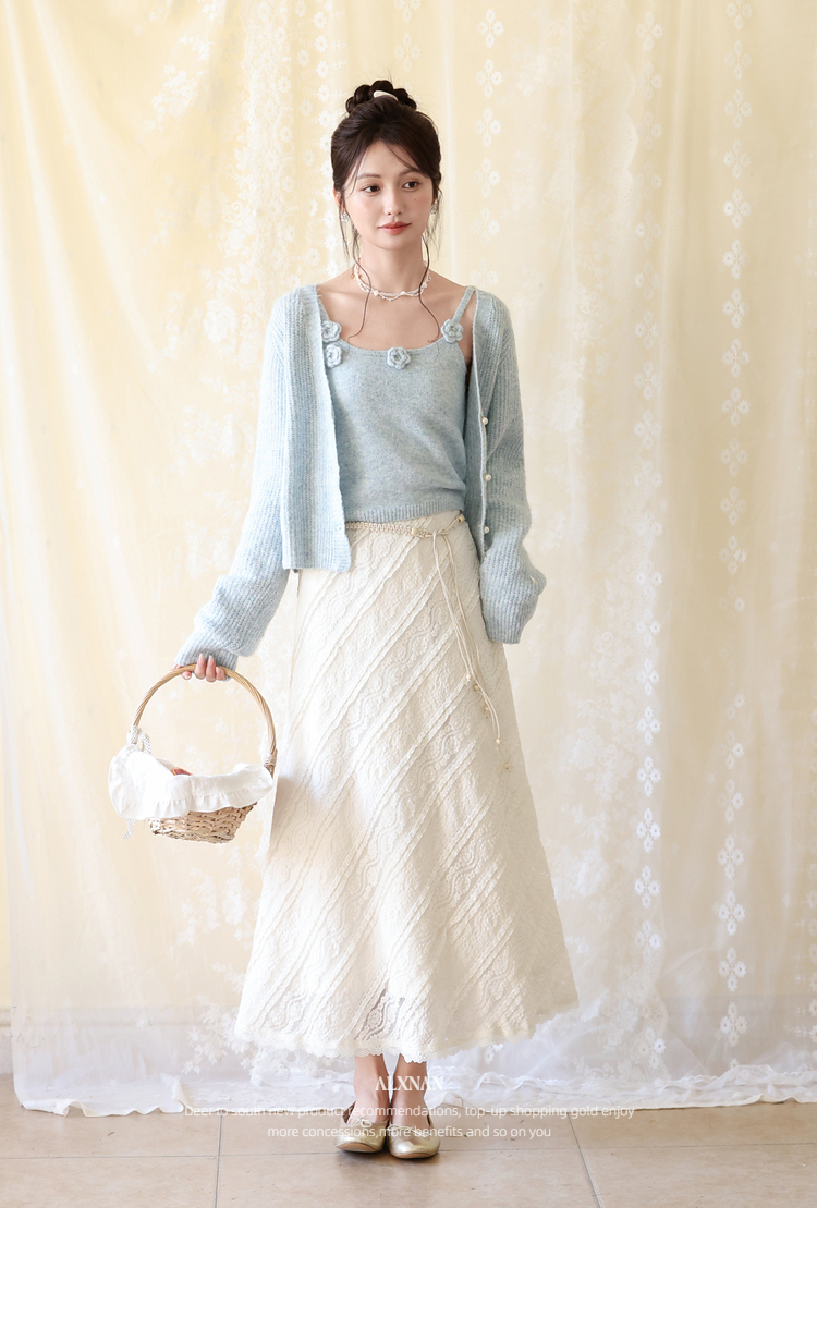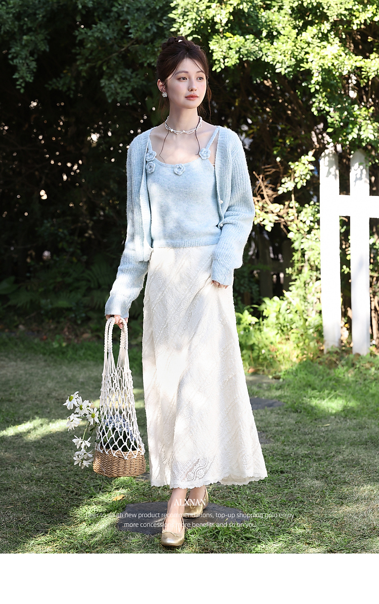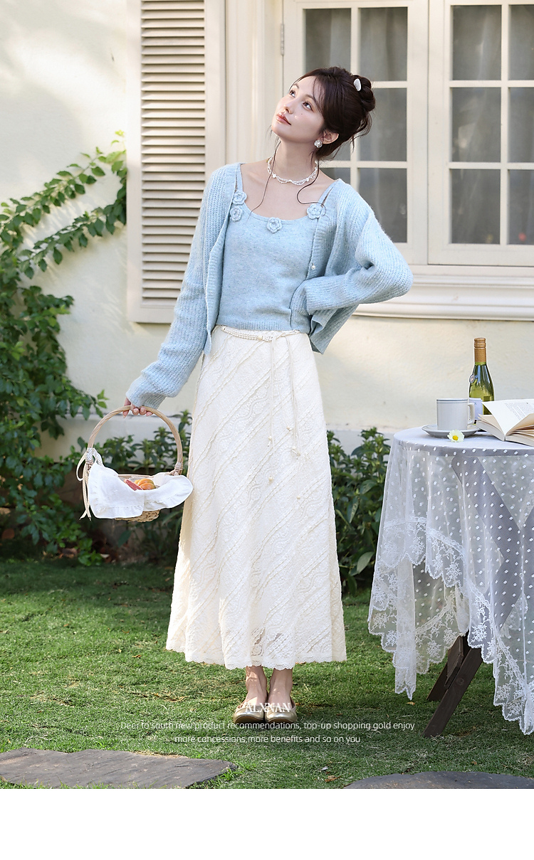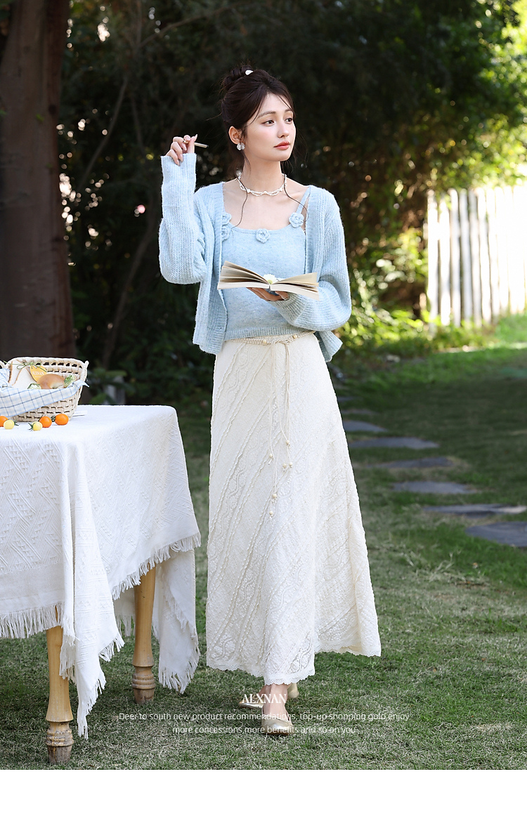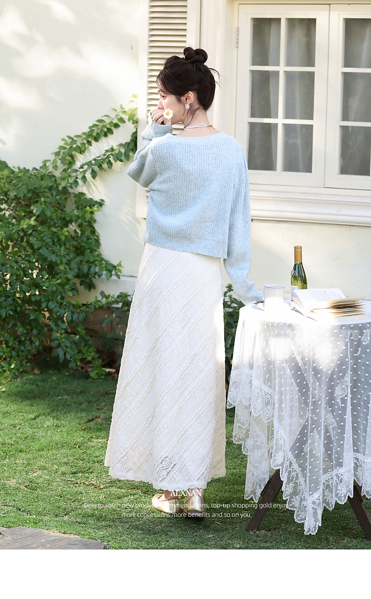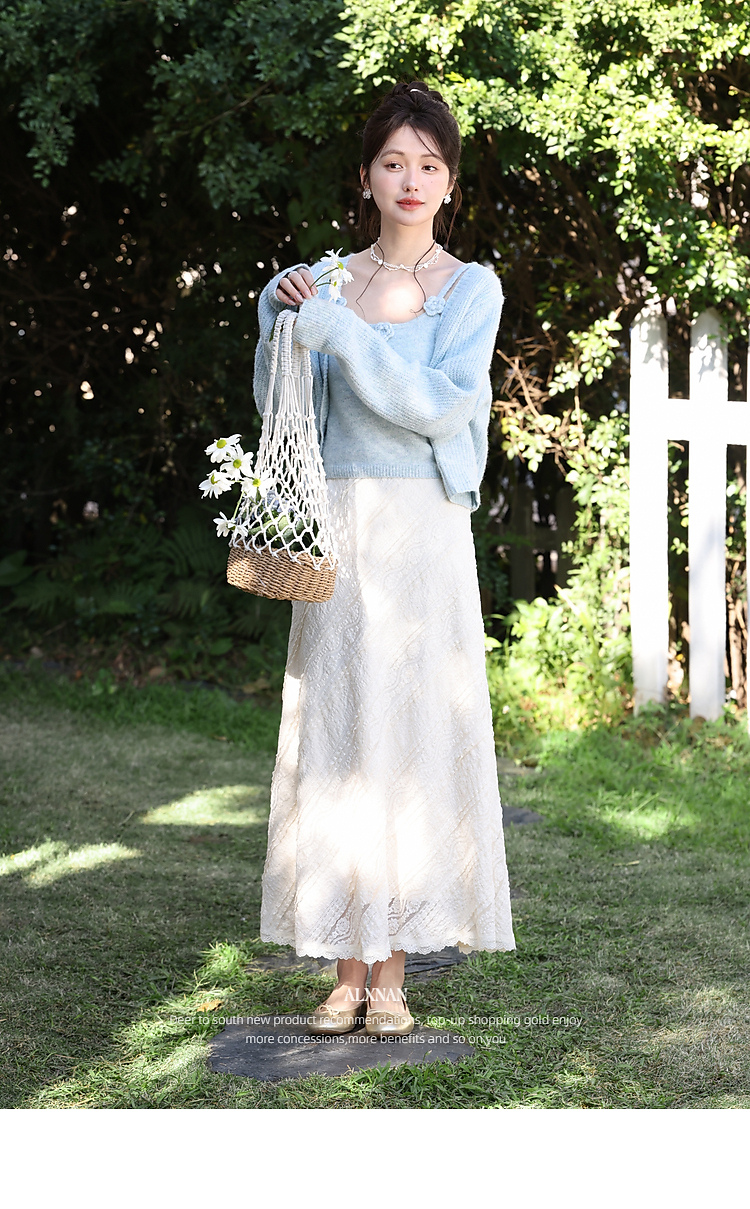 鹿向南「佩里月光」杏色蕾丝花边长款半身裙女春气质显瘦A字长裙