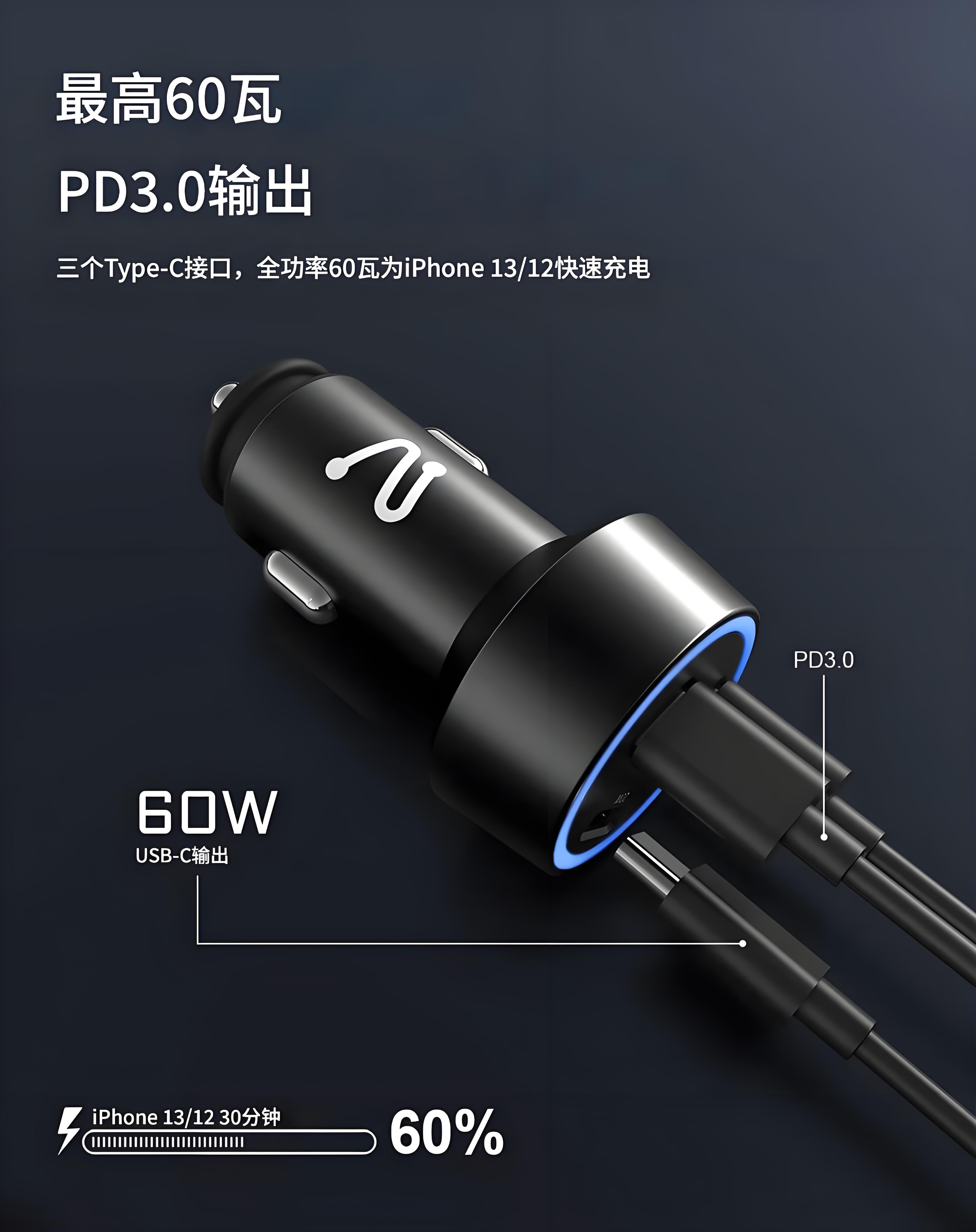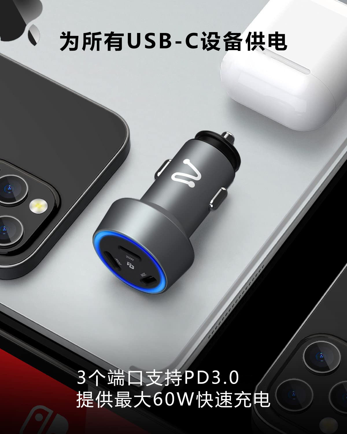 AERGIATECH60W 三端口USB-C车载充电器,适用于iPhone、iPad、三星Galaxy、Pixel等设备。