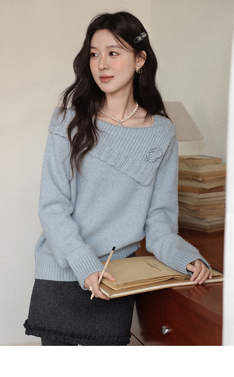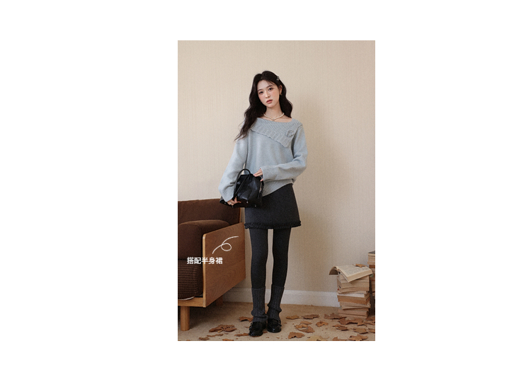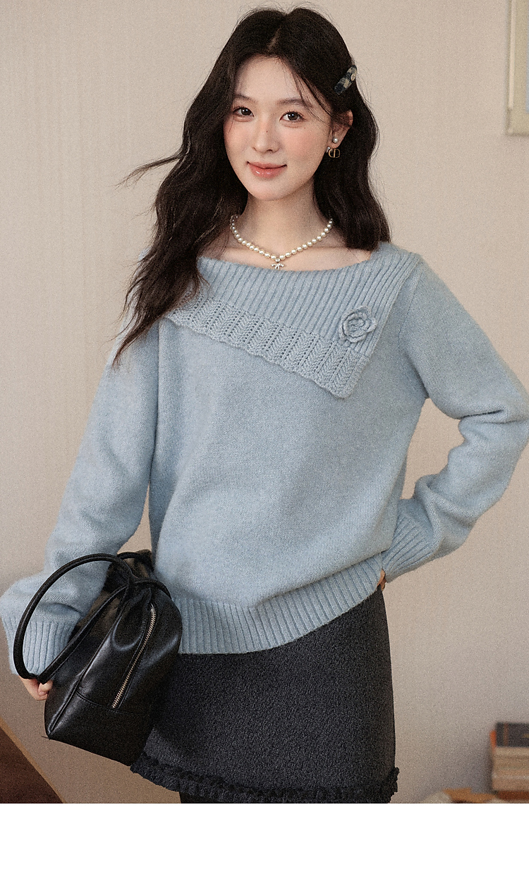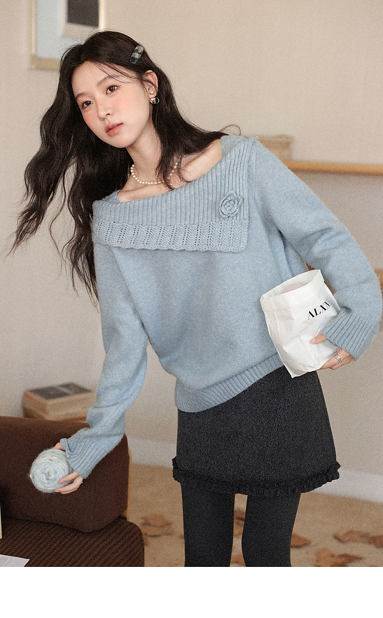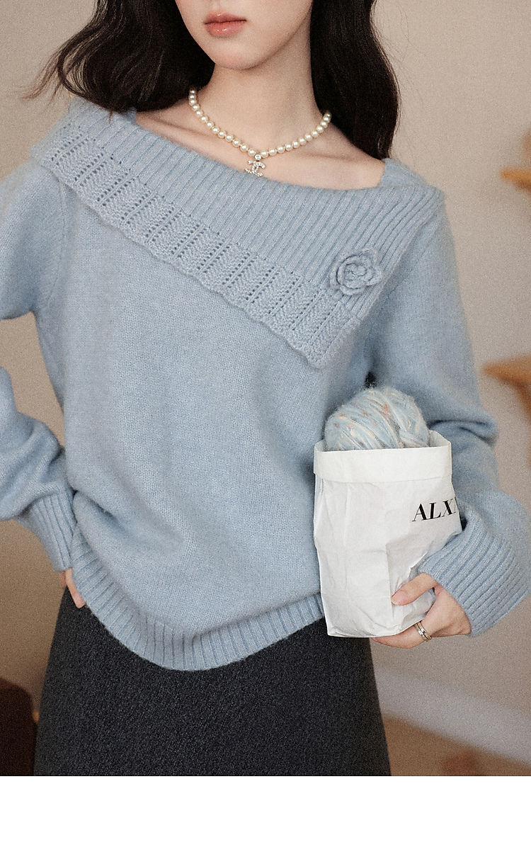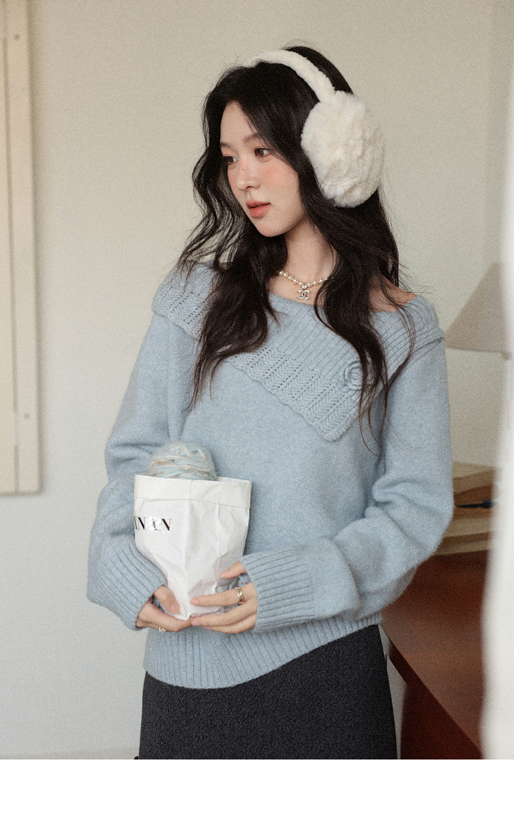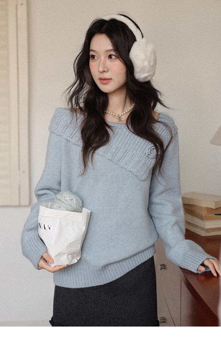 鹿向南「静雨听书」不规则斜肩针织毛衣女秋冬宽松设计感蓝色上衣
