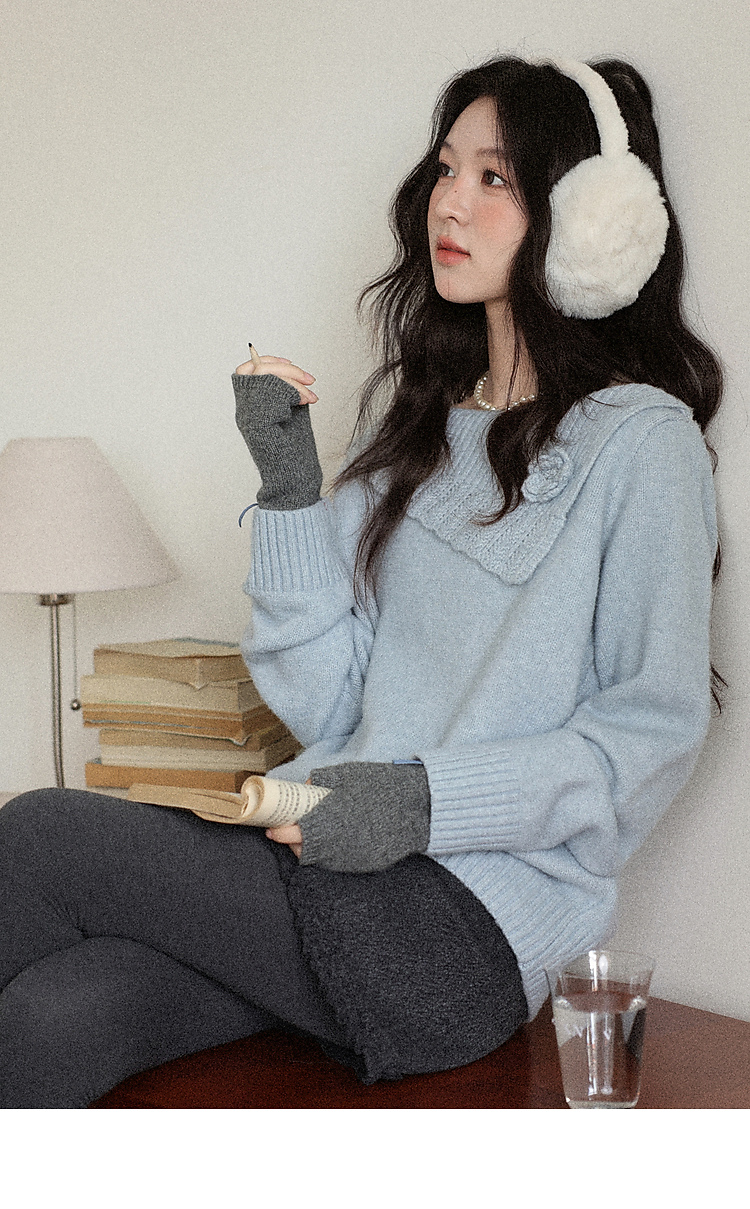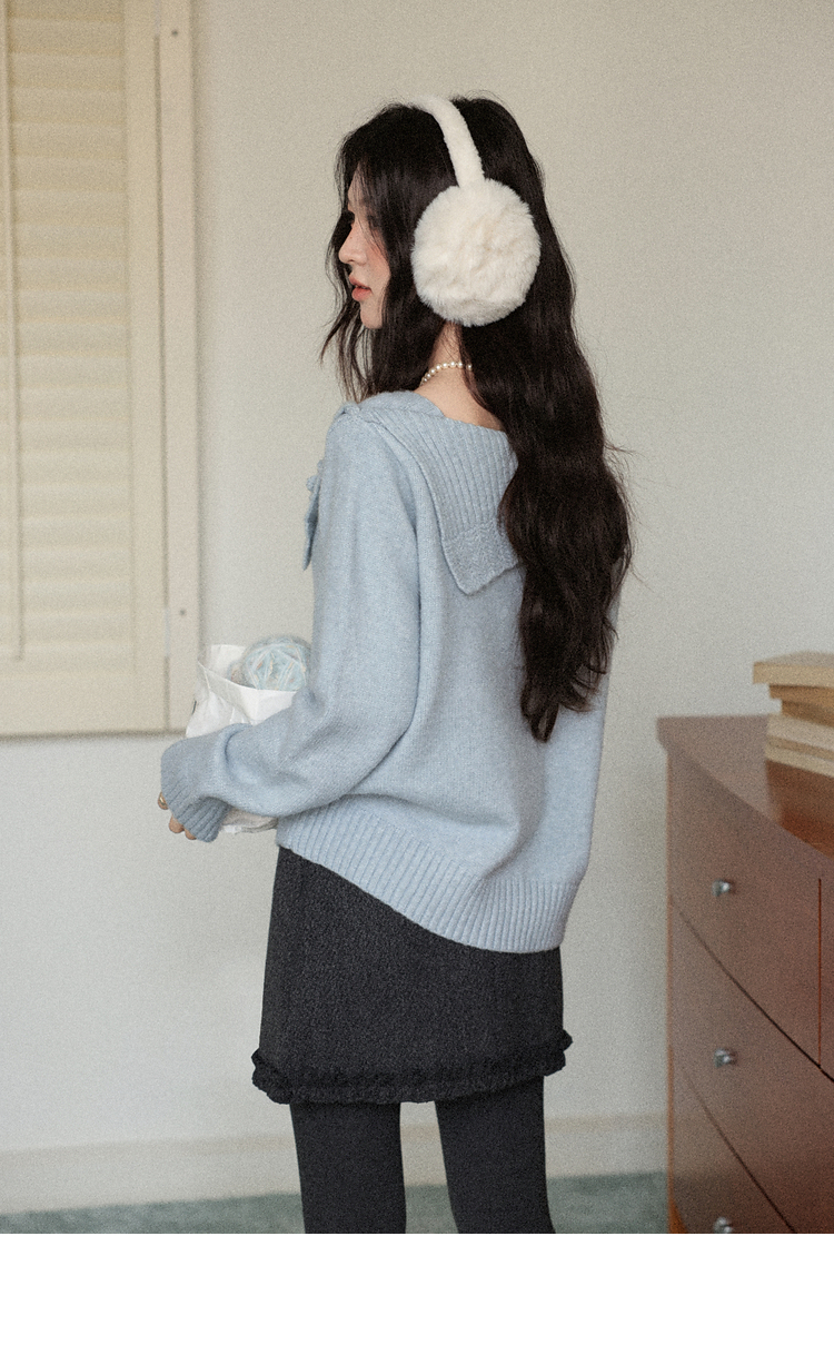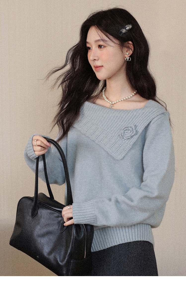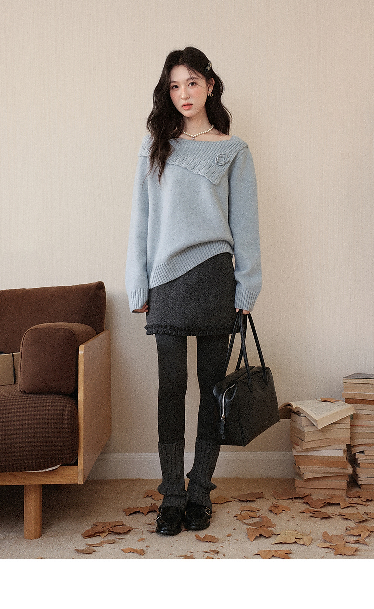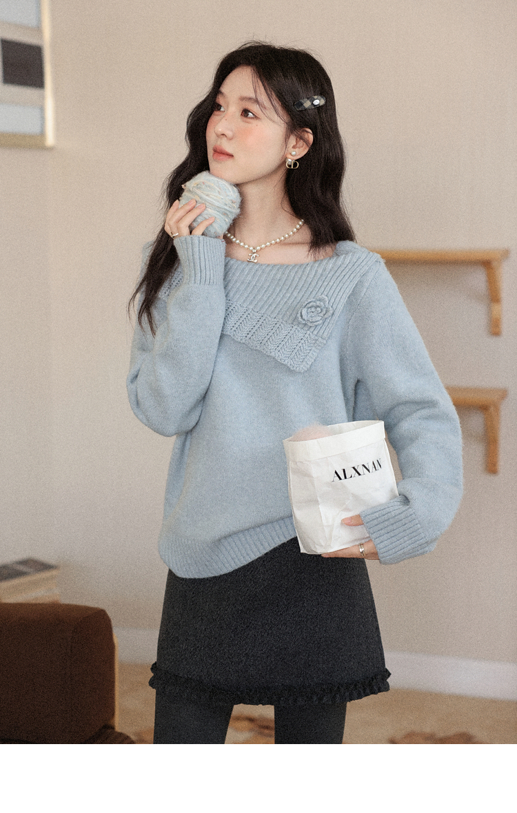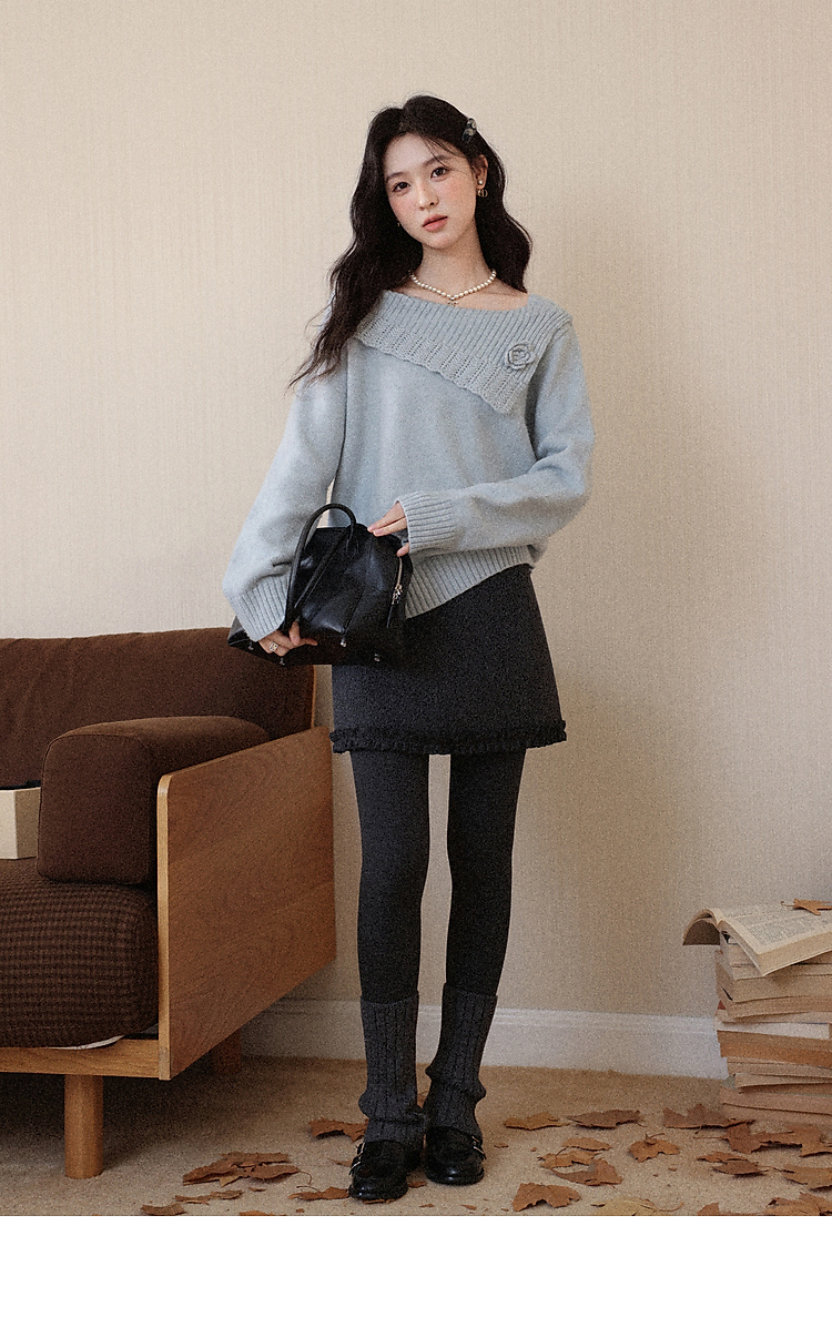 鹿向南「静雨听书」不规则斜肩针织毛衣女秋冬宽松设计感蓝色上衣