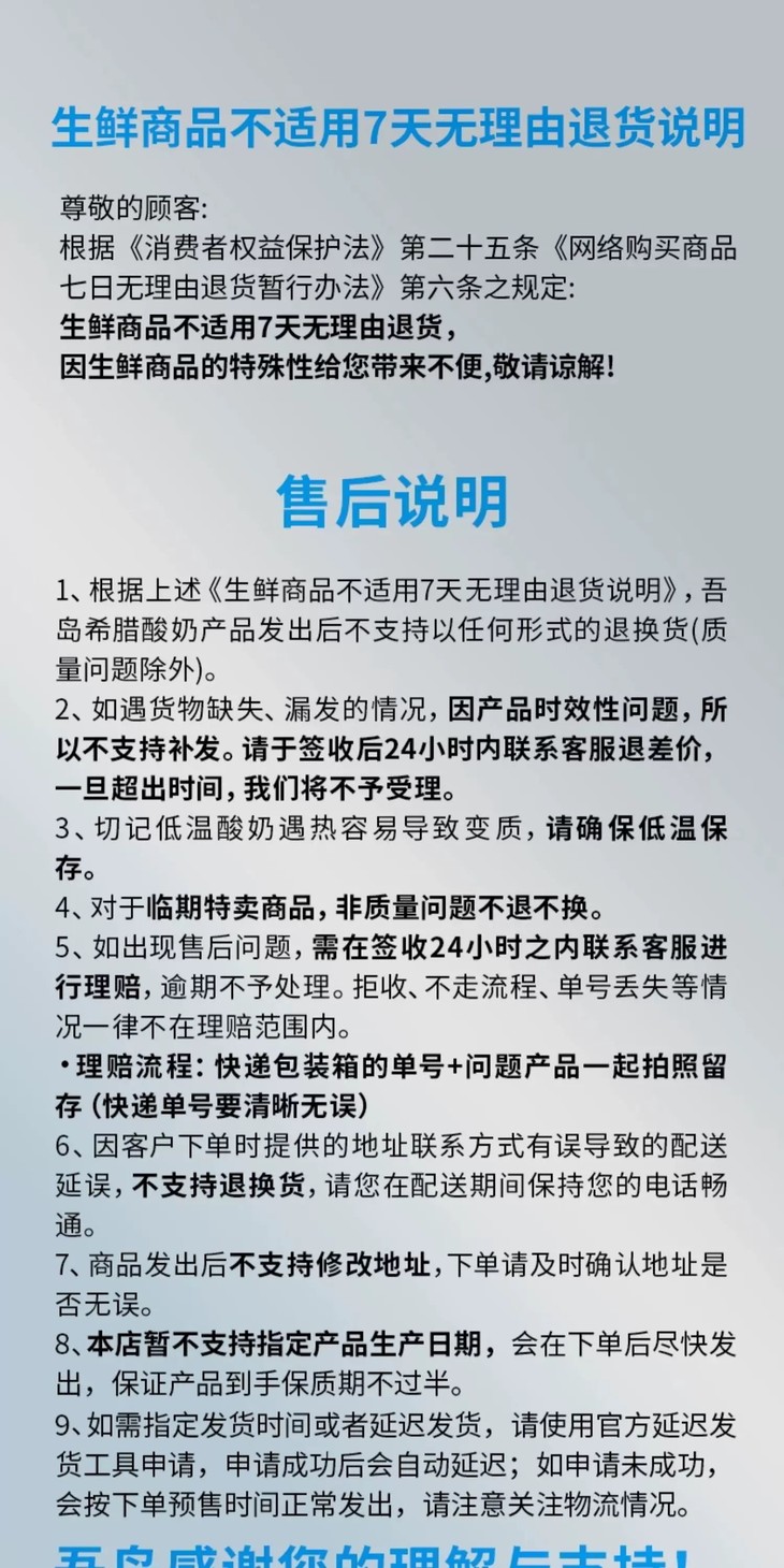 ✨吾岛酸奶✨ 【品牌】吾岛 【产地】河北·邯郸 【发货地】北京/苏州/武汉 【发货包装】冷链塑封 【发货时效】3-7天 【保质期】 普通酸奶28天保质期 希腊70g/100g/720g酸奶36天保质期 (无蔗糖希腊720g为28天保质期) 格兰诺拉谷物包270天 【发货快递】顺丰/京东冷链 【固定不发货区域】海南 新疆 西藏 青海 宁夏 内蒙古 甘肃 【提示】生鲜件时效要求高,乡镇地区时效不保,无法发货,乡镇区域慎拍 【关于售后退换问题】 1)生鲜产品不支持7天无理由退换货,特殊问题联系售后处理 2)产品售出不支持拒收,若无理由拒收快递,不与售后! 3)签收立即验货,如有问题,立即售后,务必提供【快递面单图,快递包装图,产品问题图】要拍清晰,保留好凭证。(未提供凭证或超过24小时售后时效,不予处理!) 4)全程冷链运输,但由于快递、天气等原因,收到商品如有乳清析出属于正常现象,不影响酸奶品质,可放心食用。 5)如有签收问题造成的变质(如快递员一天以上无法联系到收件人、或通知取件后多日未签收导致产品变质等),不在售后范围内。" 【是否支持七天无理由】不支持 【拦截费用】不支持拦截 快递宝贝长途跋涉,不能保证产品在运输途中完好无损,冰袋融化无冷感,或是外包装破损,但不影响食用哦,不在售后范围内,我们会尽力用专业防震包装保护商品,介意的亲们请慎拍; ⚠️⚠️⚠️不售后:泡沫箱破损内物完好不售后;失温/解冻/漏气,不售后; ⚠️⚠️⚠️生鲜类产品不支持拒收,拒收不售后,并扣除运费及拒收导致的货损费用。