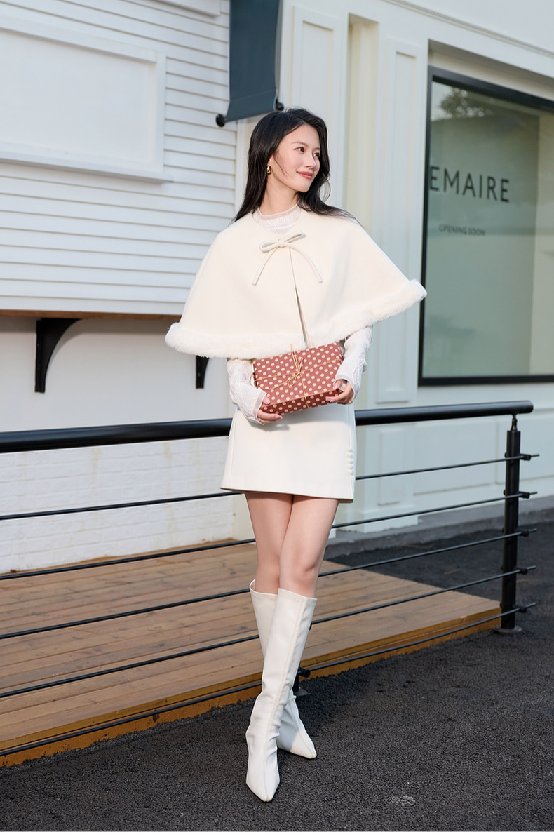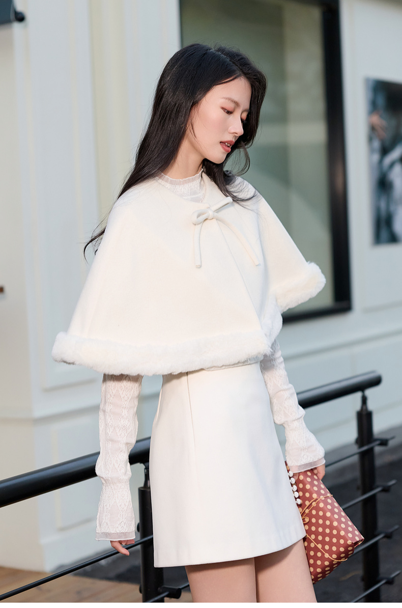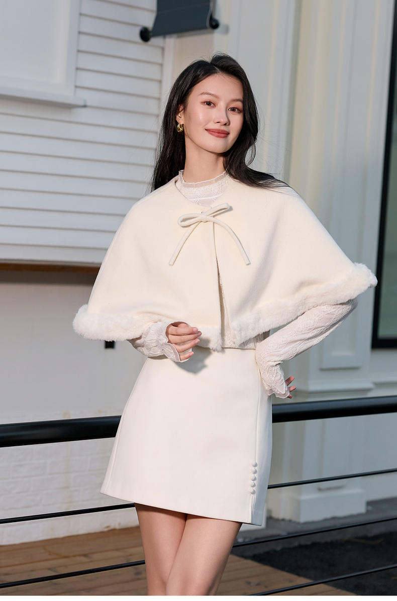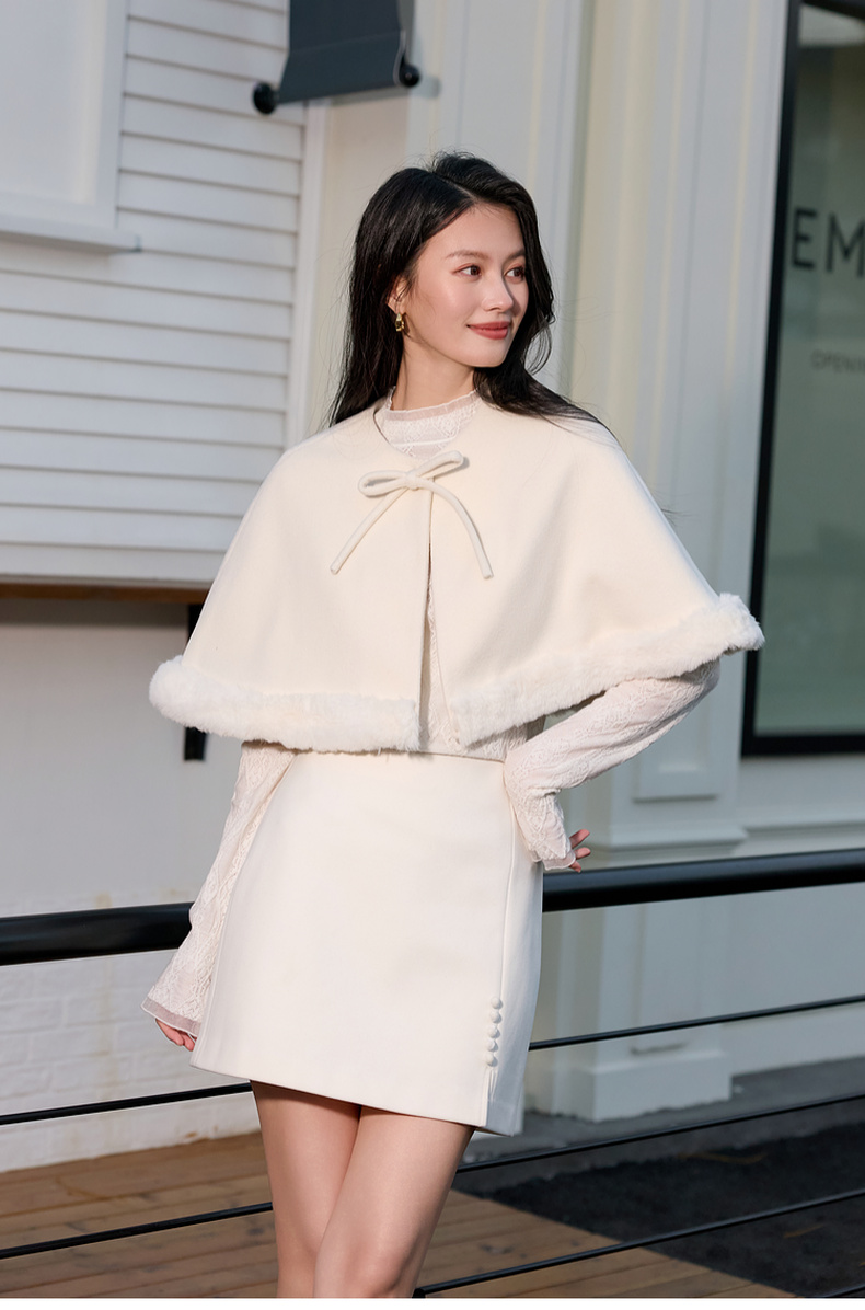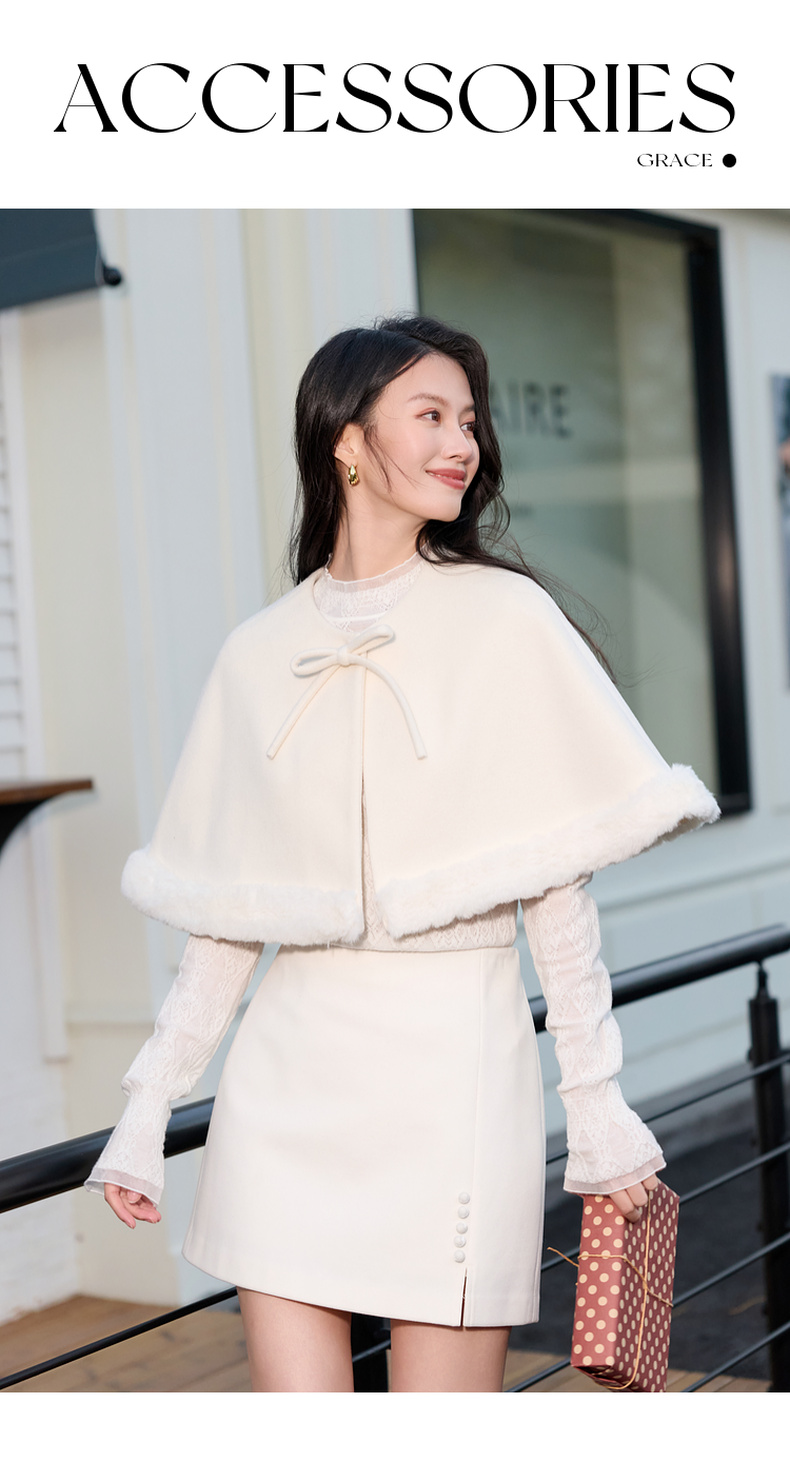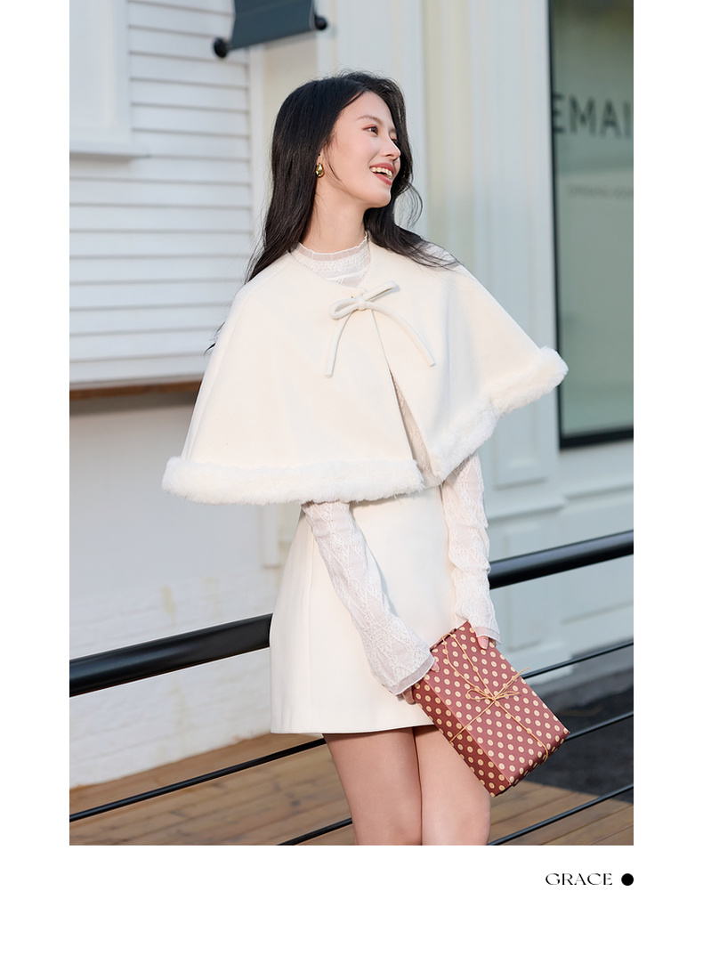 三彩2026新款千金风小披肩毛呢外搭氛围毛绒边坎肩蝴蝶结通勤约会