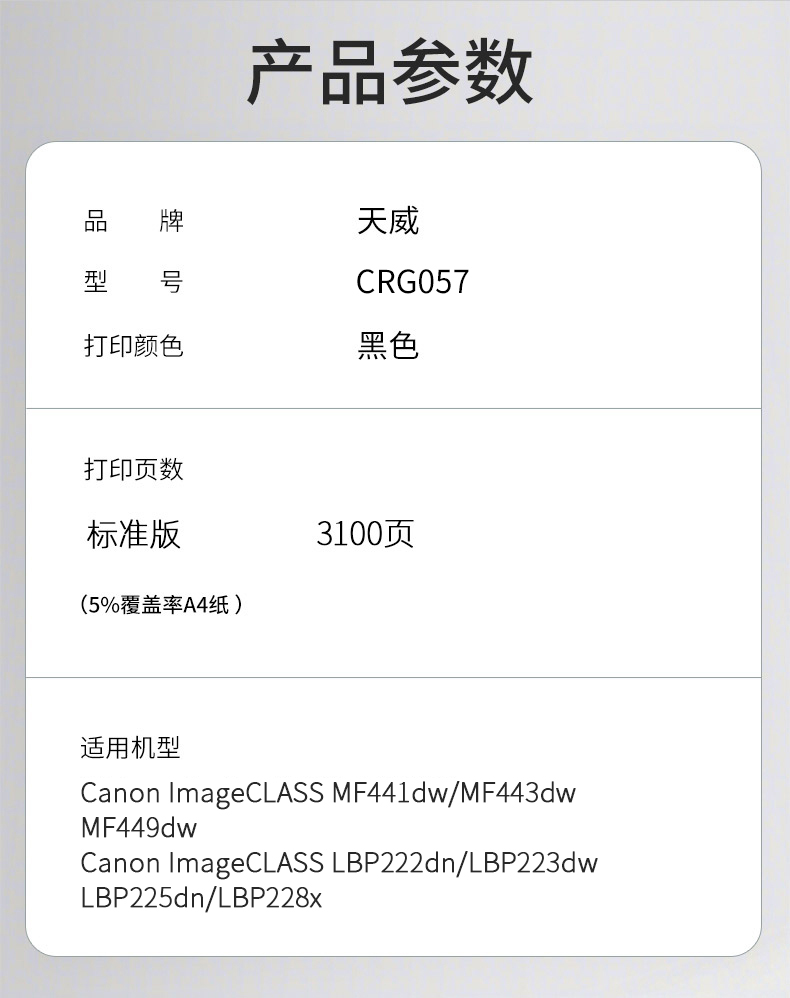 天威 CRG-057硒鼓 适用佳能MF441dw MF443dw MF449dw LBP222dn LBP223dw LBP228x打印机墨粉盒