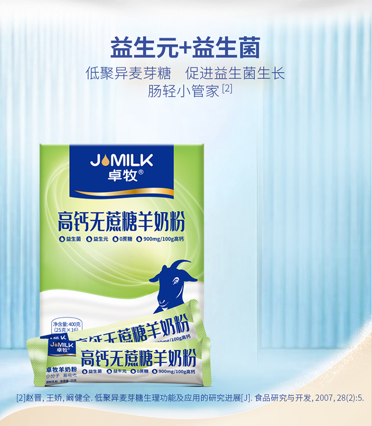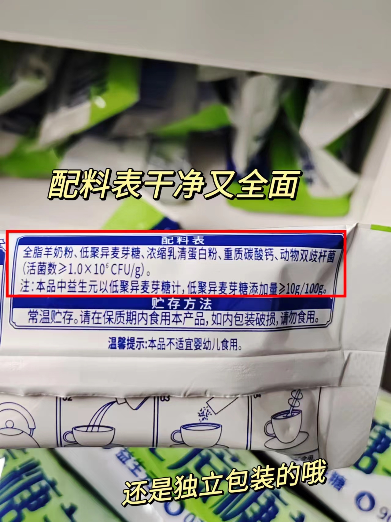 【成分】全脂羊奶粉、低聚异麦芽糖、浓缩乳清蛋白粉、重质碳酸钙、动物双歧杆菌 (活菌数≥1.0x10⁶CFU/g)。