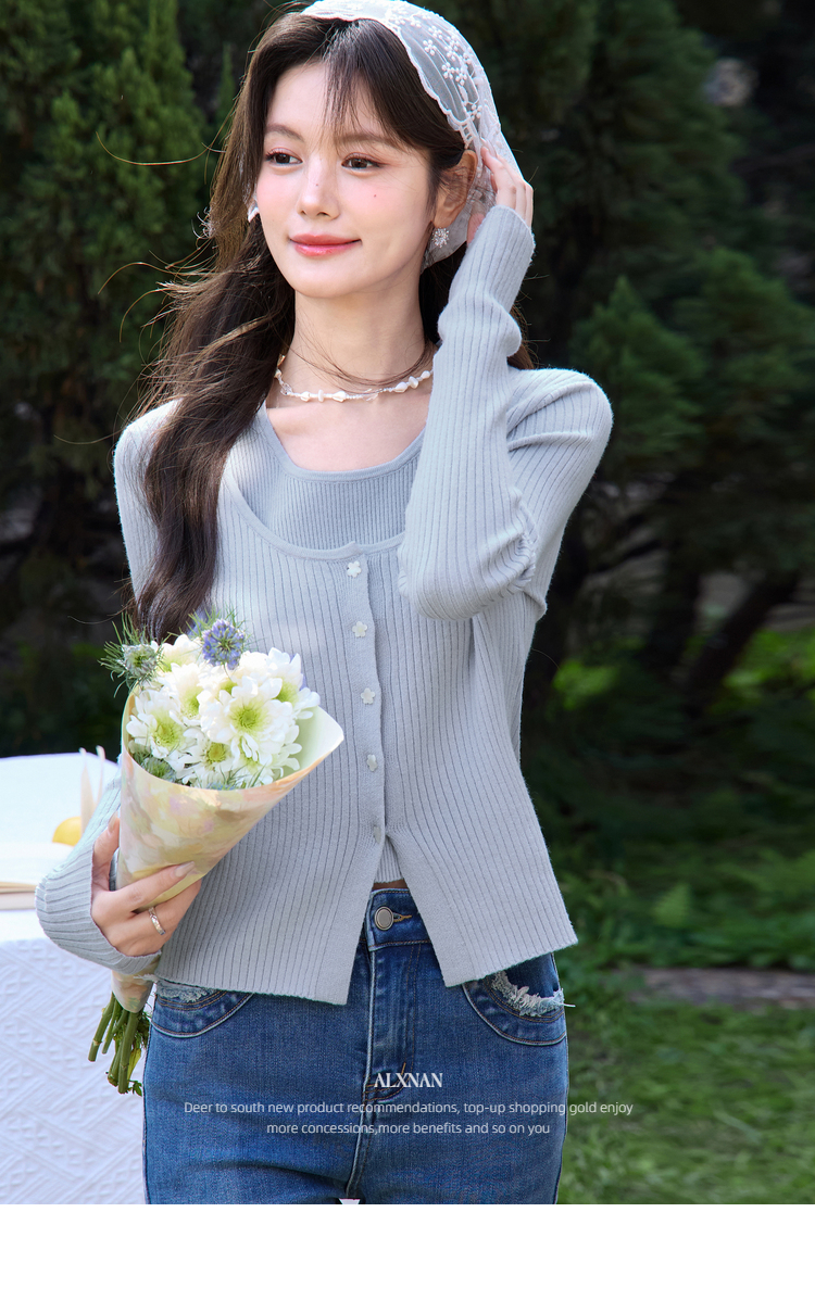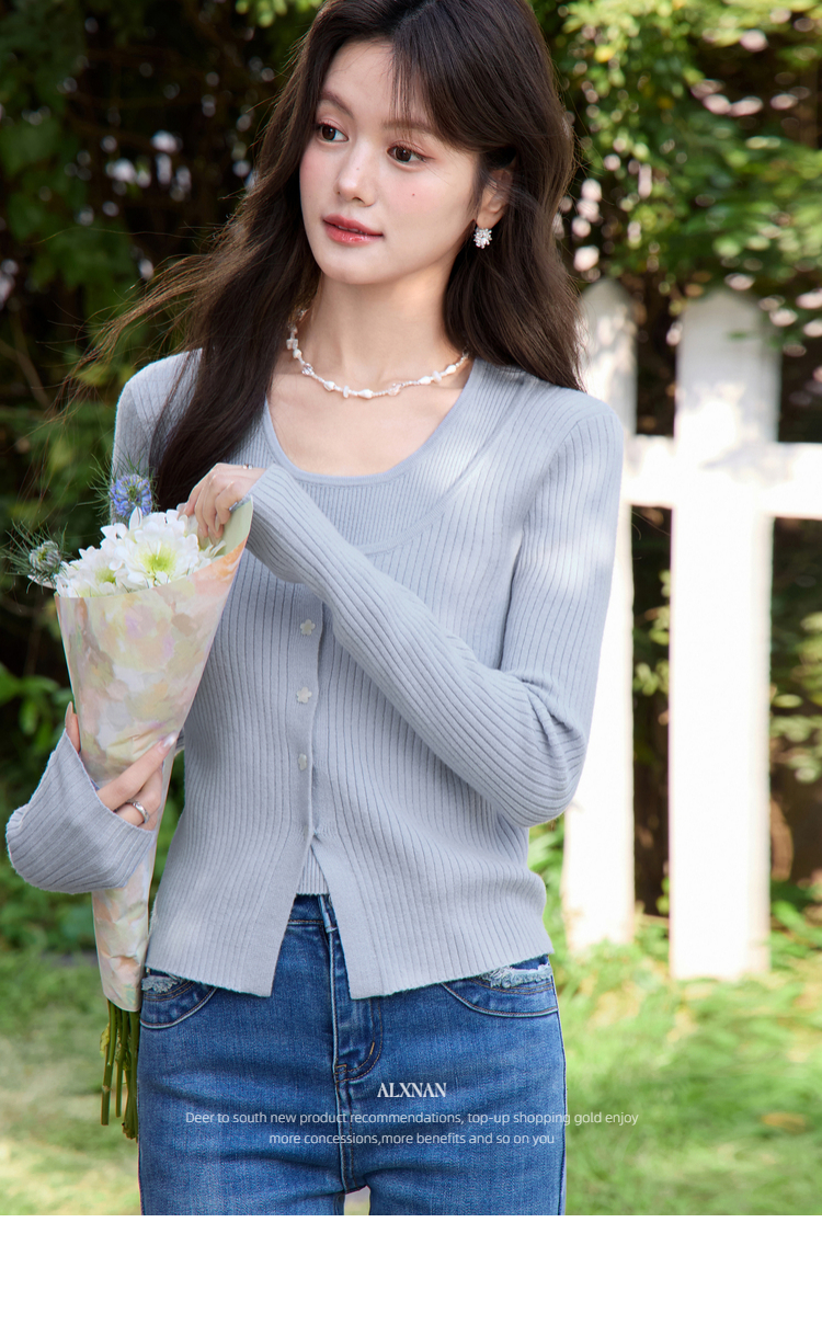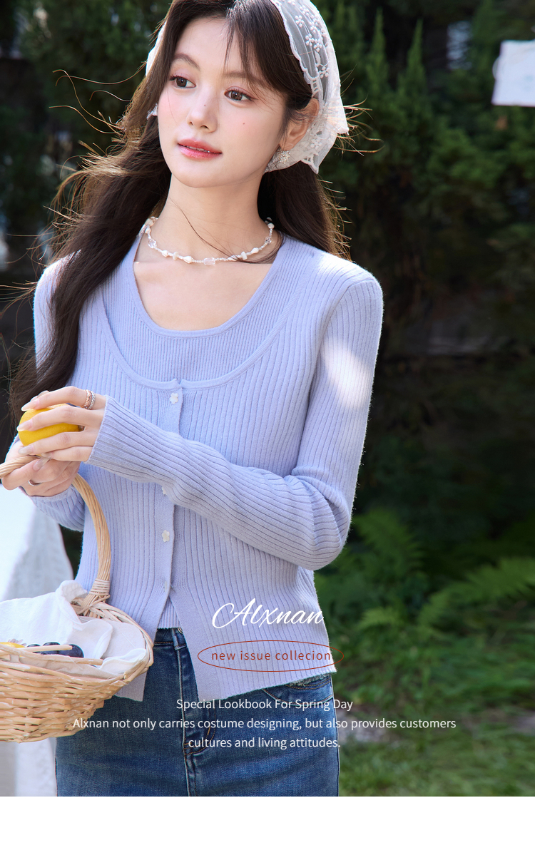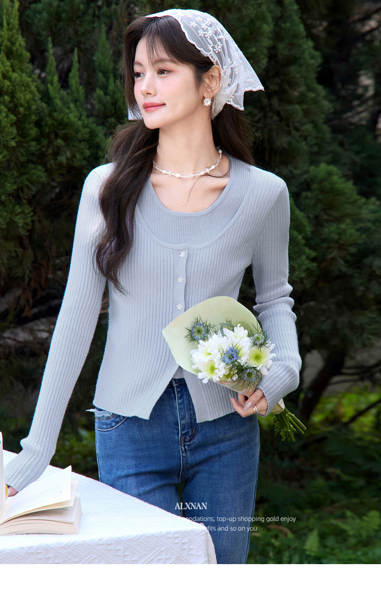 鹿向南「花开香气」浅蓝色假两件设计感针织衫女春季显瘦长袖上衣