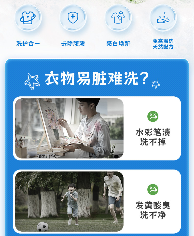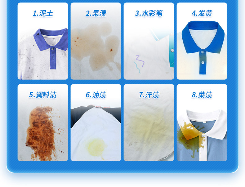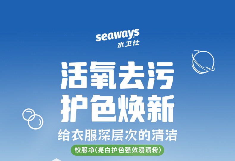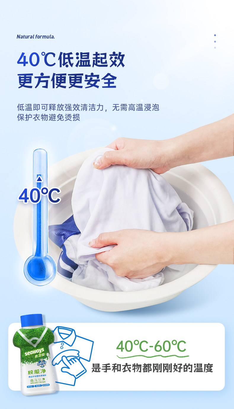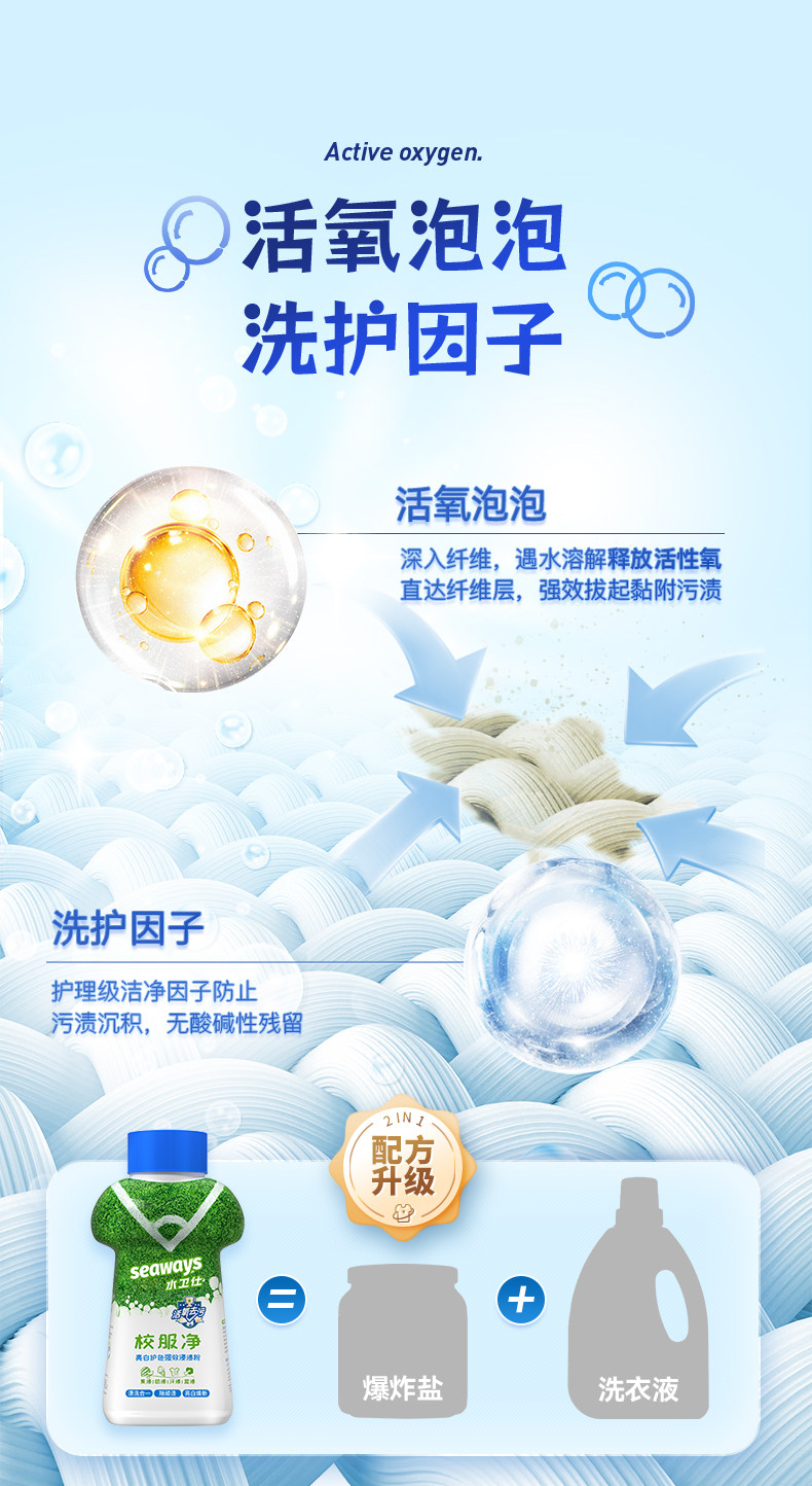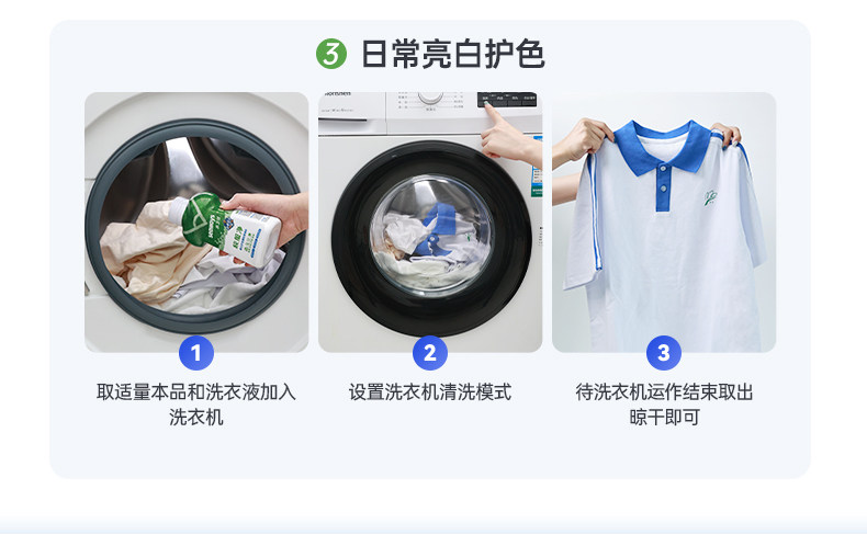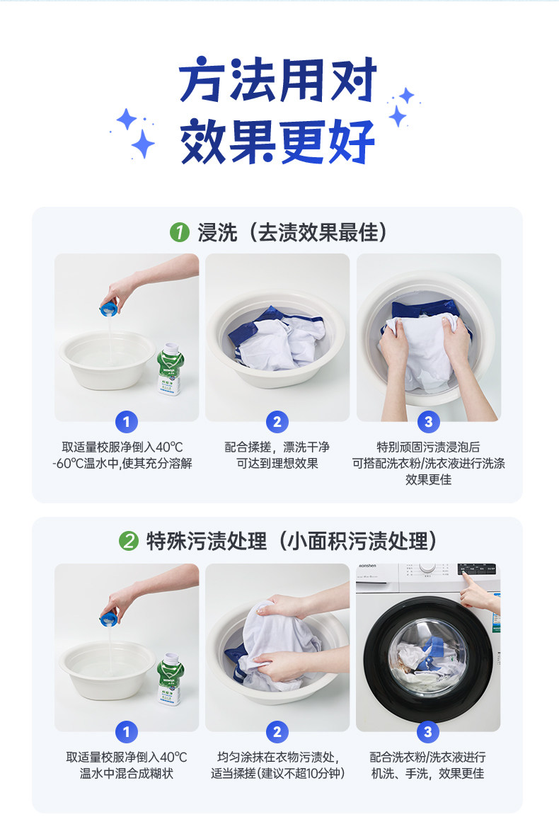 【使用场景】用于白色或彩色校服清洁,适用于棉、麻、化纤及混纺等材质的衣物、毛巾、鞋子等