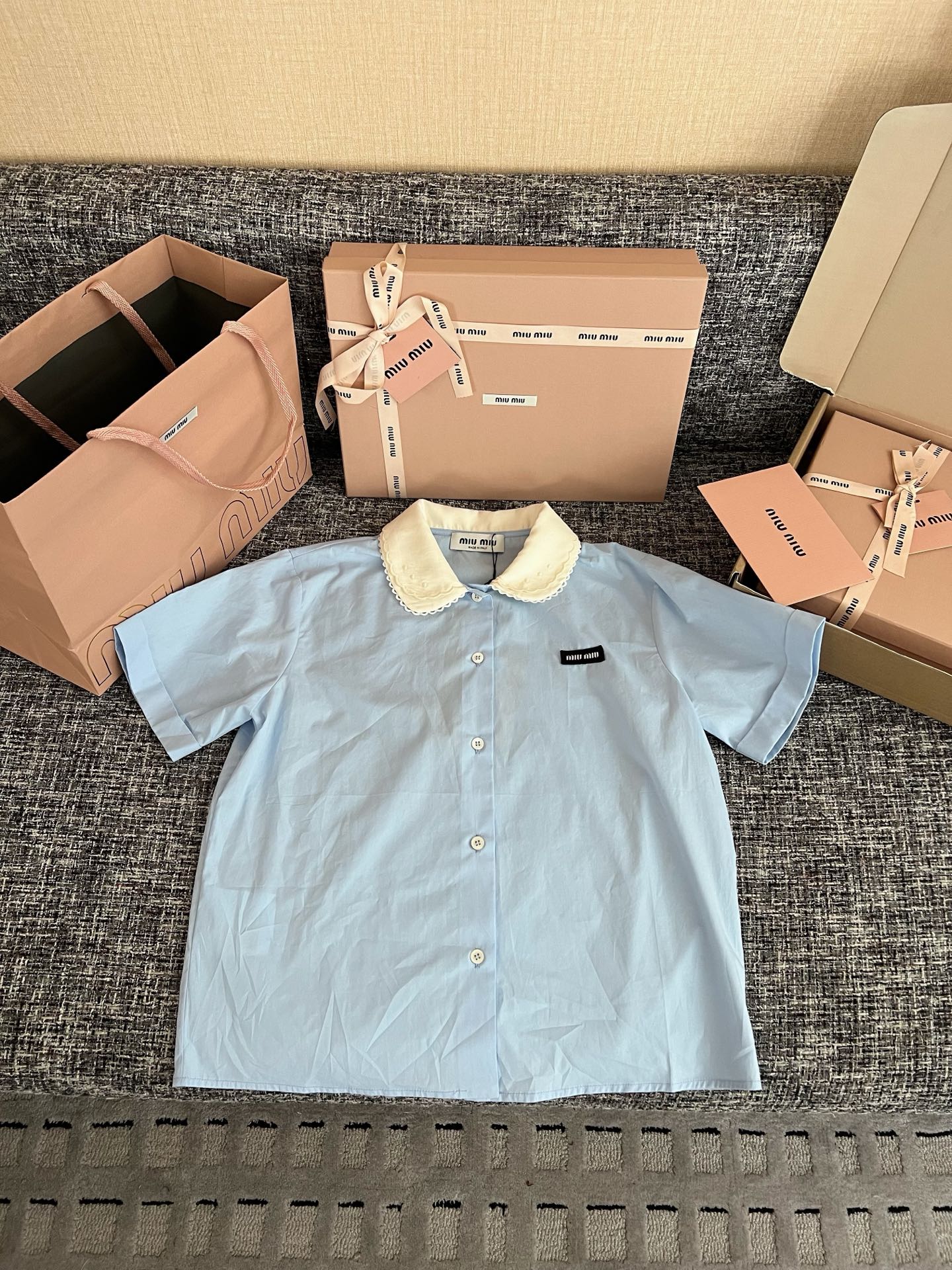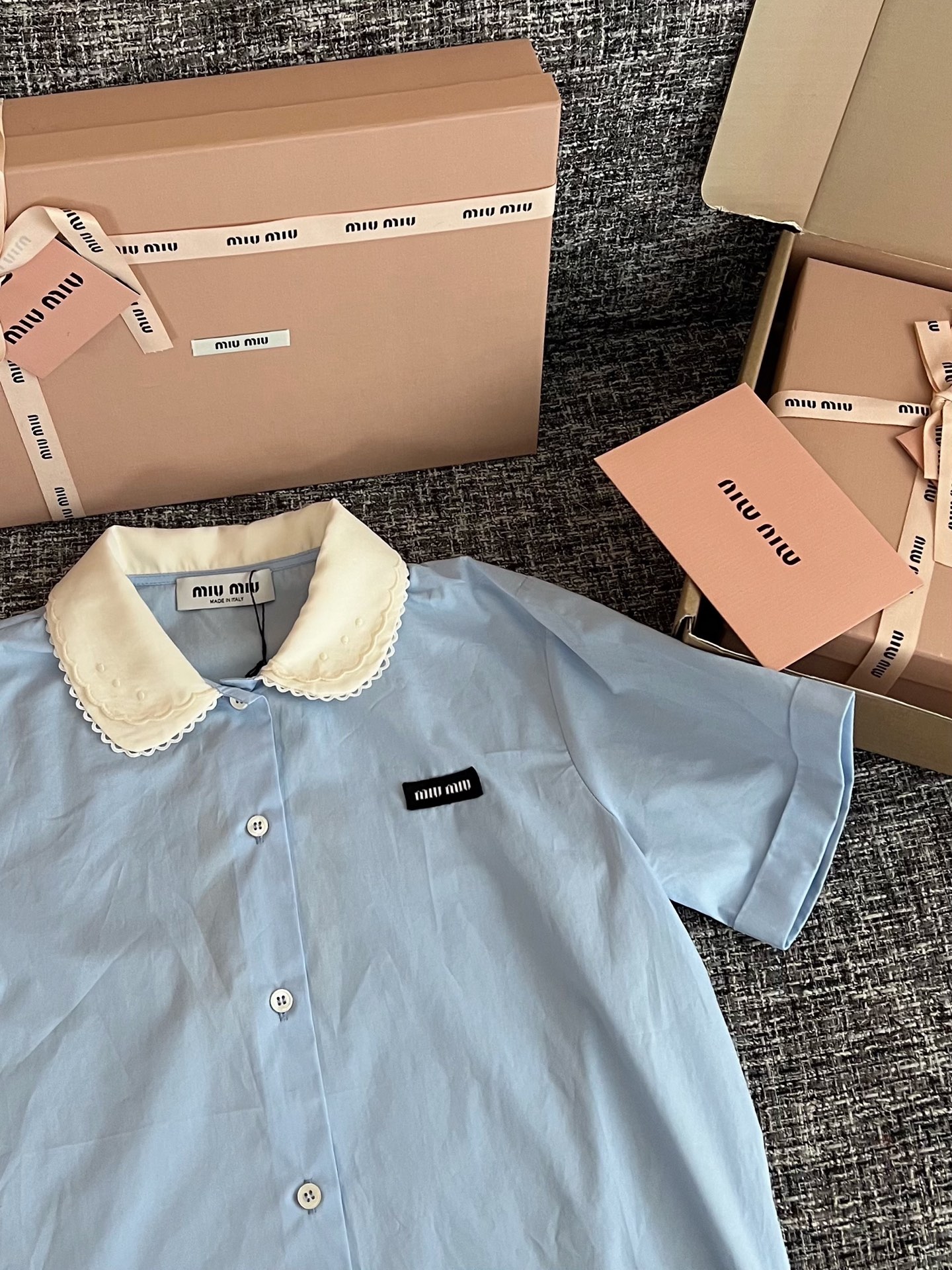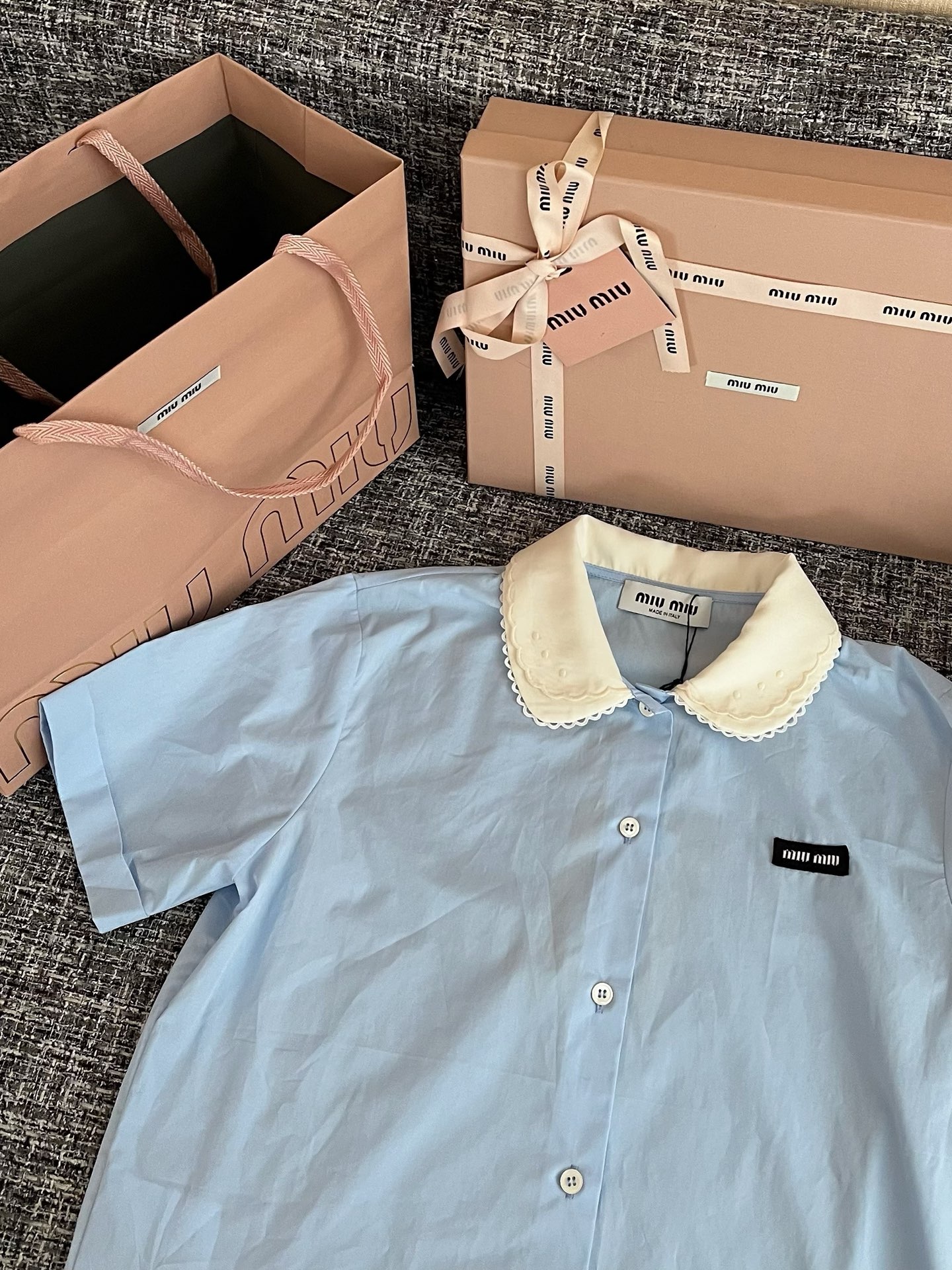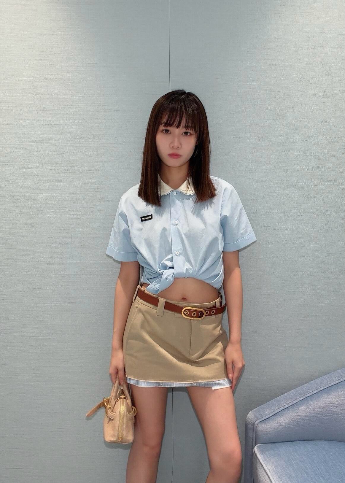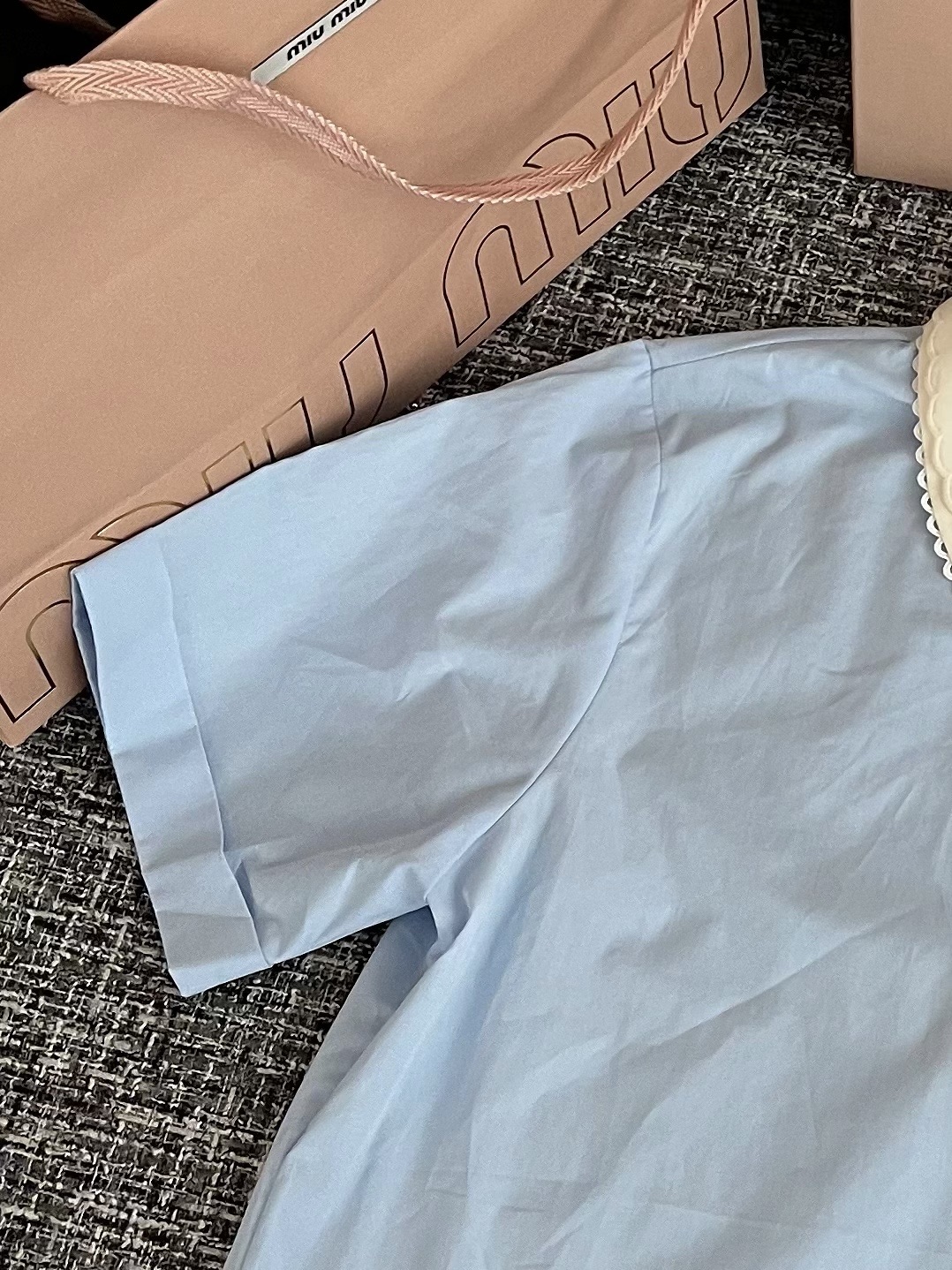 MiuMiu 26早春新款衬衫短袖🐮13600购买Zp拆解打造,订织订染三防梭织面料🐮 真正用到100%纯棉纱线做到对版出货💪工艺放大看细节除还原度接近98以上 做工也无敌了🔥真正做到1:1还原 直接闭着眼购买👀码数:36 38 40