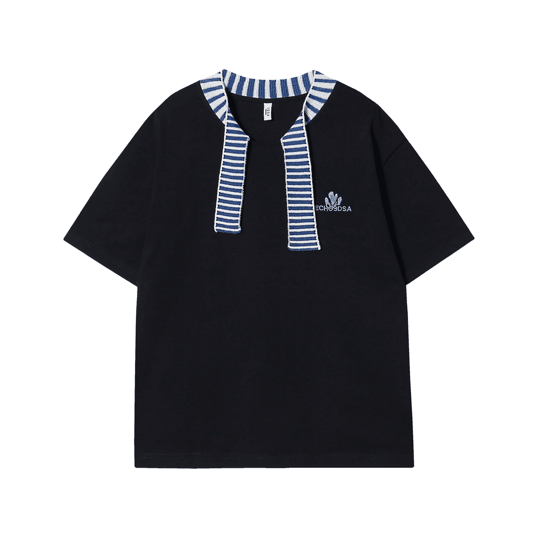 T1234夏季新款条纹拼接印花男士短袖潮流休闲上衣百搭时尚T恤