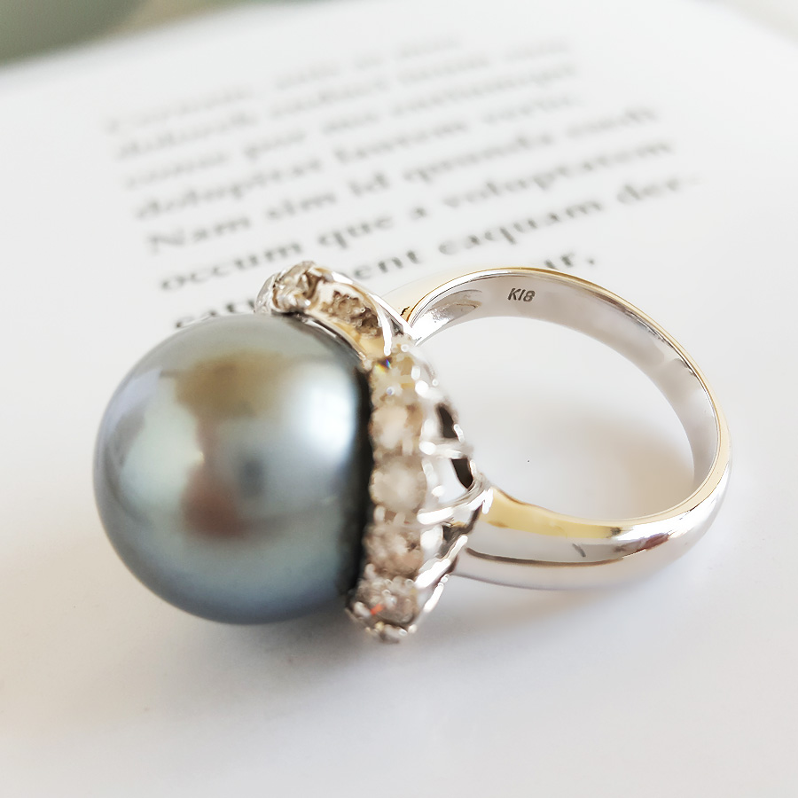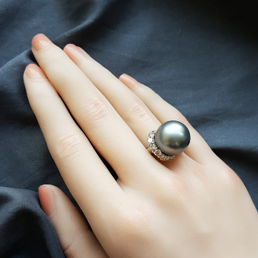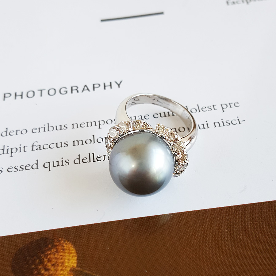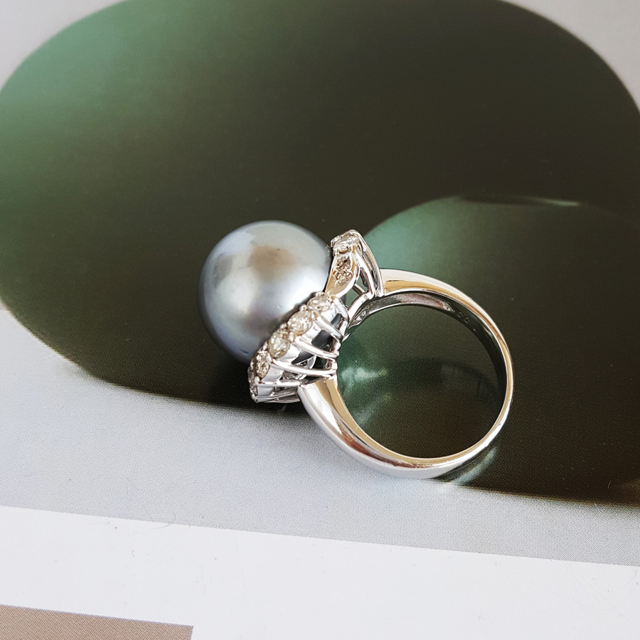 【天然正品】AU750收藏级白金豪镶钻石配天然约14.8MM近正圆无暇大溪地海水珍珠戒指灰黑色14号(戒圈可改)现售价:9380!310824NJM22