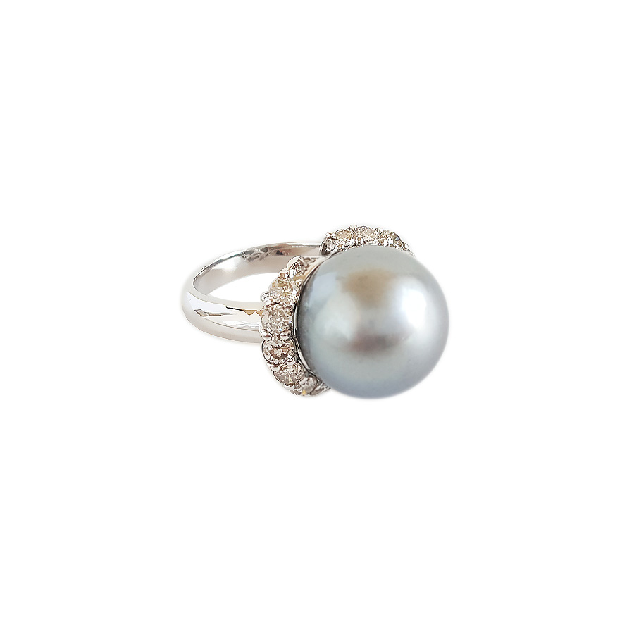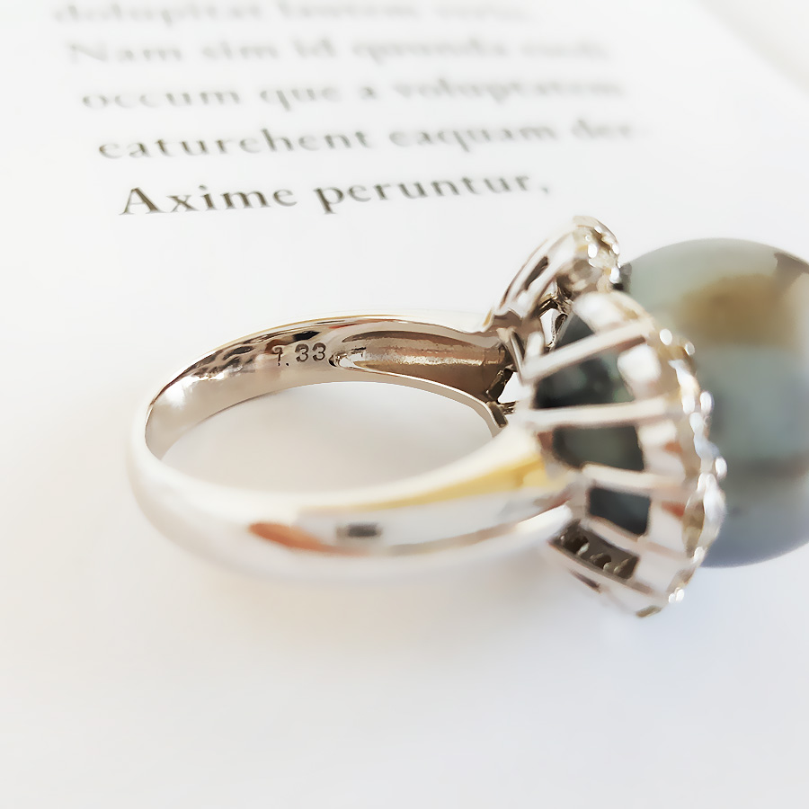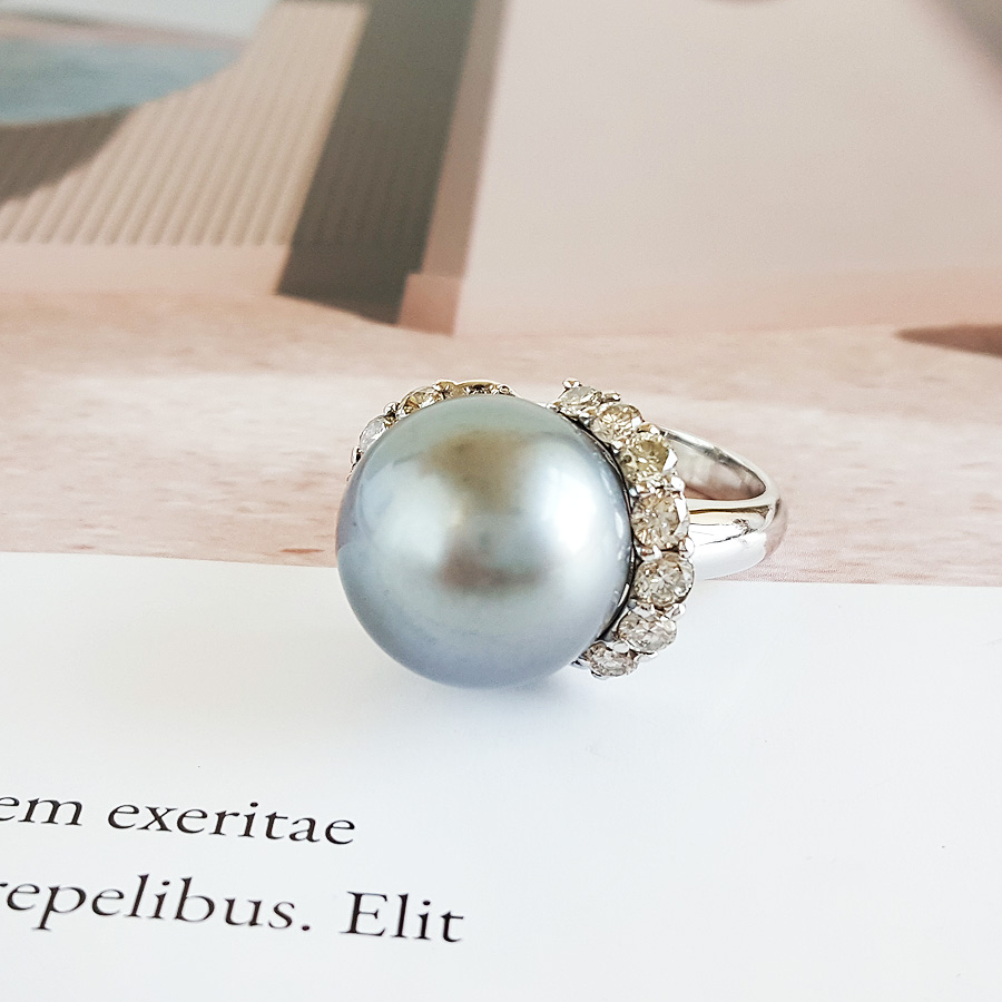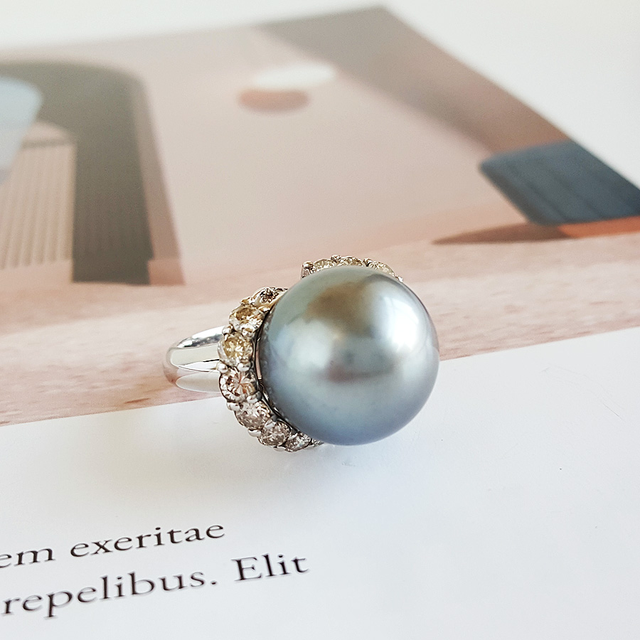 【天然正品】AU750收藏级白金豪镶钻石配天然约14.8MM近正圆无暇大溪地海水珍珠戒指灰黑色14号(戒圈可改)现售价:9380!310824NJM22