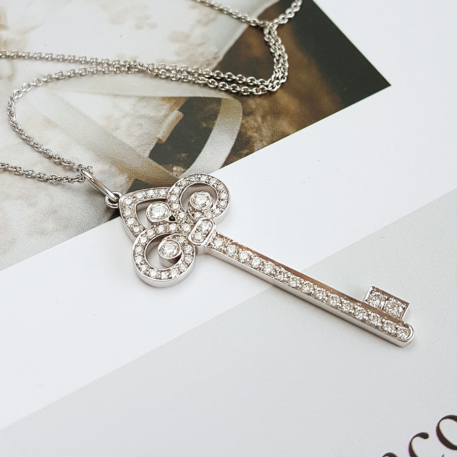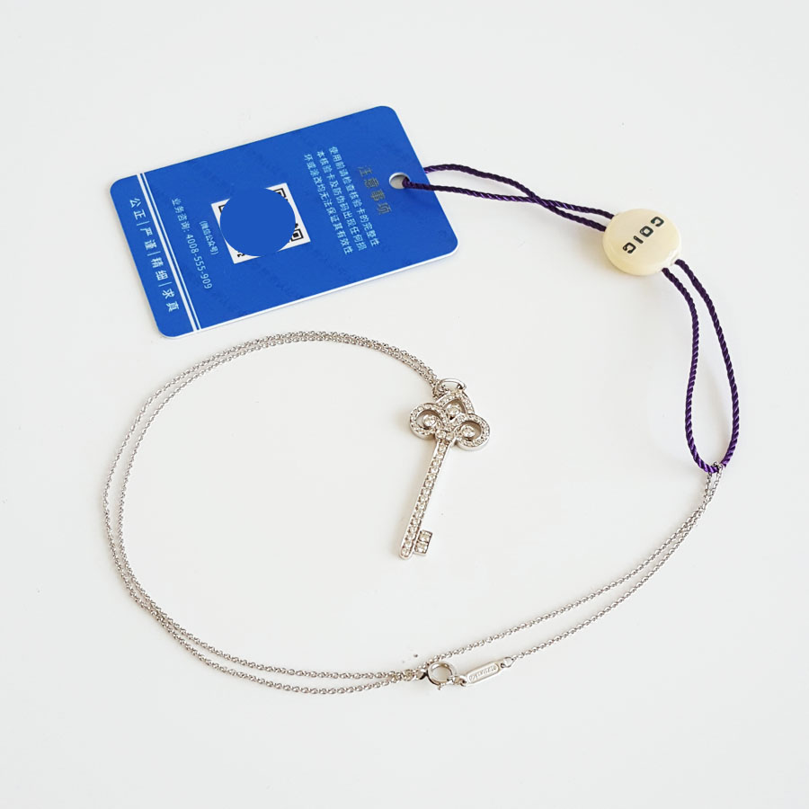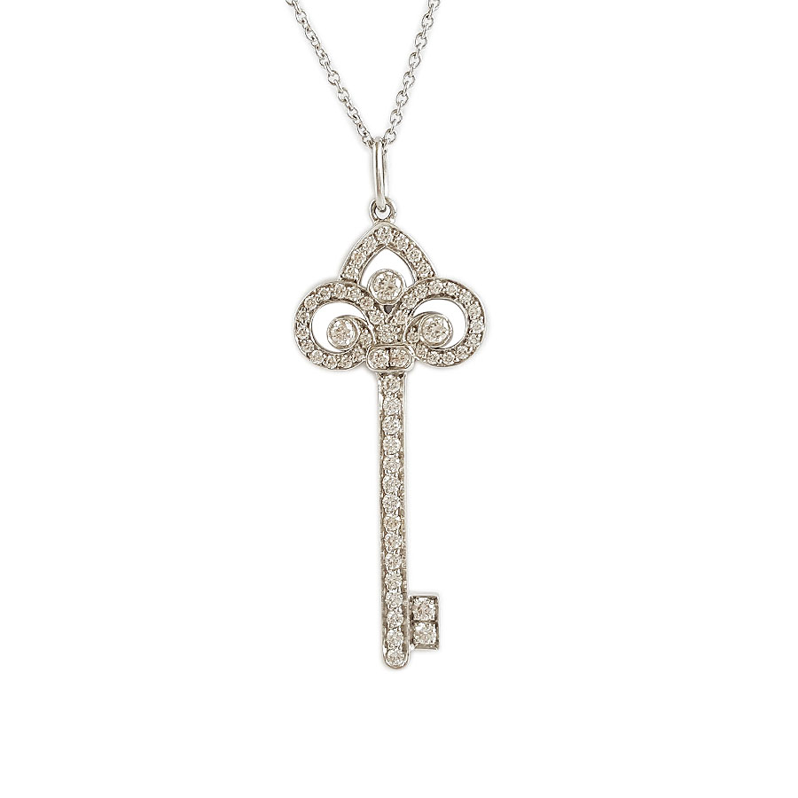 【95新】Tiffany & Co.蒂芙尼Tiffany Keys系列中号铂金满钻鸢尾花Fleur de Lis钥匙项链链长约45cm、吊坠长约3.7cm女士现售价:18000!130825NJS30