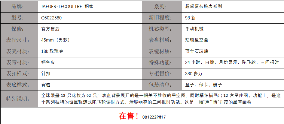 限量稀缺【98新正品】积家 JL 超卓复杂腕表 Q5022580 手动机械珐琅星空盘45mm限量款男表 081222PM17