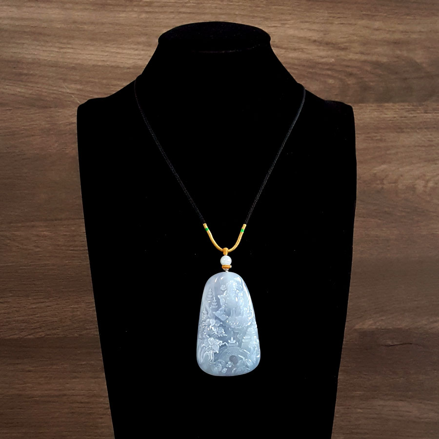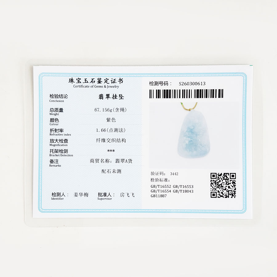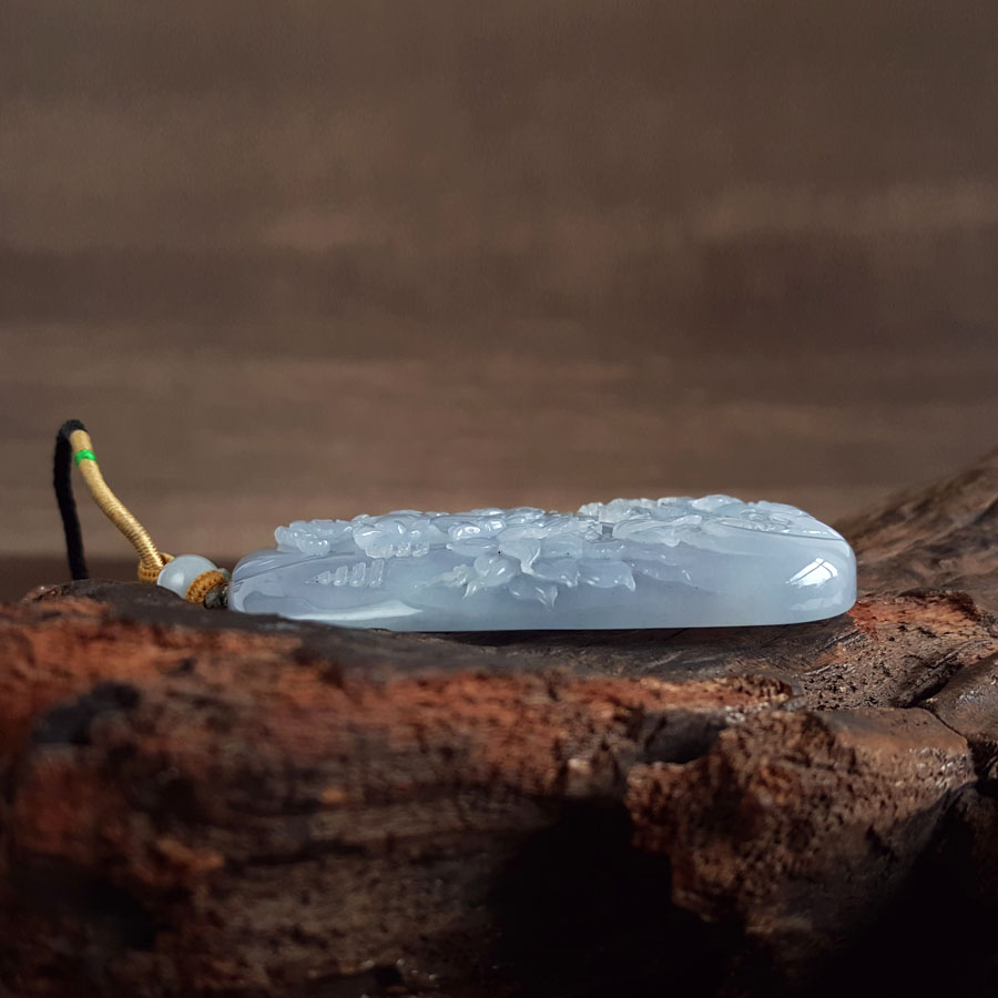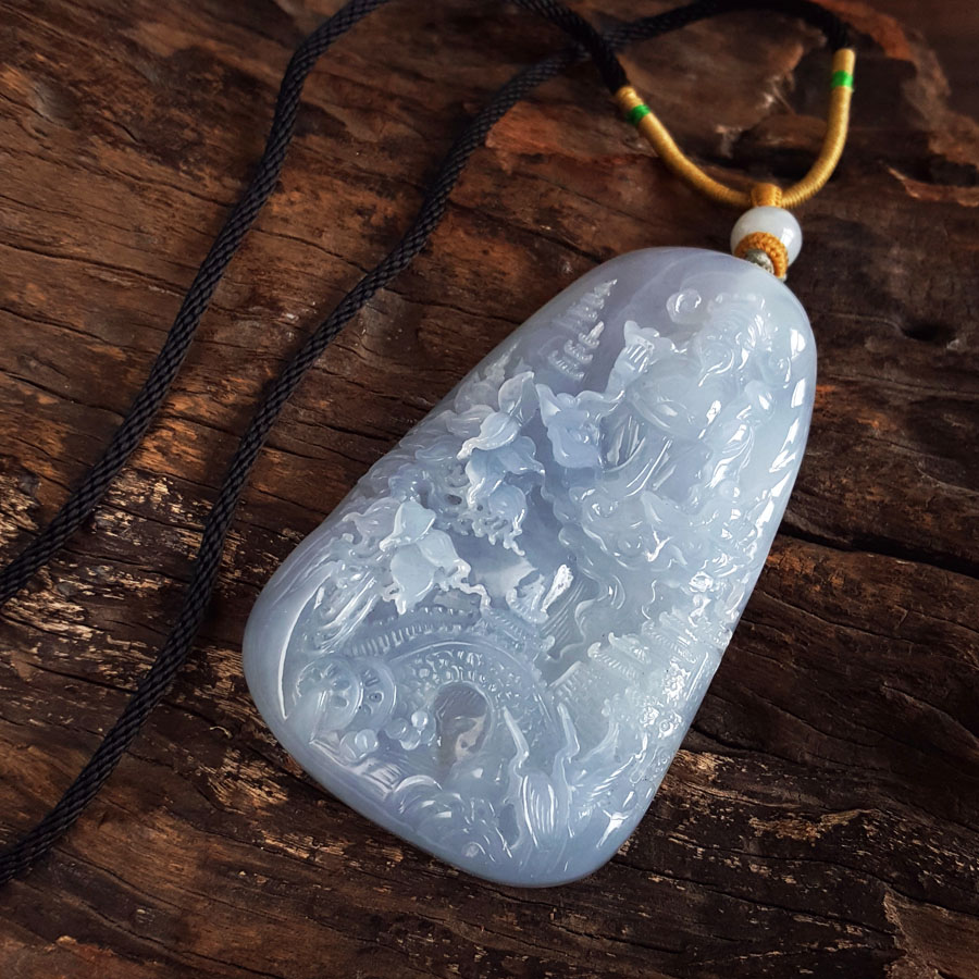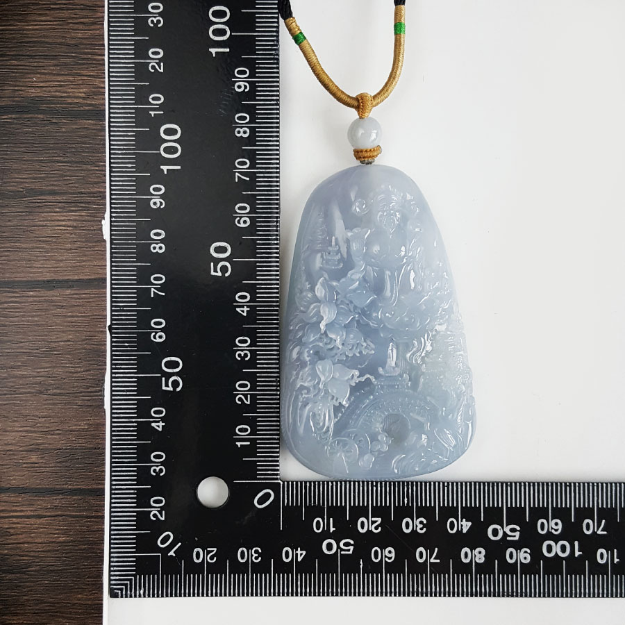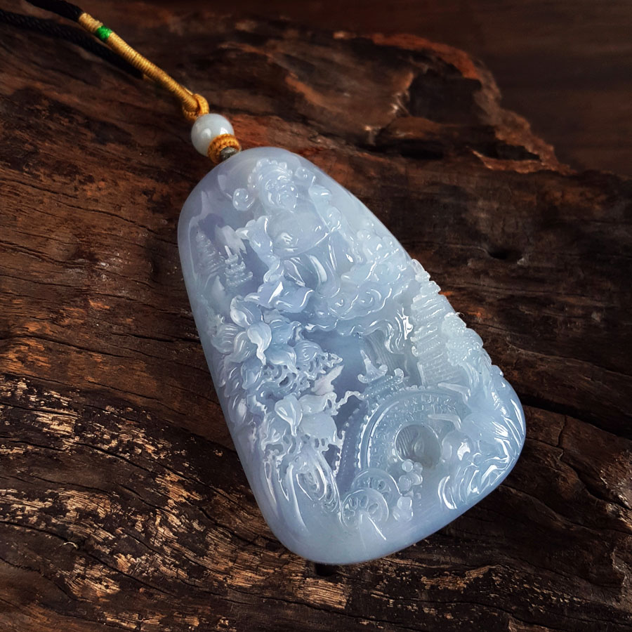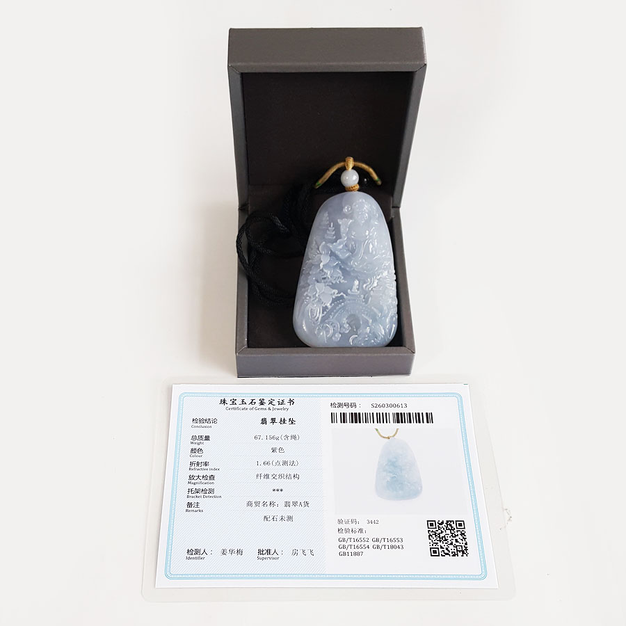 名称 | 天然细腻糯冰种紫罗兰雕山水财神(招财纳福)平安无事牌翡翠吊坠项链 |