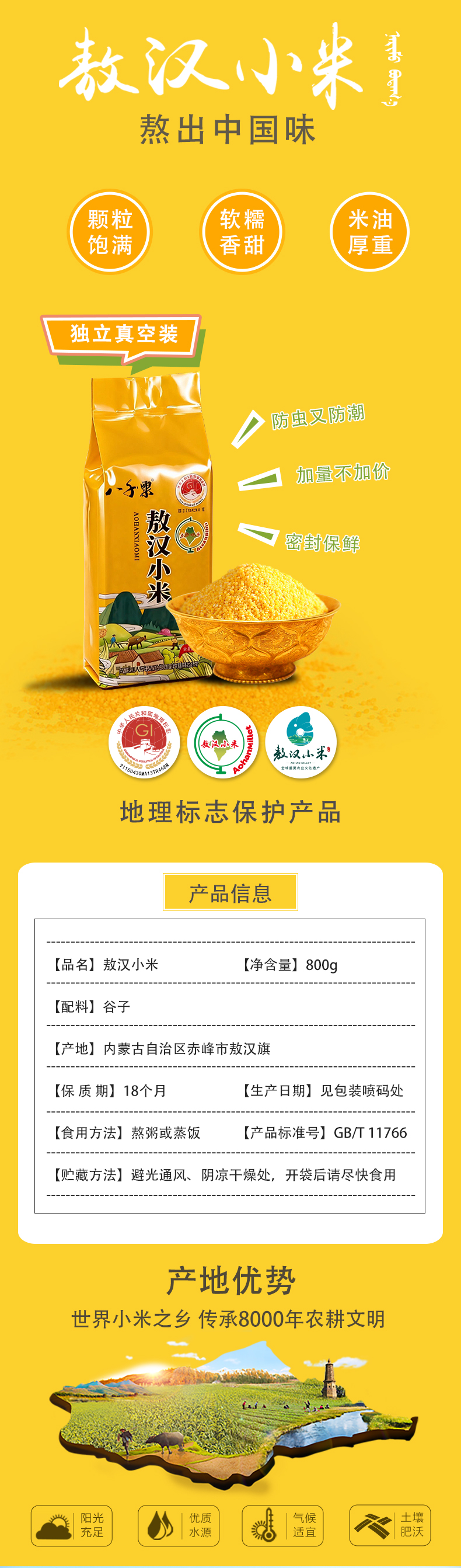 赤峰敖汉旗 八千粟敖汉小米800g*2袋/组真空块装 全球环境500佳 世界小米之乡 全球重要农业文化遗产地 BBQS