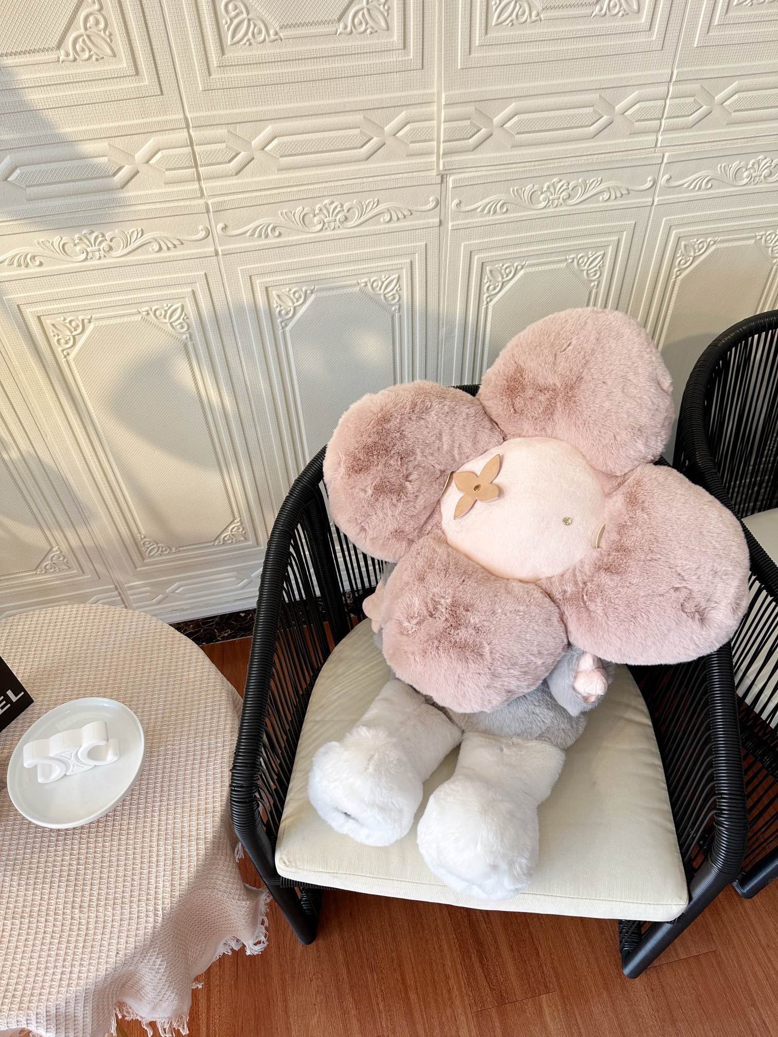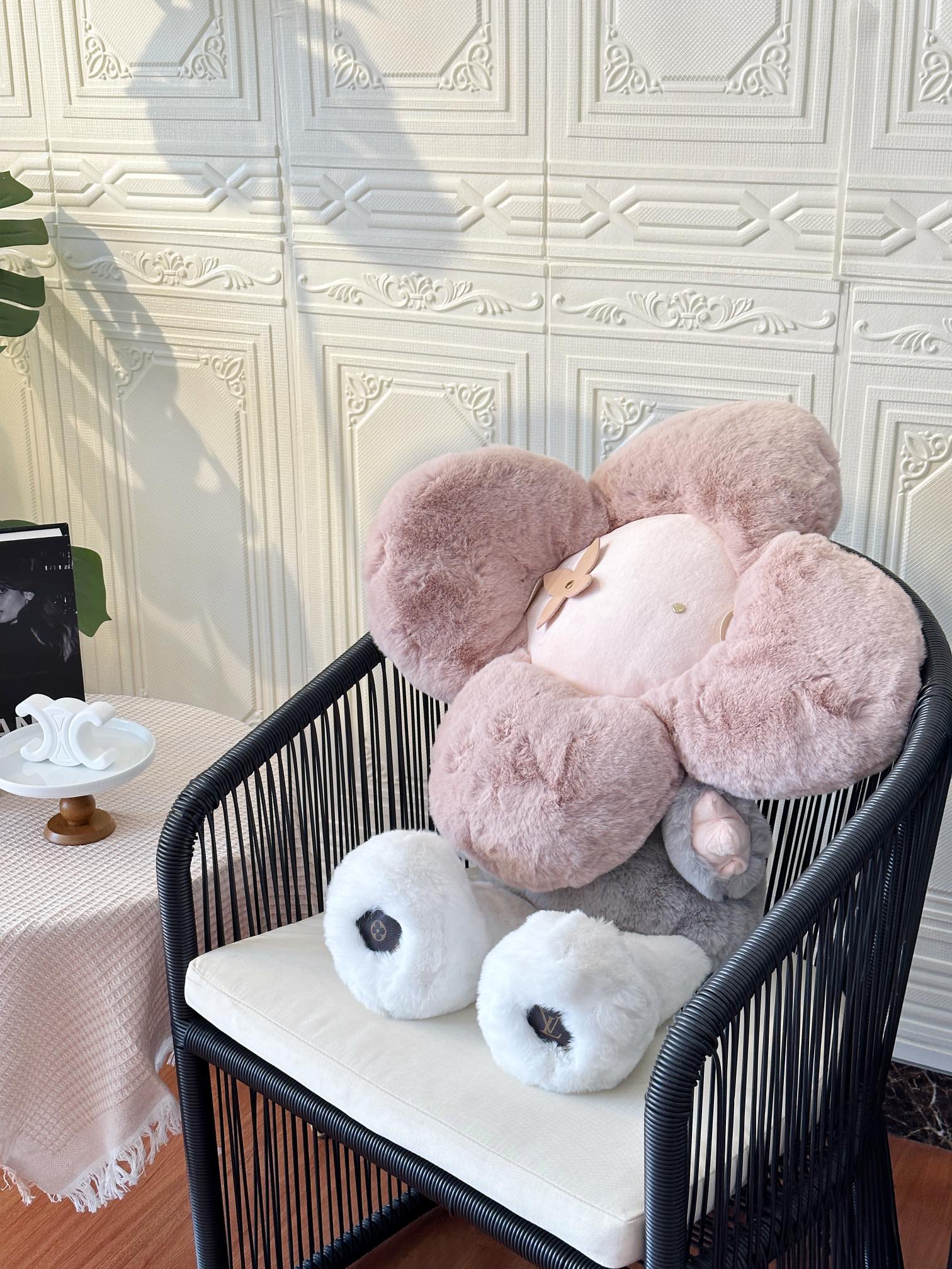 Vivienne 有着太阳花一样萌圆的脑袋,头部是由四叶花卉和區的元素组成,四角星变形成了右眼部的装饰、内菱形和LV字母组成了玩偶的主要部分。没错…Vivienne 正是源自 LOUISVUITTON 路易威登经典品牌Monogram (花押字图案)而设计的吉祥物。