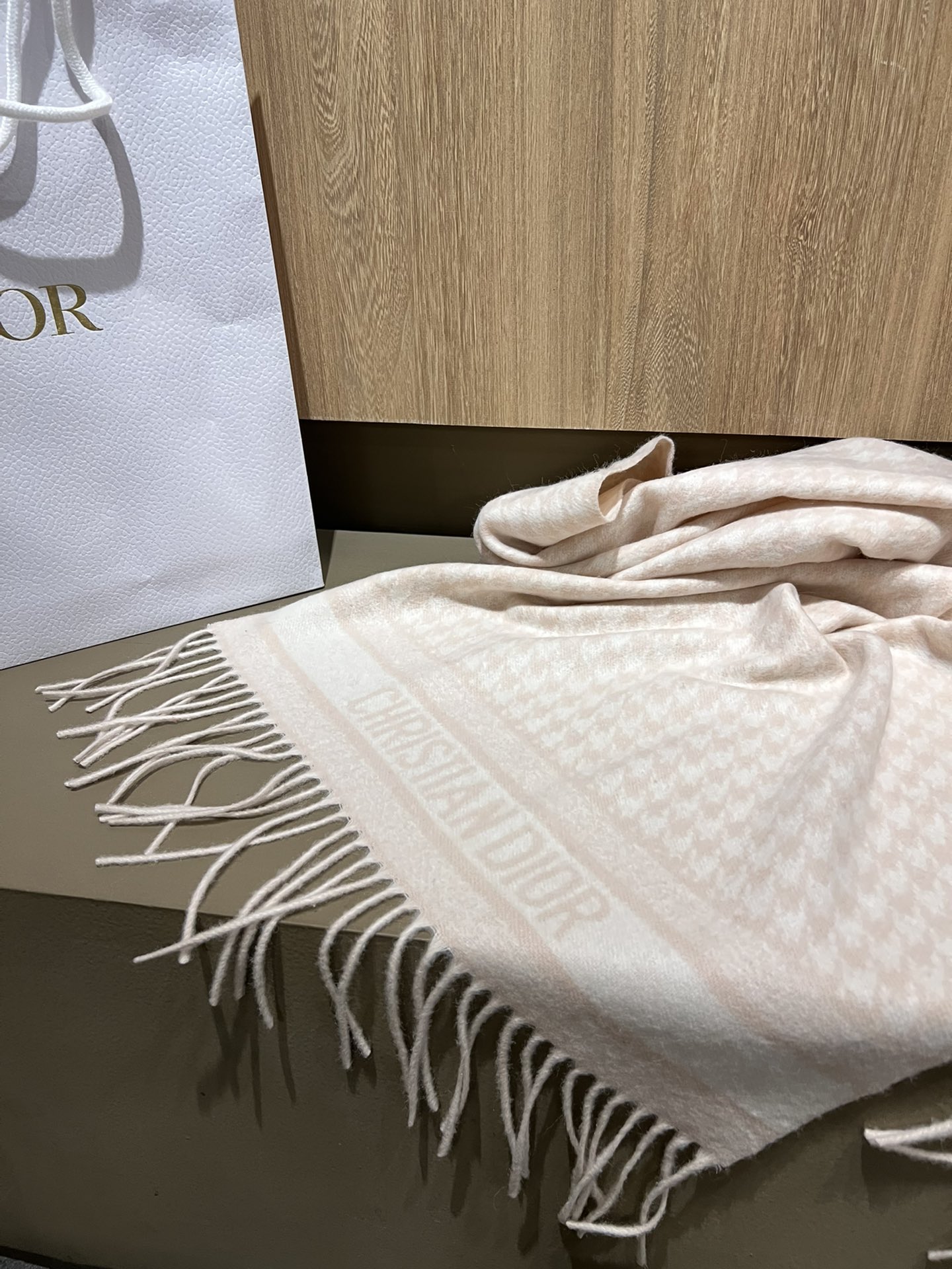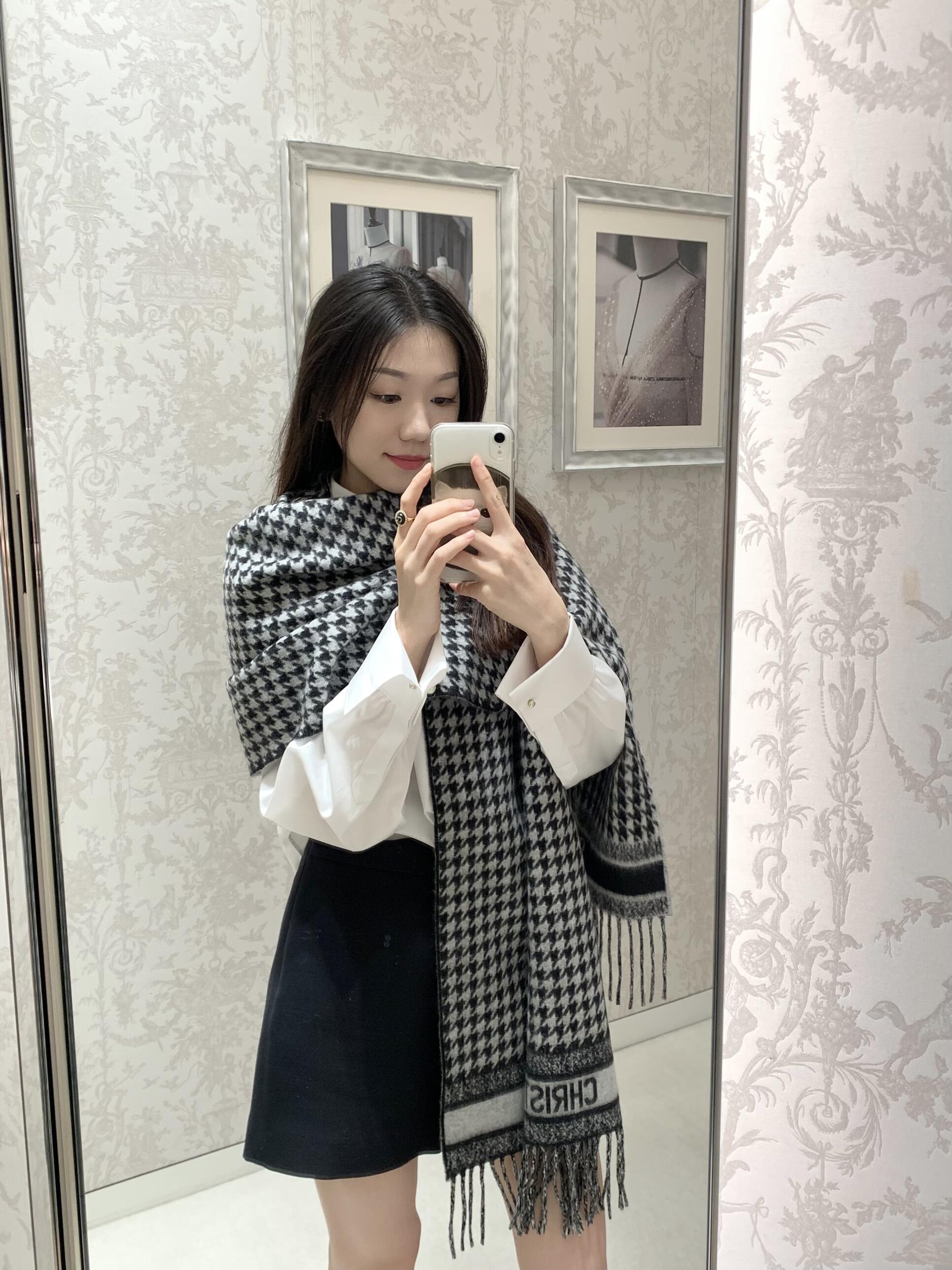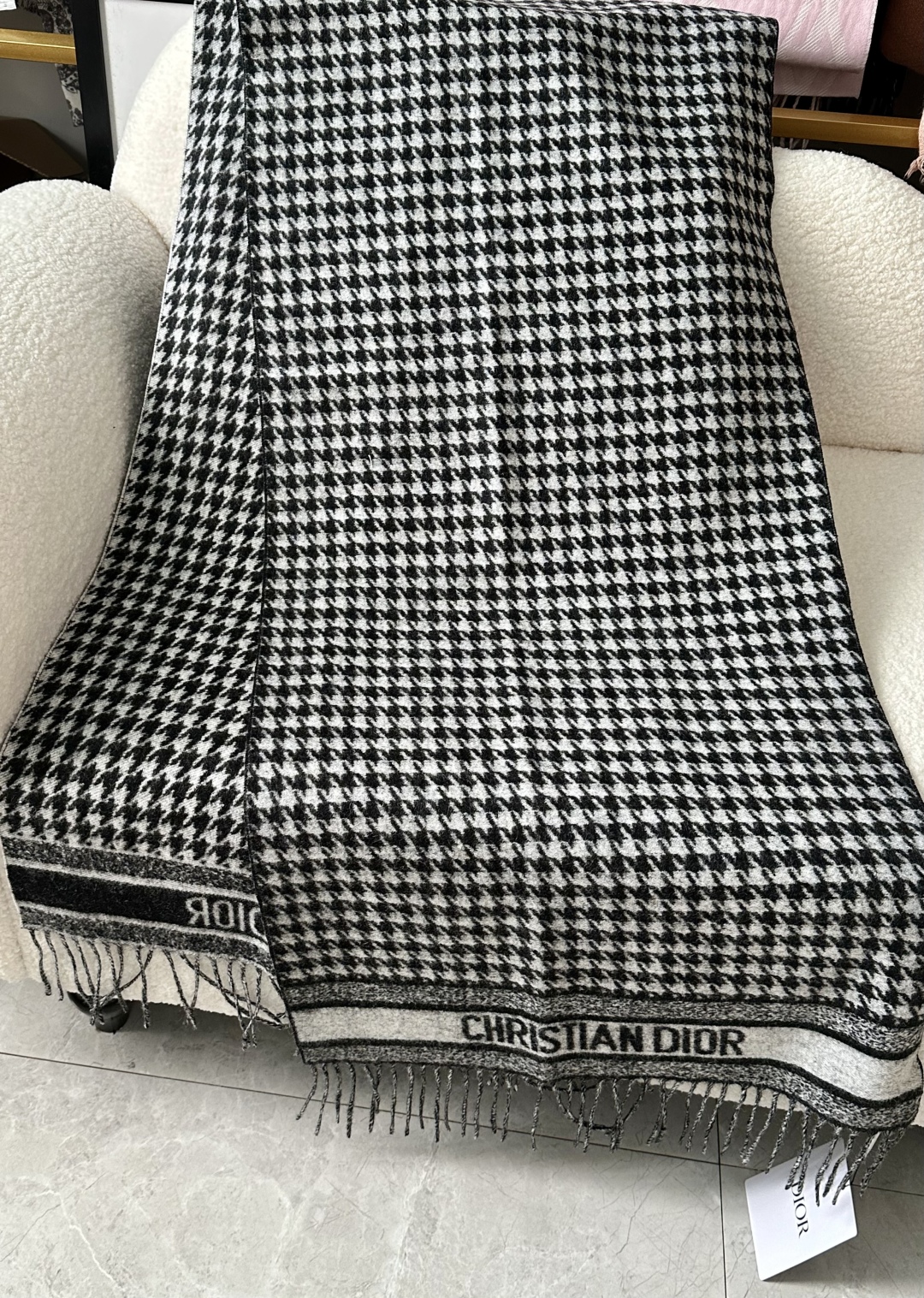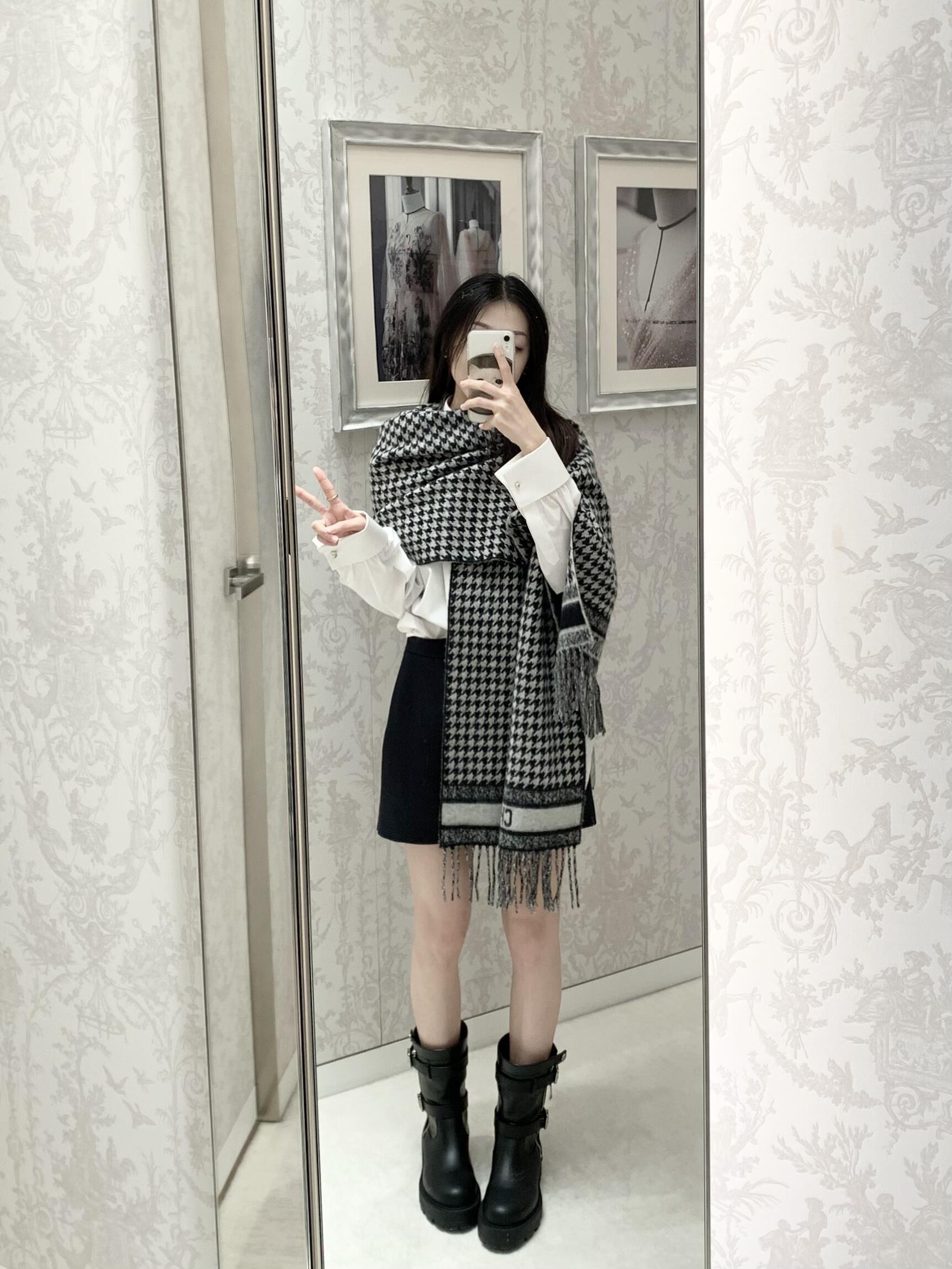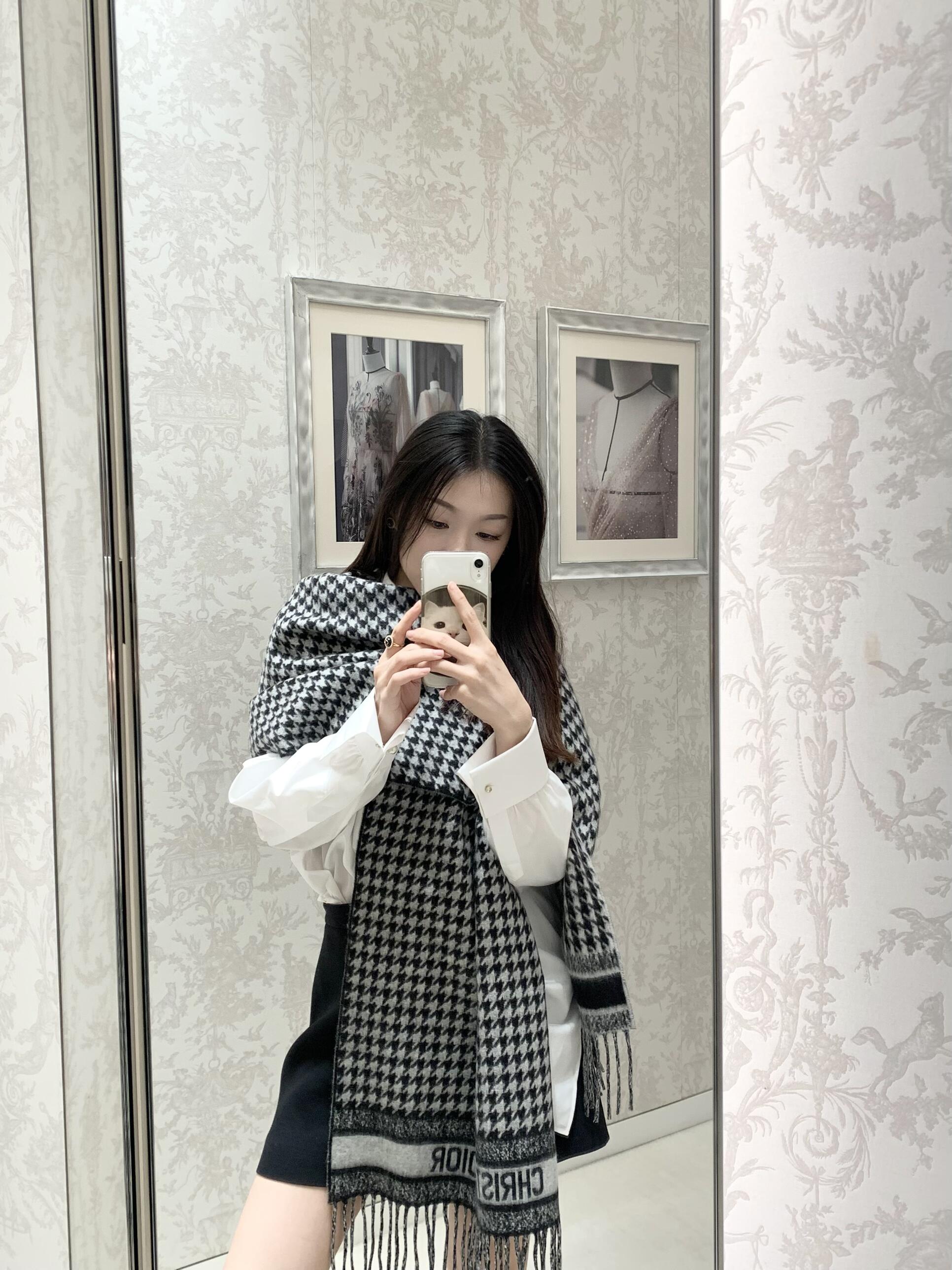 Dio*24年新款千鸟格围巾,这款围巾向经典的粉色和白色千鸟格纹图案致敬。采用羊绒面料精心制作,双面设计,饰以流苏饰边,点缀以对比鲜明的 Christian Dior 标志提花条形图案。保暖柔软,可系在颈部或披在肩部。