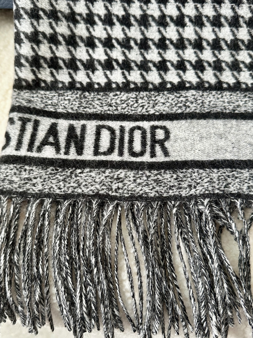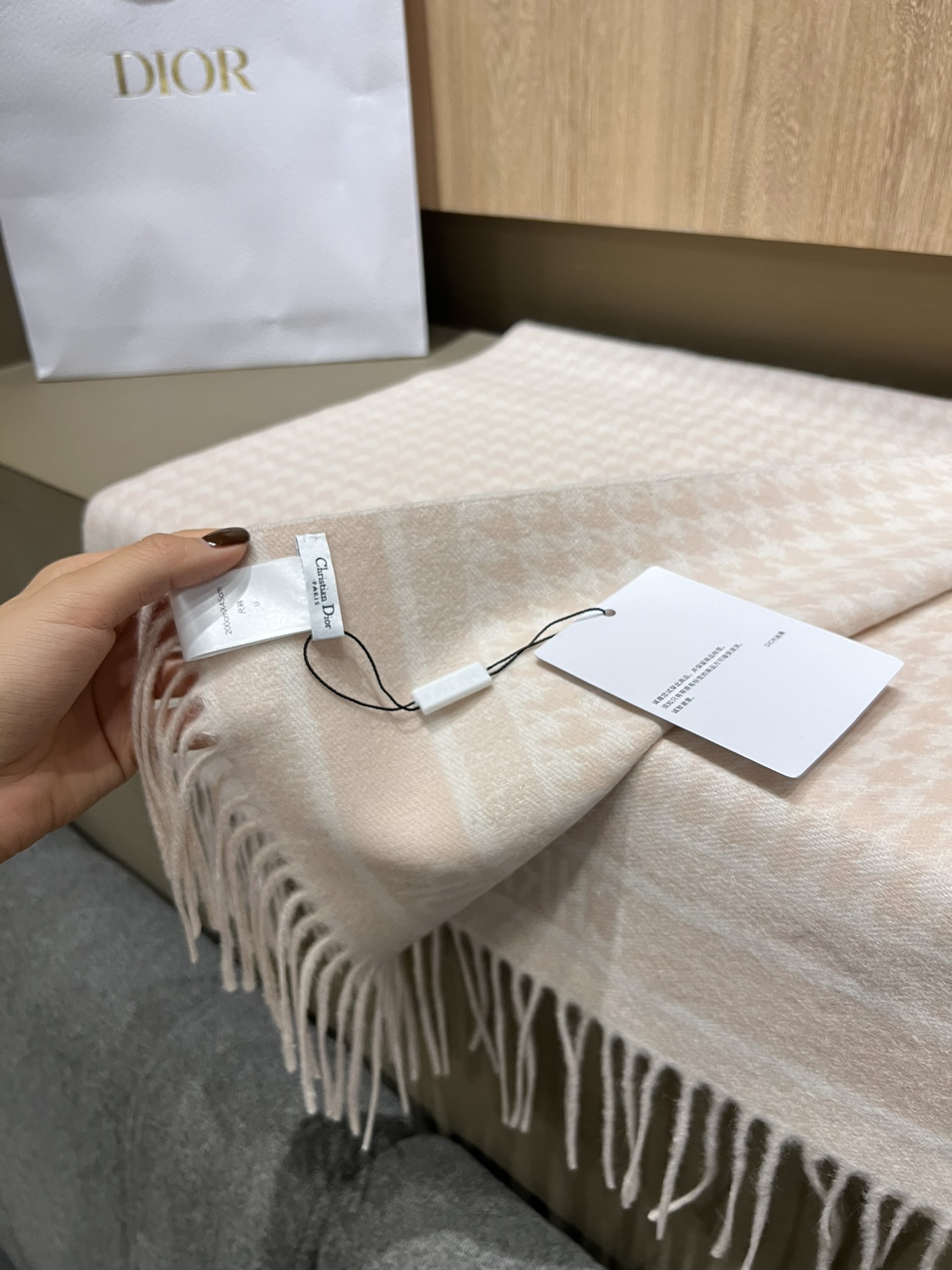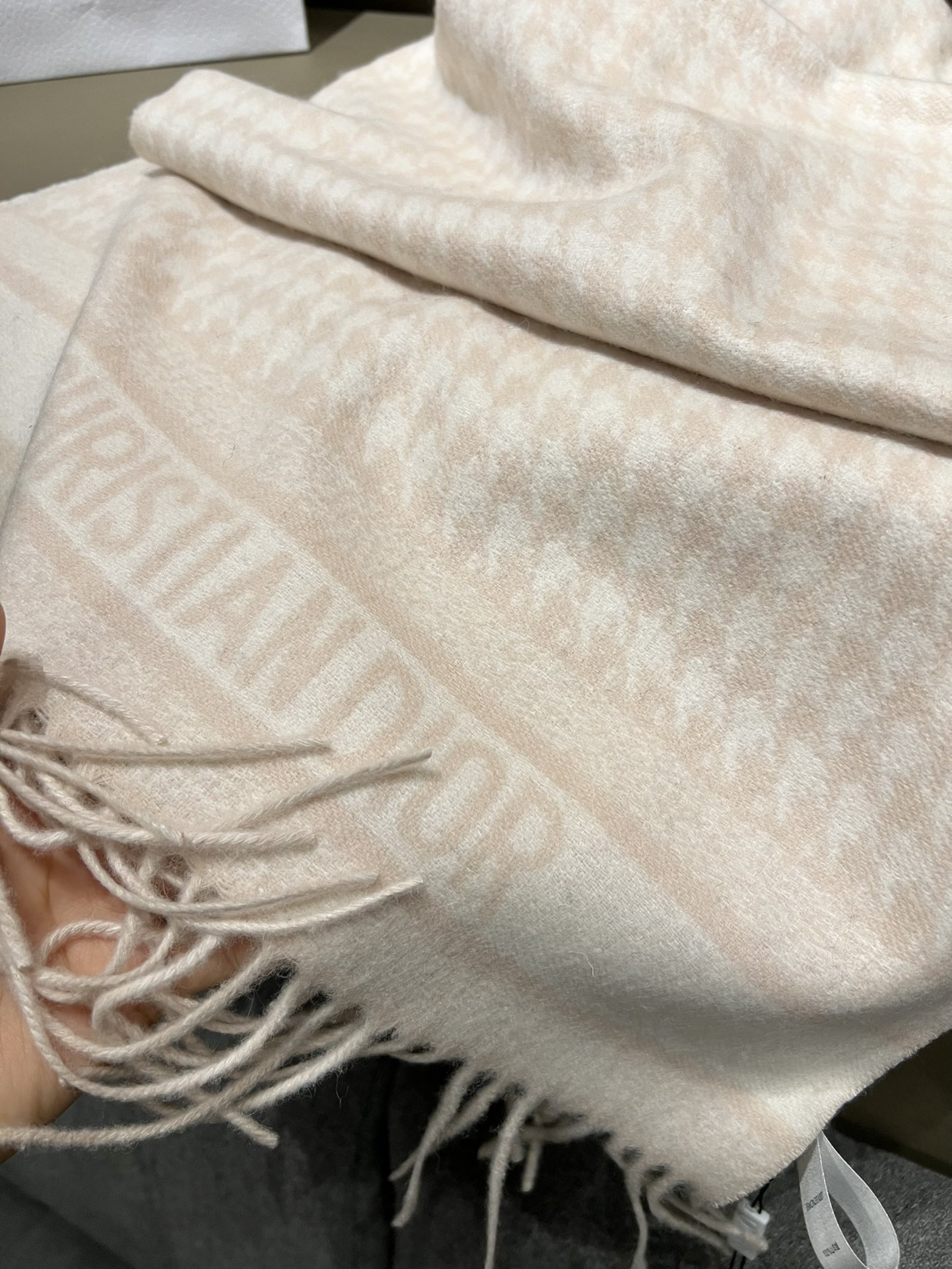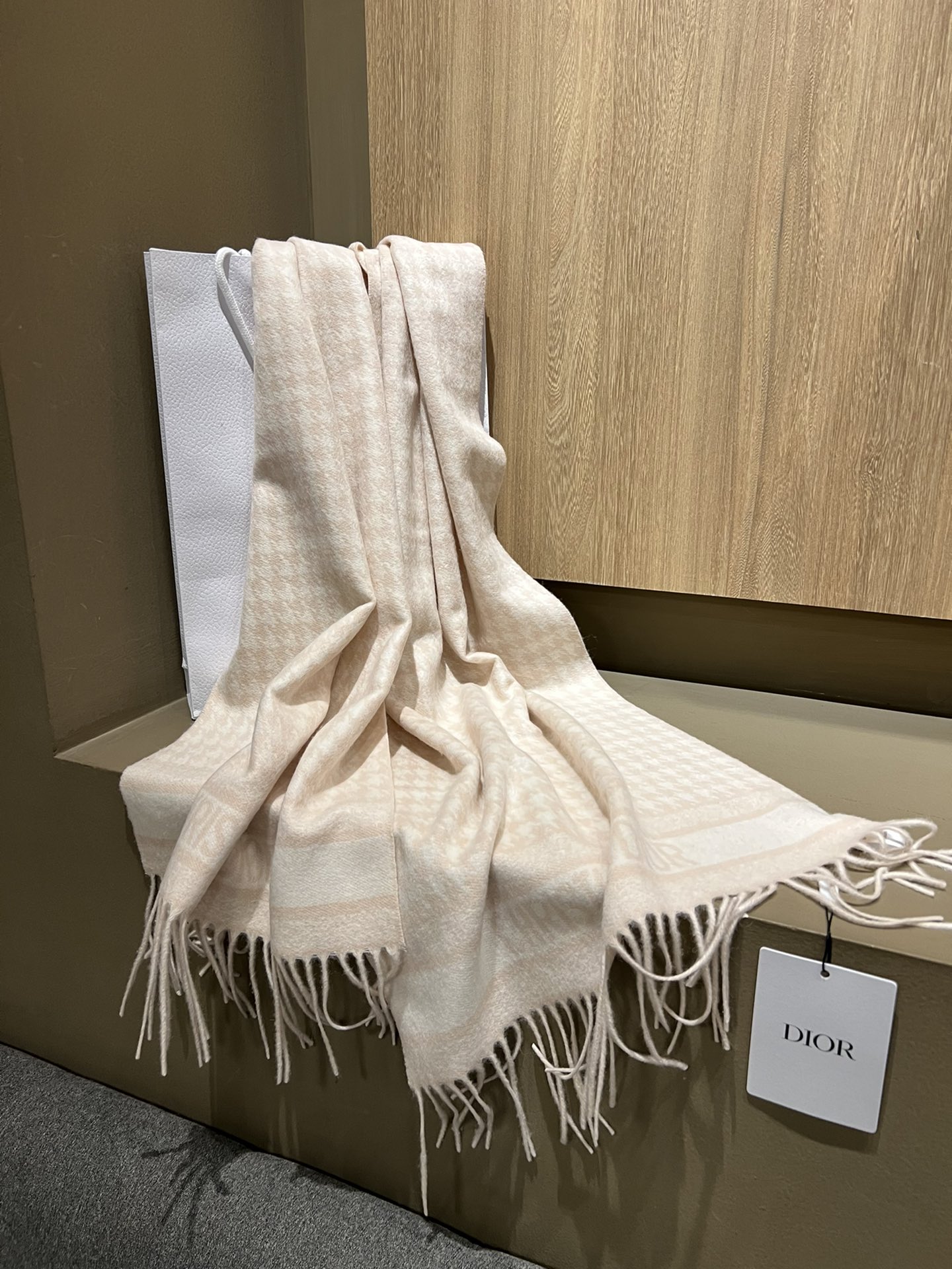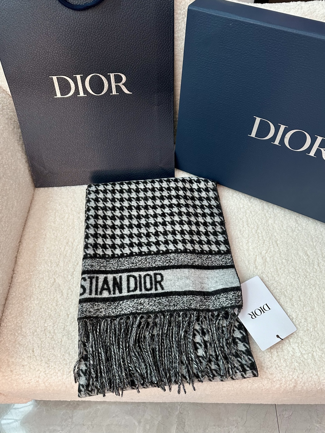 Dio*24年新款千鸟格围巾,这款围巾向经典的粉色和白色千鸟格纹图案致敬。采用羊绒面料精心制作,双面设计,饰以流苏饰边,点缀以对比鲜明的 Christian Dior 标志提花条形图案。保暖柔软,可系在颈部或披在肩部。