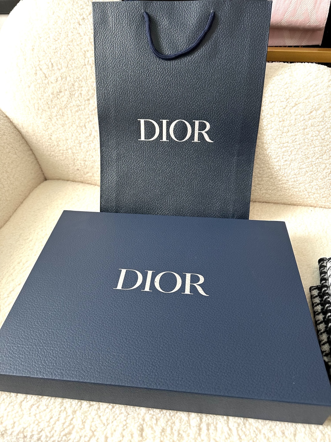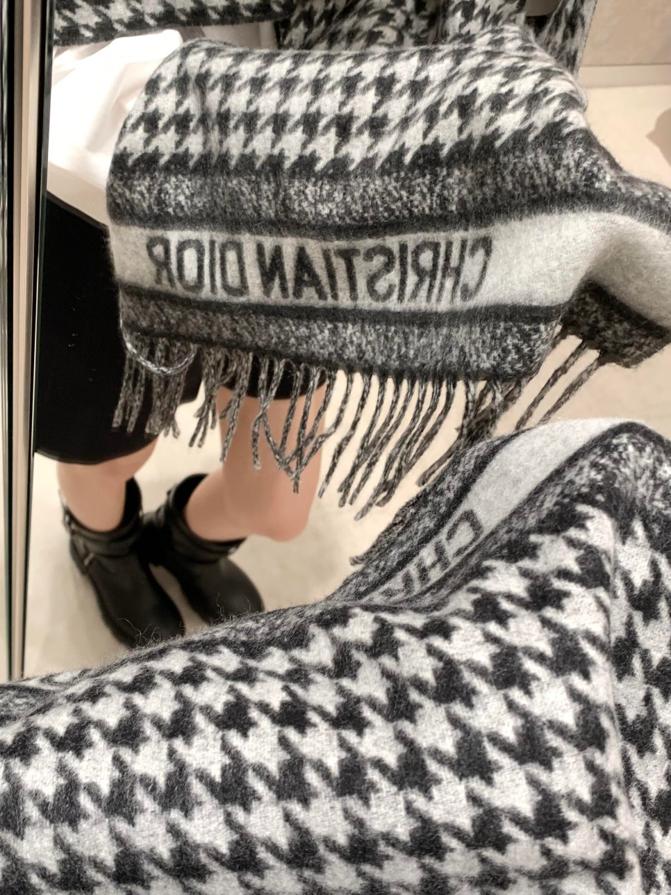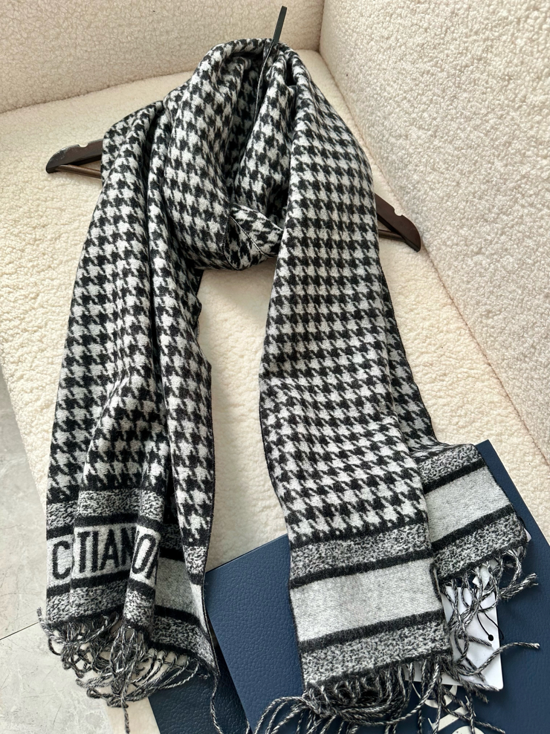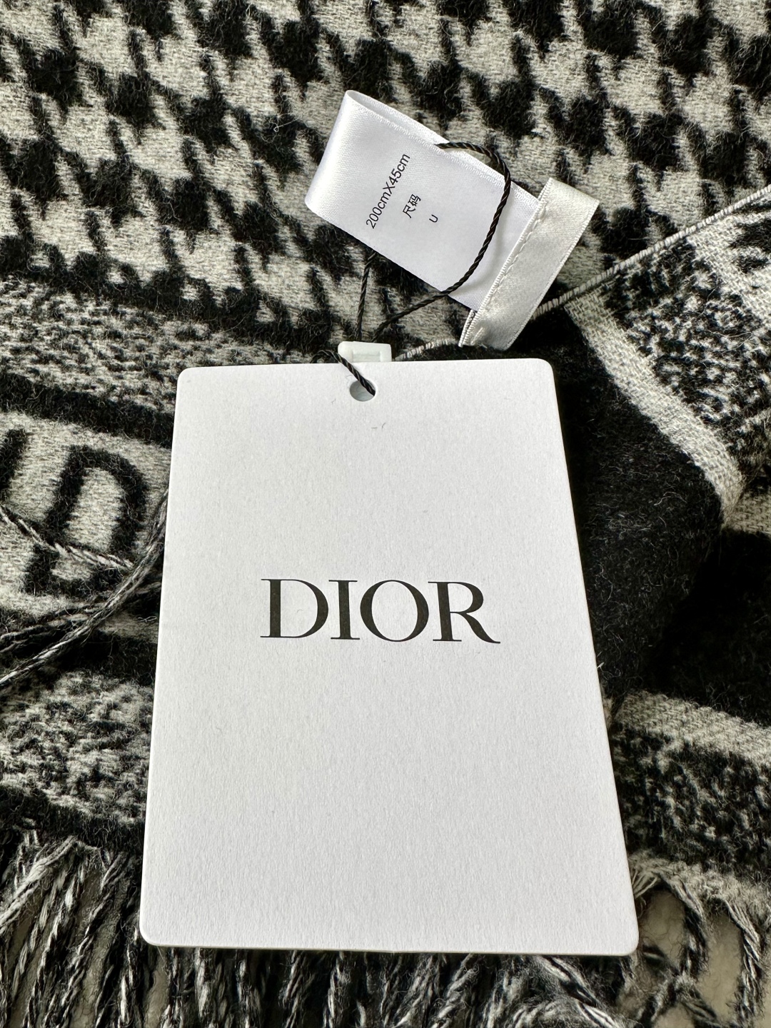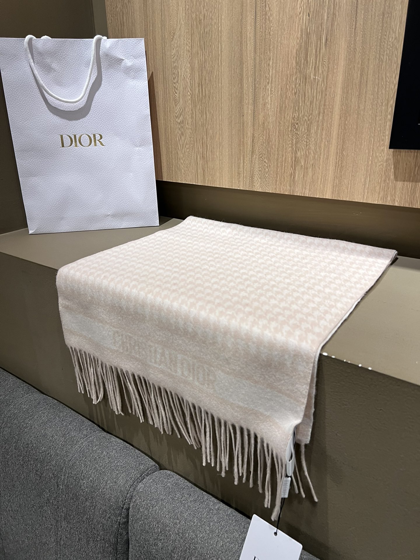 Dio*24年新款千鸟格围巾,这款围巾向经典的粉色和白色千鸟格纹图案致敬。采用羊绒面料精心制作,双面设计,饰以流苏饰边,点缀以对比鲜明的 Christian Dior 标志提花条形图案。保暖柔软,可系在颈部或披在肩部。