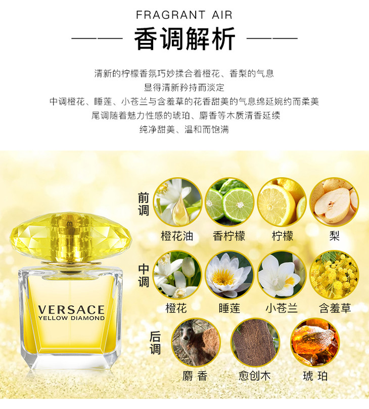 以耀眼绚丽的黄色为包装,像一颗钻石闪闪发光,豪华而不失精致。外包装充满了复古风情,蜷曲的金色蔓草印花,让人仿佛回到了巴洛克时代。清爽的果味前调如阳光一般绚烂,慢慢转为和煦温暖的中调,最后在馥郁的奢华香味画上意味深长的句号,没有过于激烈,却如暗流涌动般的诱惑。