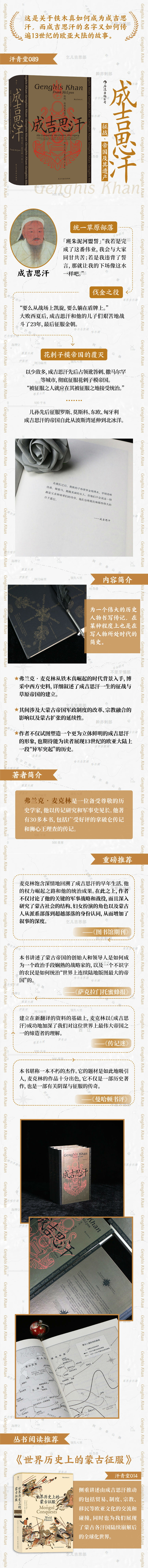 为一个伟大的历史人物书写传记,在某种程度上就像是在写人物所处时代的简史。弗兰克·麦克林从铁木真崛起的时代背景入手,博采中西方史料,详细叙述了成吉思汗一生的征战与草原帝国的建立。其间涉及大蒙古帝国军政制度的改革、宗教融合的影响以及蒙古扩张的延续性。作者不仅试图塑造一个更为立体鲜明的成吉思汗的形象,也期待能为读者展现13世纪的欧亚大陆上一段“异军突起”的历史。