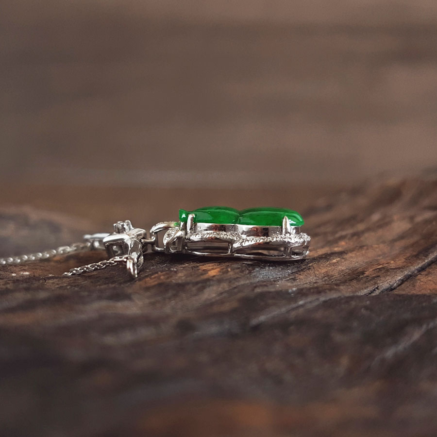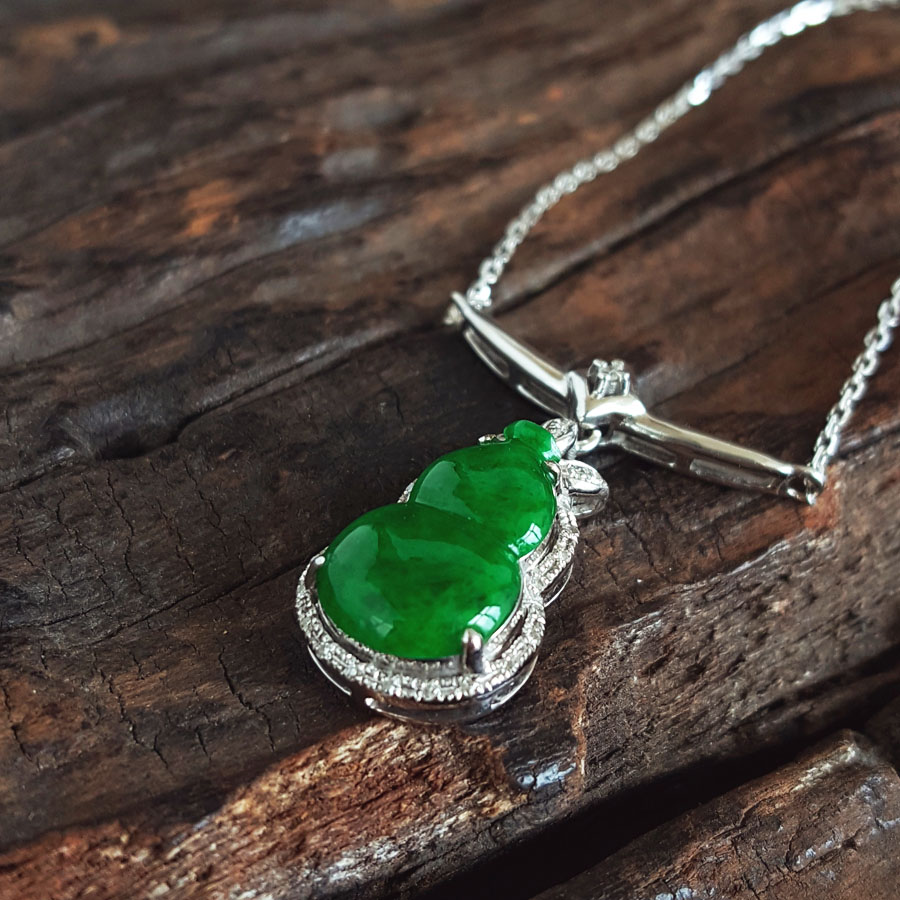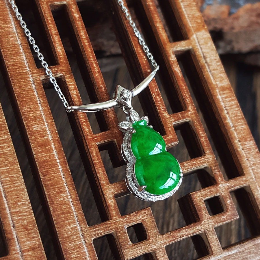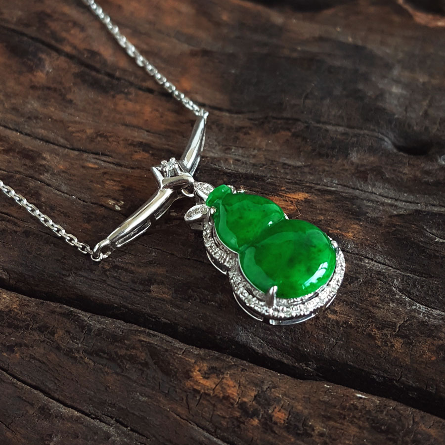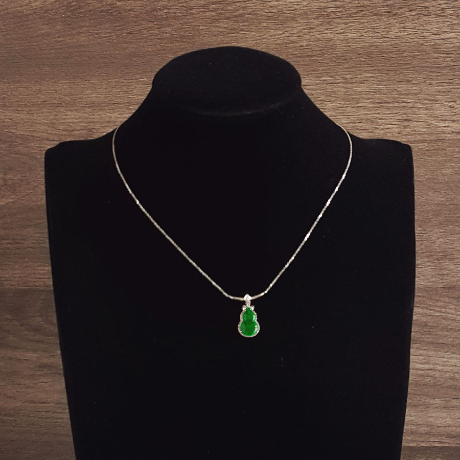 名称 | AU750白金镶钻镶天然细腻葫芦造型(福禄平安)糯种满绿翡翠吊坠项链 |