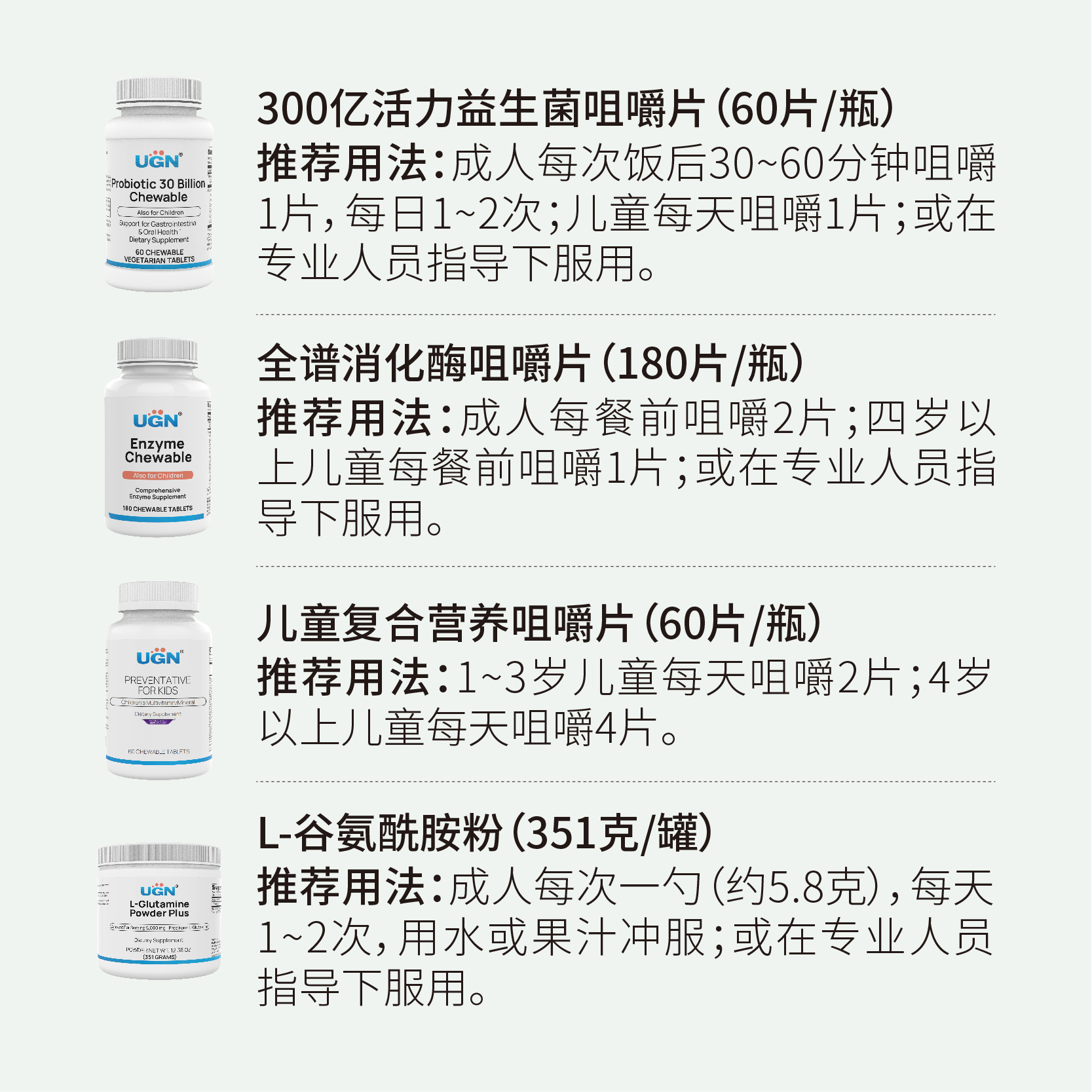 UGN儿童套餐(益生菌咀嚼片*1瓶+消化酶咀嚼片*1瓶+儿童复合营养咀嚼片*1瓶+谷氨酰胺粉*1瓶)