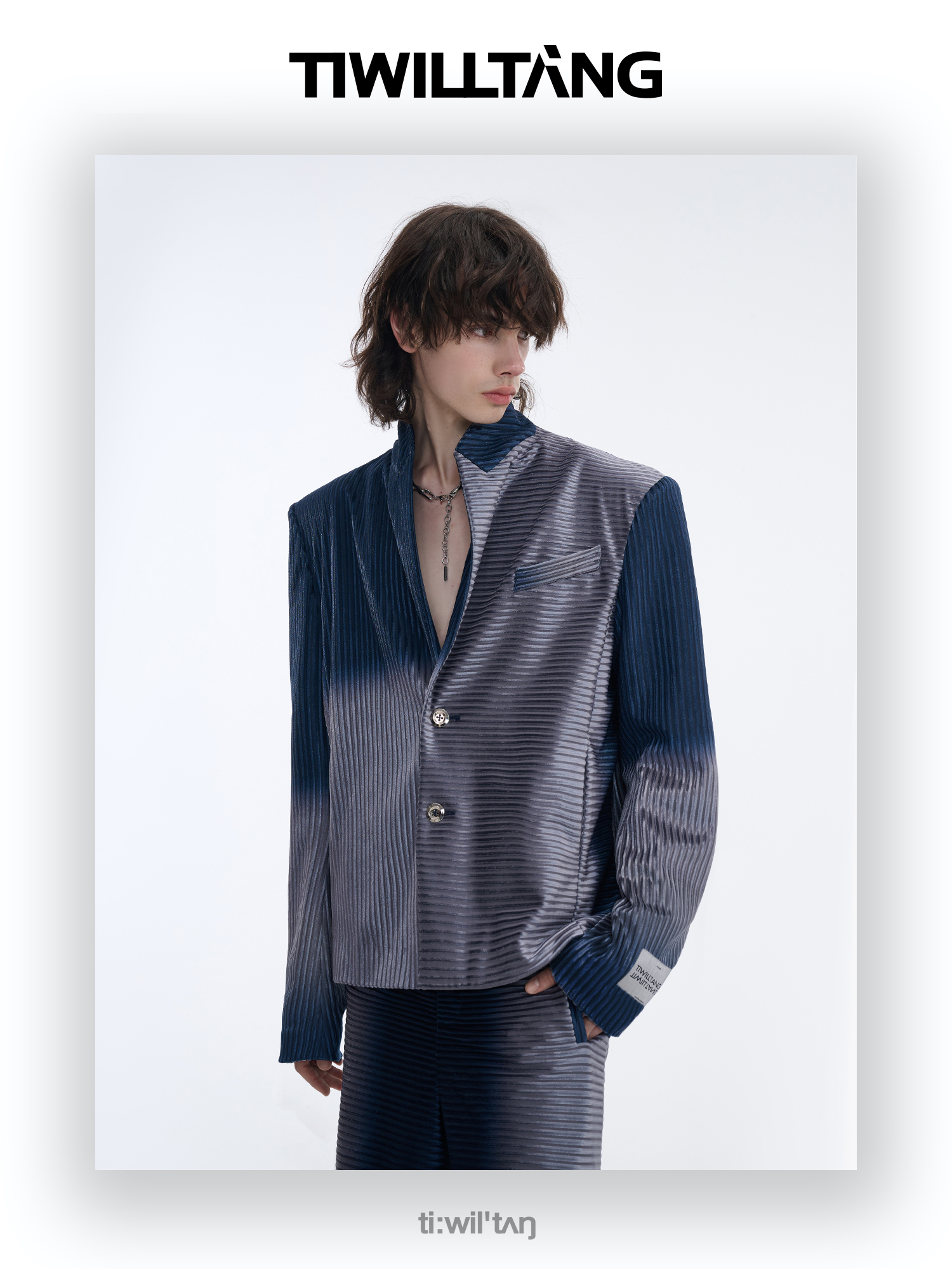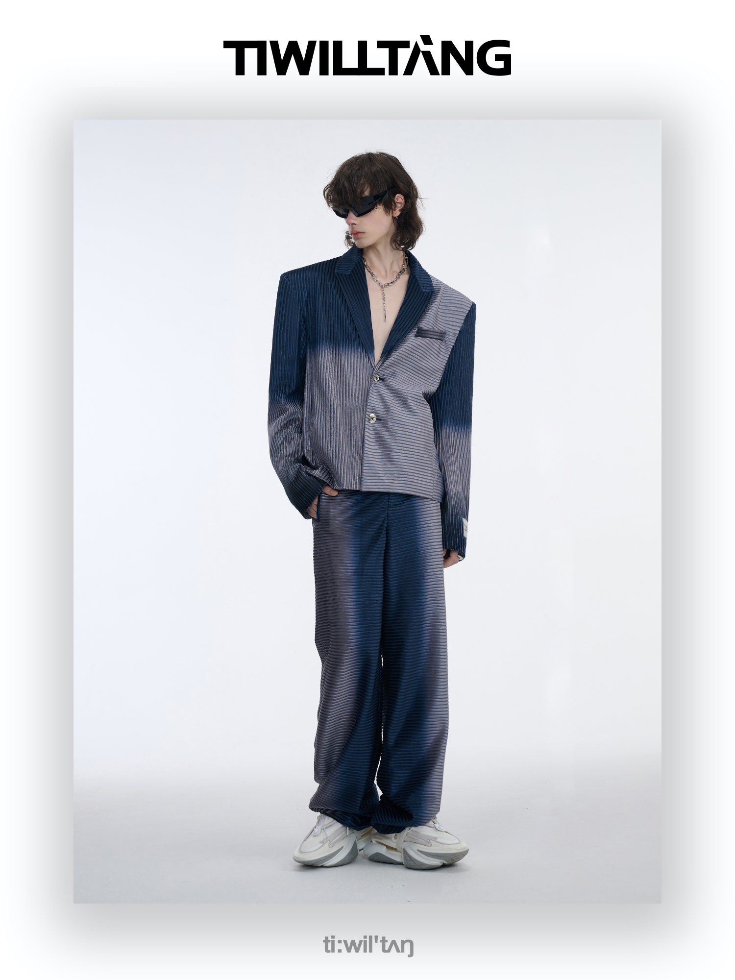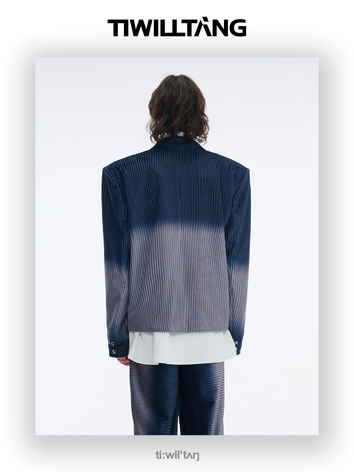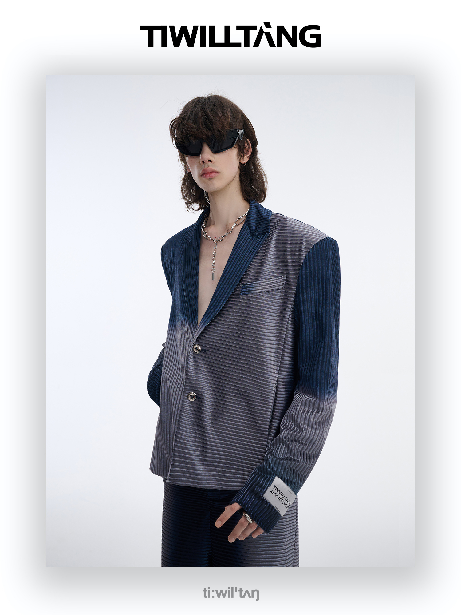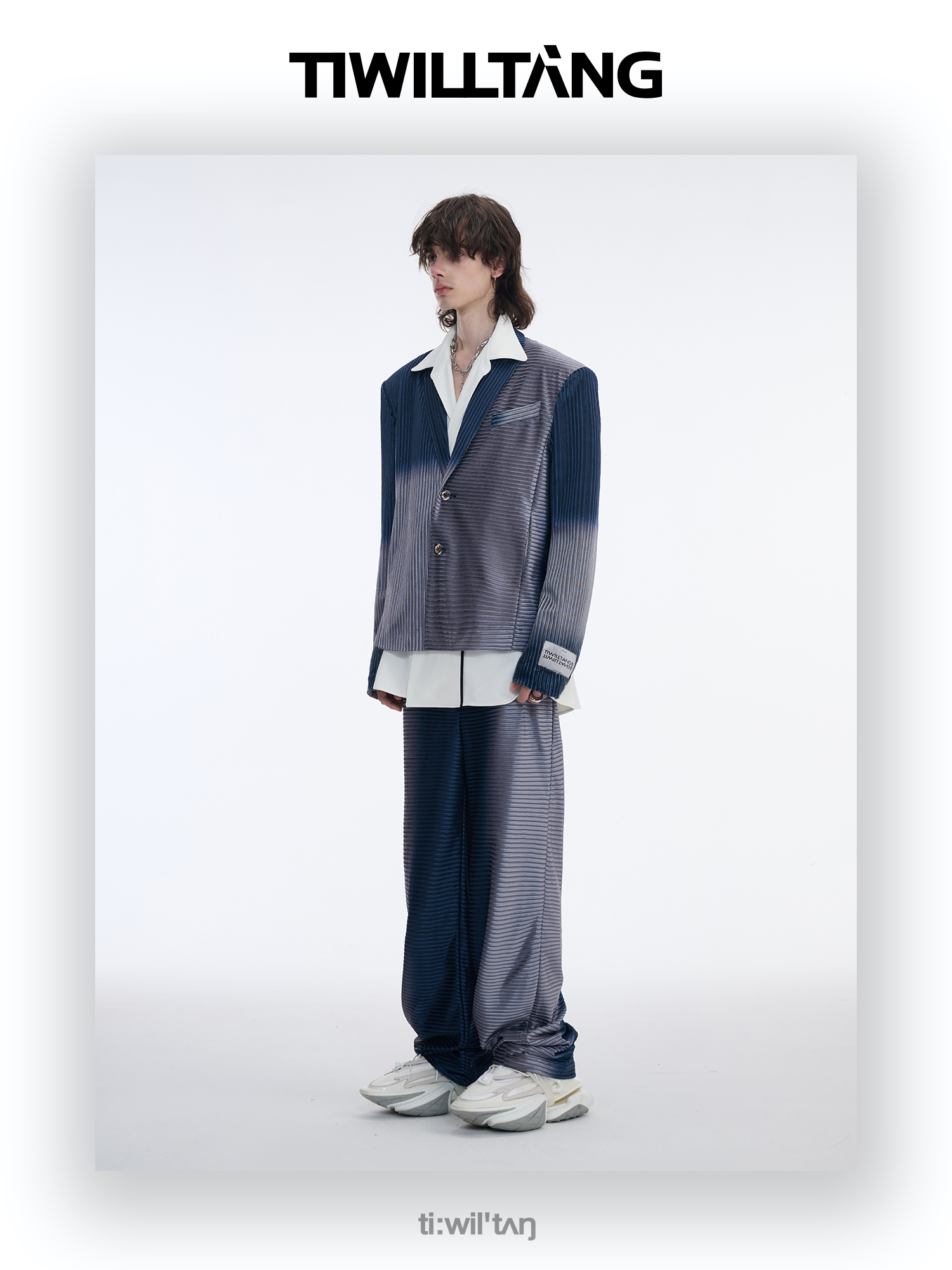 TIWILLTANG启世录“拟海泊浪”时装银蓝高级渐变缎绒轻奢西装套装