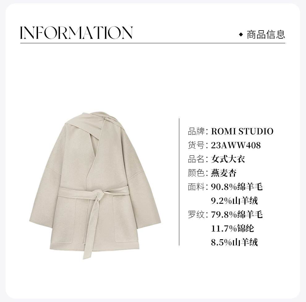ROMI STUDIO“贵妇系列”腔调穿搭山羊绒绵羊毛 带围巾大衣23AWW408