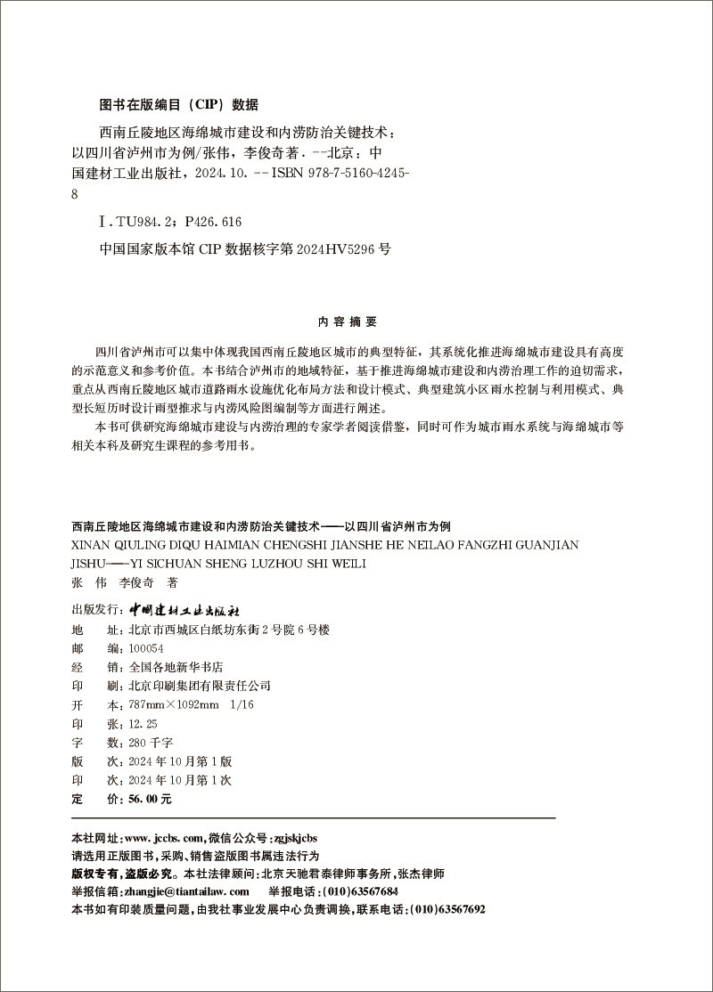 西南丘陵地区海绵城市建设和内涝防治关键技术: 以四川省泸州市为例/张伟,李俊奇著:中国建材工业出版社,2024ISBN 9787516042458