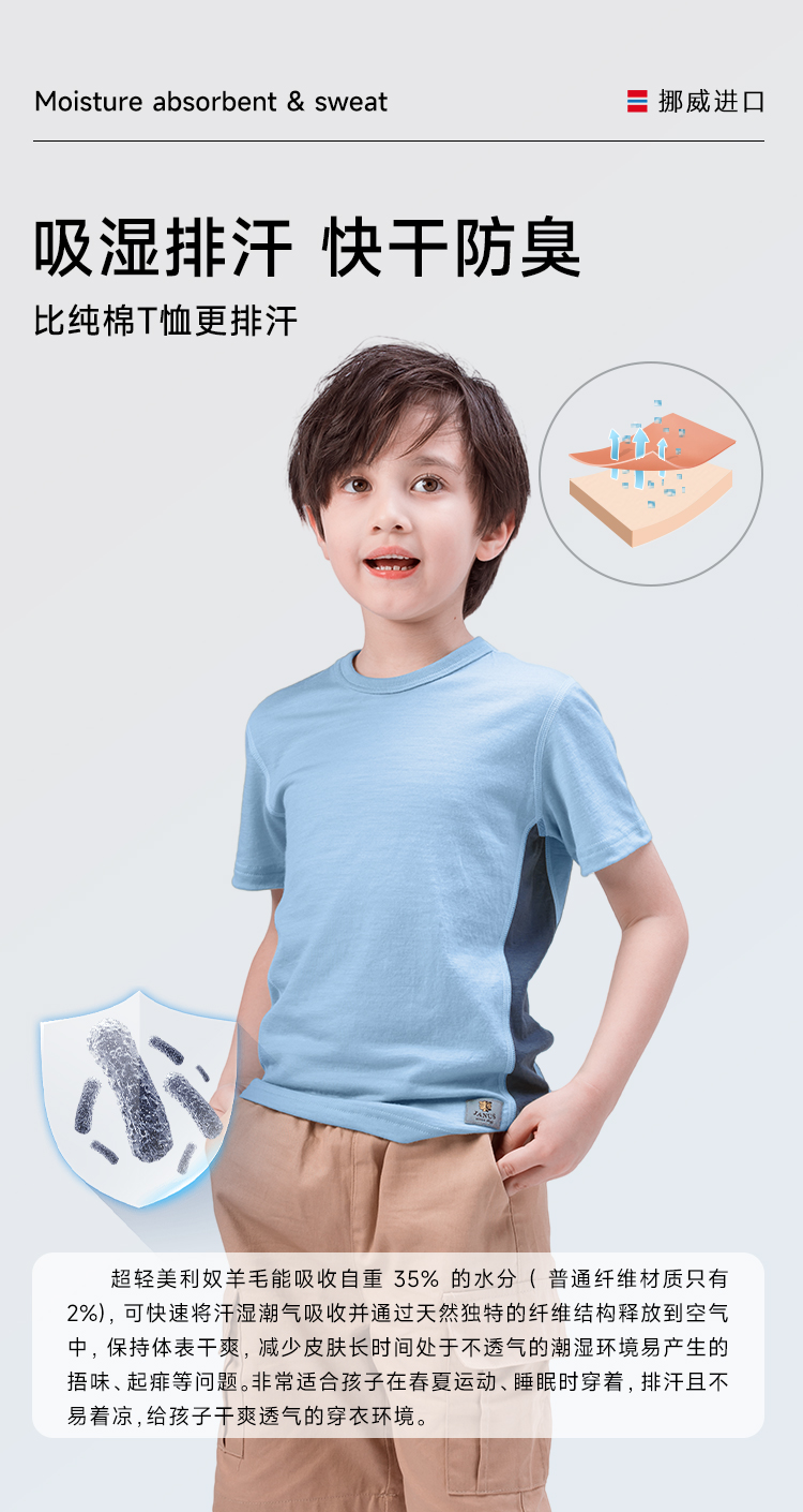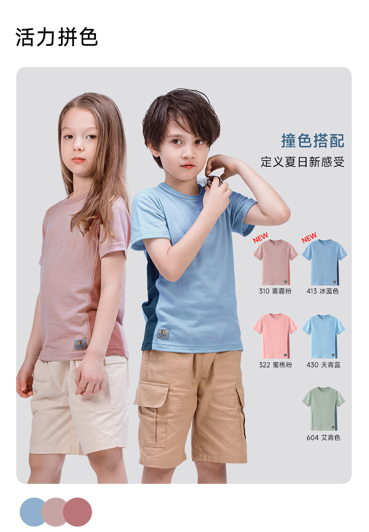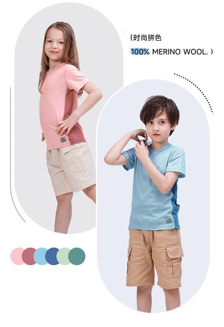 低于双11【90-170码】挪威进口JANUS春夏100%美利奴羊毛儿童超轻款拼色短袖T恤 克重159g/㎡【2025新款】