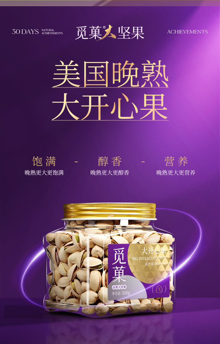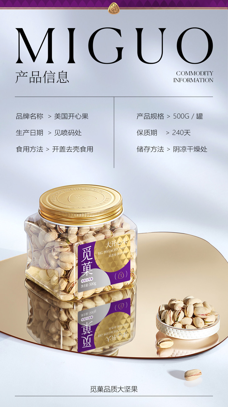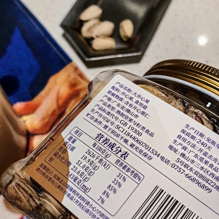 开心果盒的大大颗开心果来自美国加利福尼亚州,这里被誉为“开心果之乡”,种植过程严格控制,不使用化学肥料和农药,确保每一颗都天然健康。自然成熟的开心果,经过精心挑选和加工,不漂白、不添加防腐剂和人工色素,颗颗饱满,原汁原味,口感出众。而且开心果营养也是蛮丰富的,妔氧化,ti高免疫力,同时富含单不饱和脂肪酸和多不饱和脂肪酸,能够cu进血液循环,降D胆固醇水平,有助于维持心血管健康,所以算是适合全家都吃吃的坚果了!