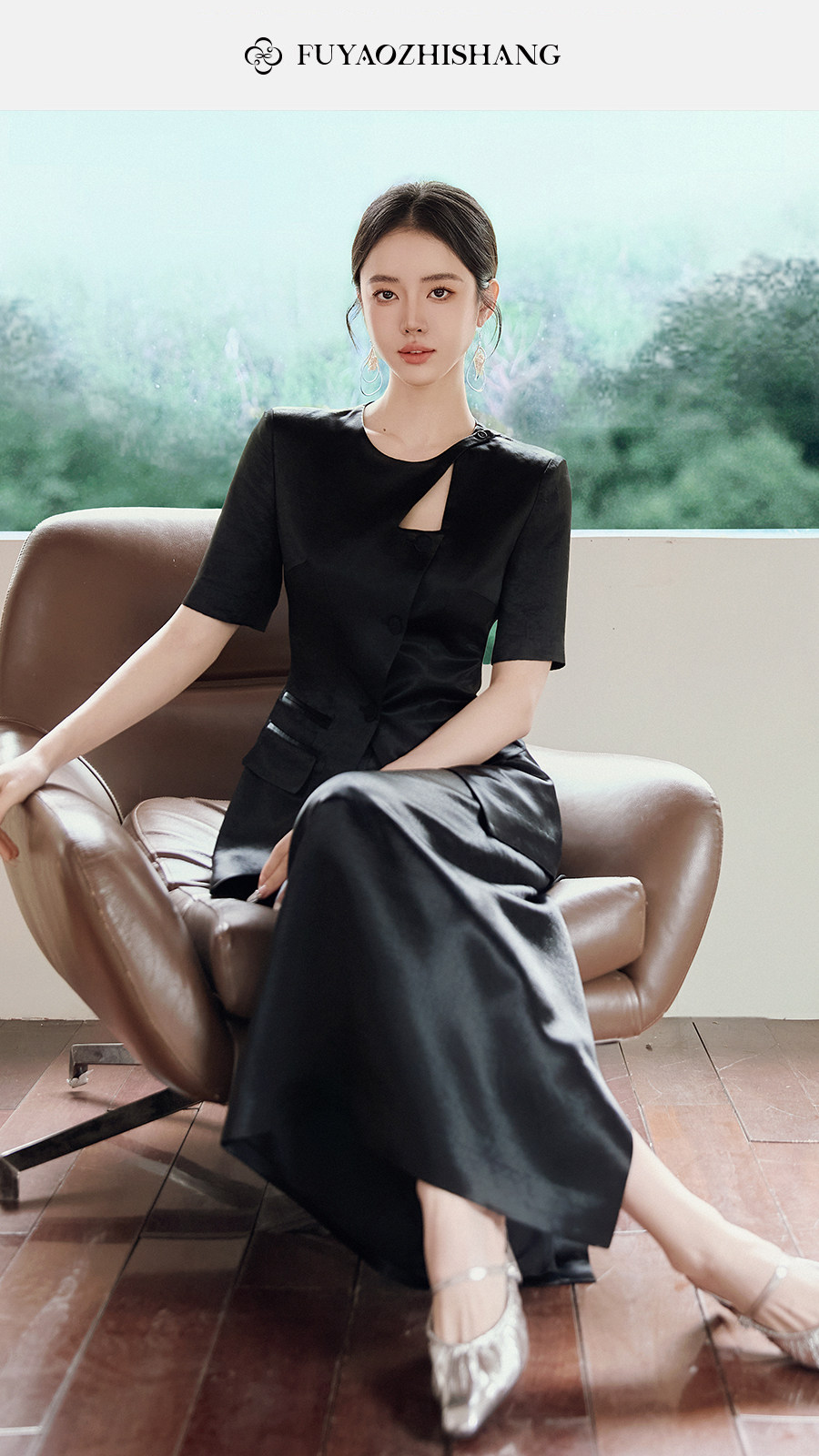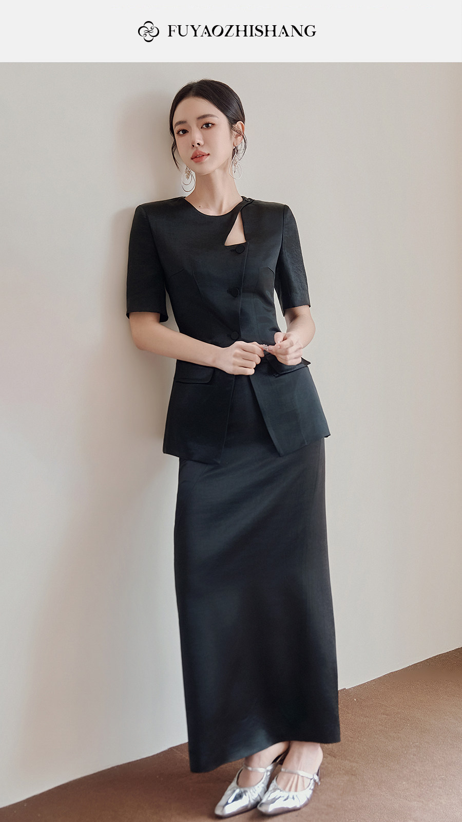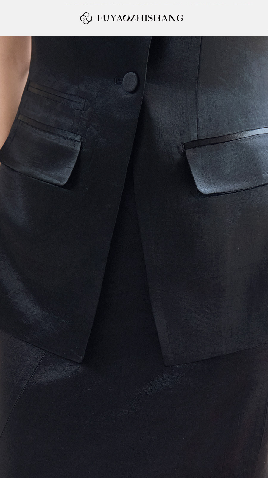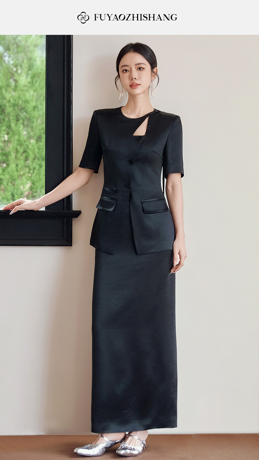 FUYAO扶摇直上 不费力优雅感黑色两件套女夏醋酸西装半身裙旗袍风