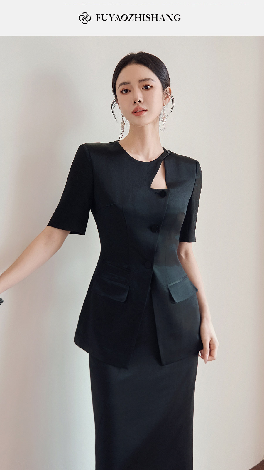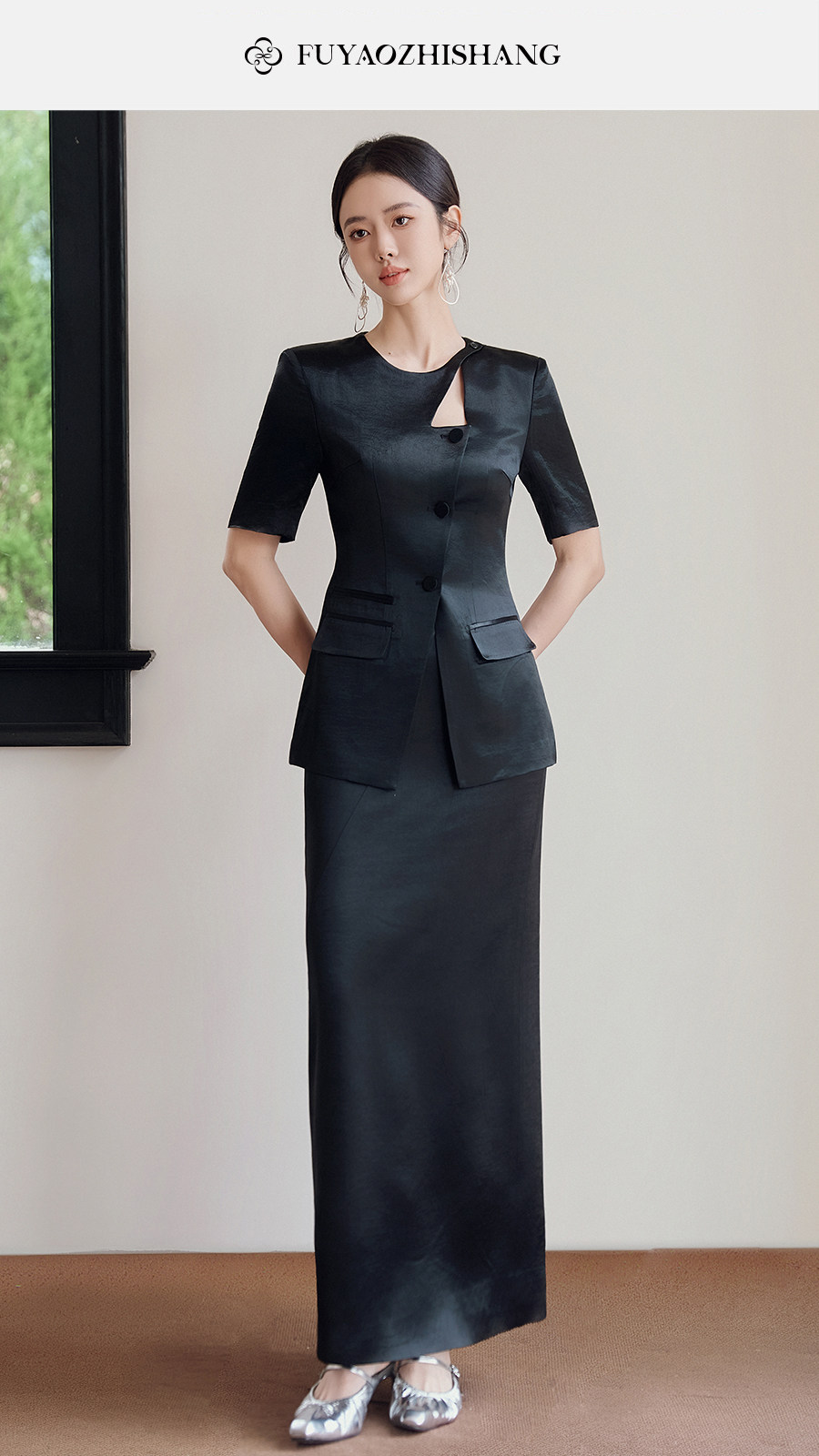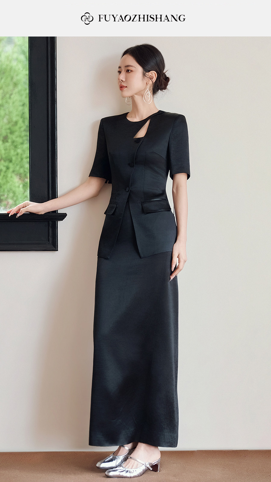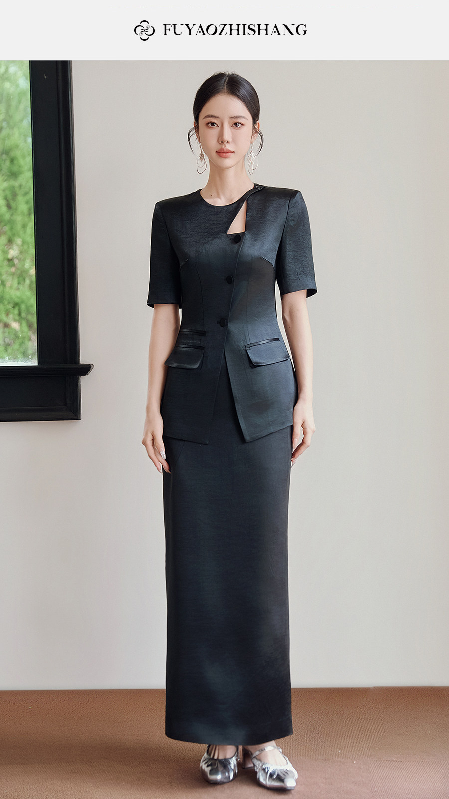 FUYAO扶摇直上 不费力优雅感黑色两件套女夏醋酸西装半身裙旗袍风
