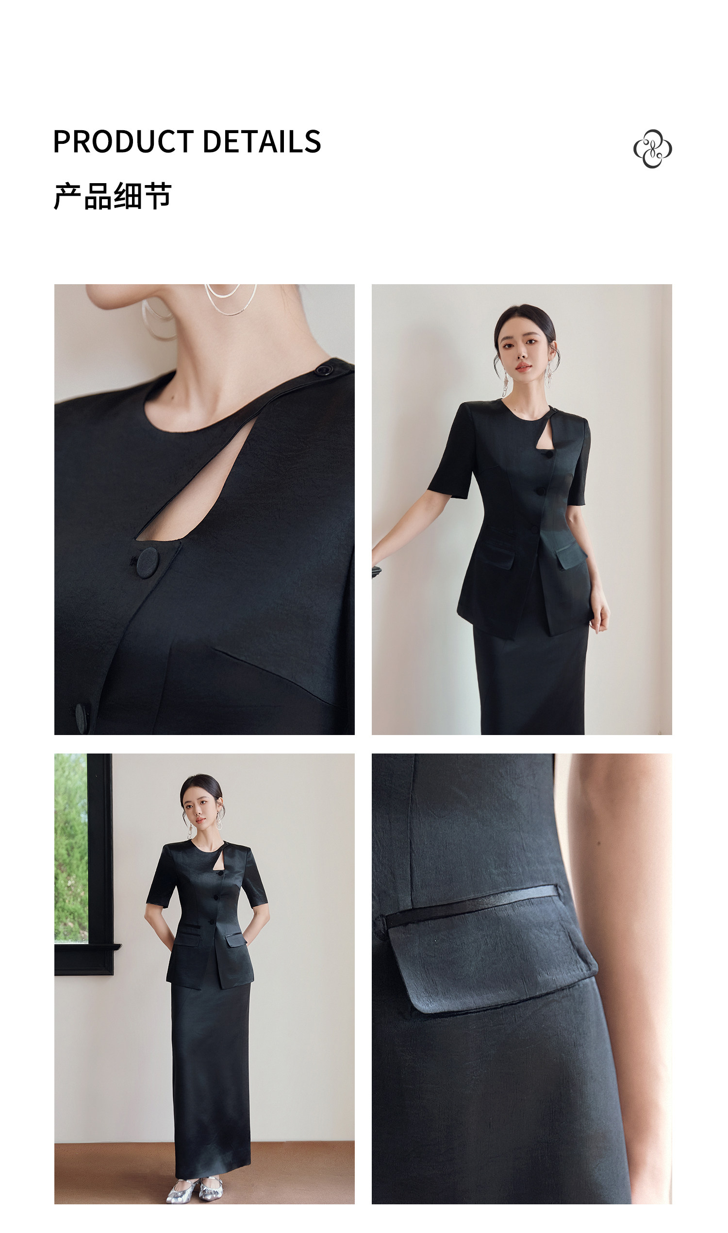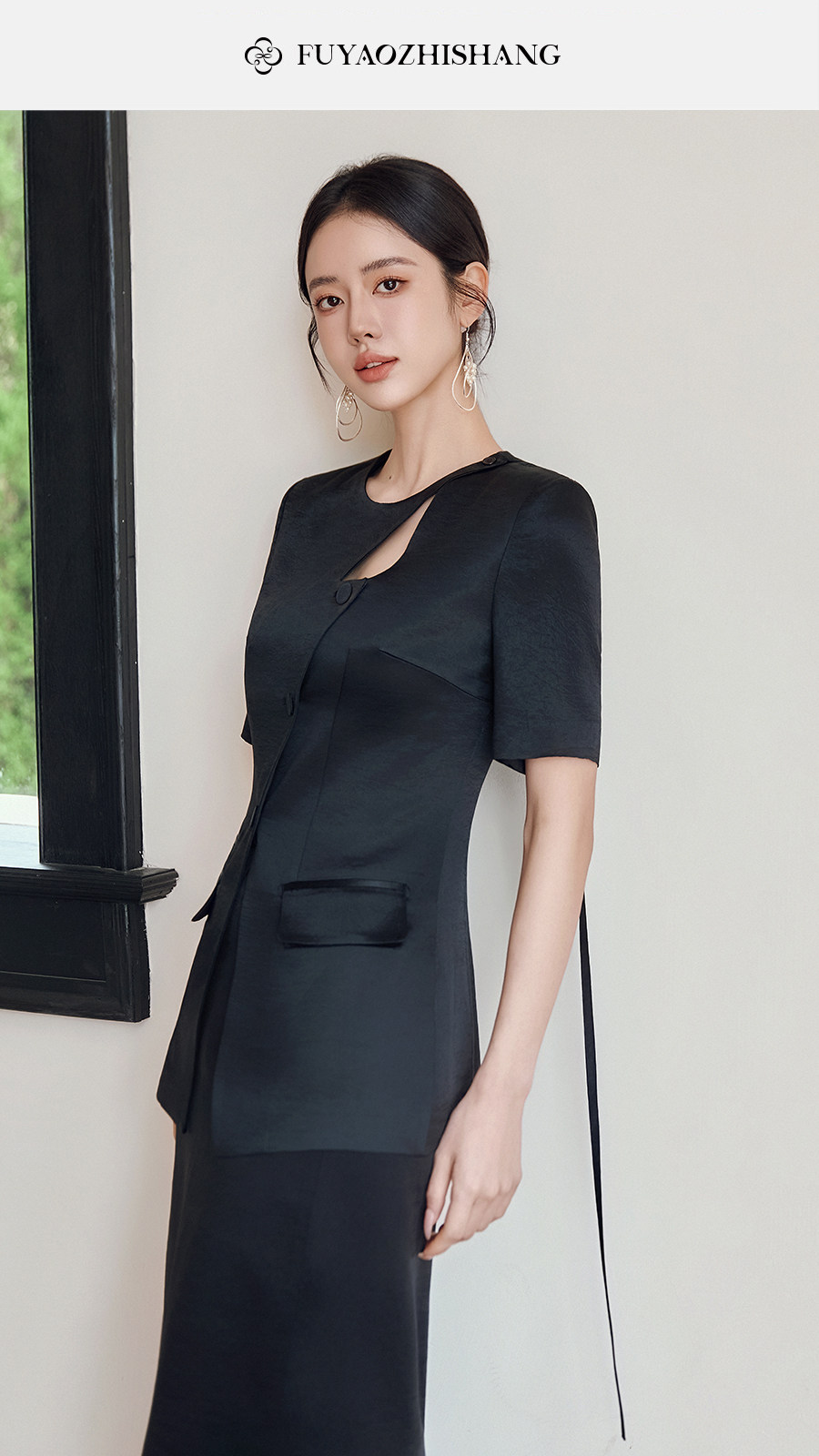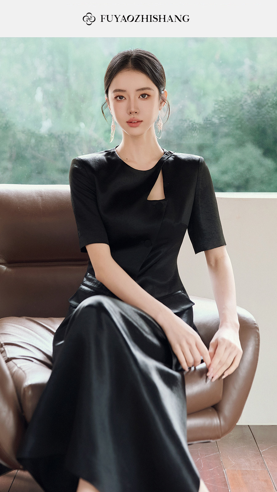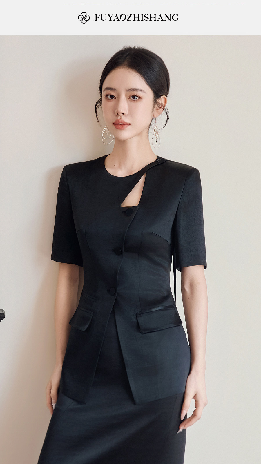 FUYAO扶摇直上 不费力优雅感黑色两件套女夏醋酸西装半身裙旗袍风