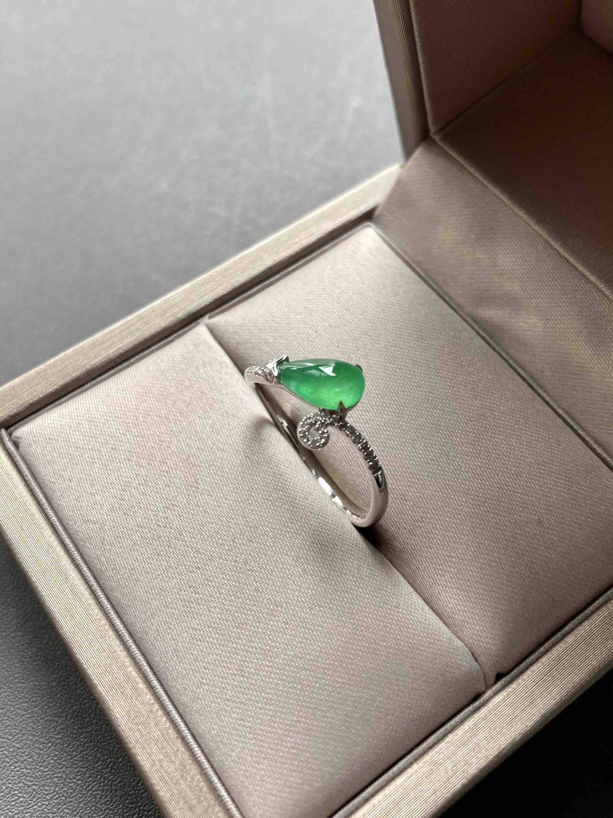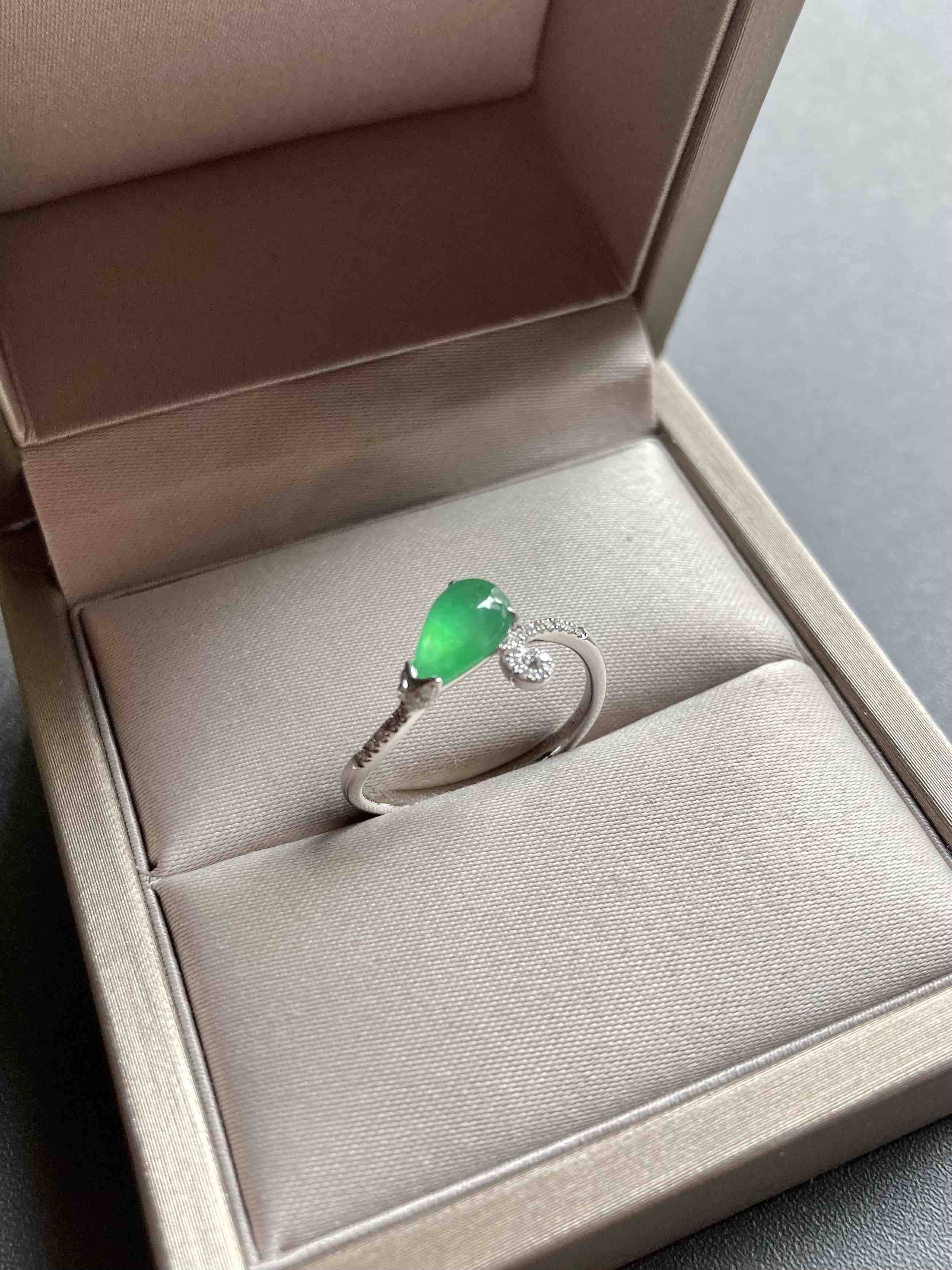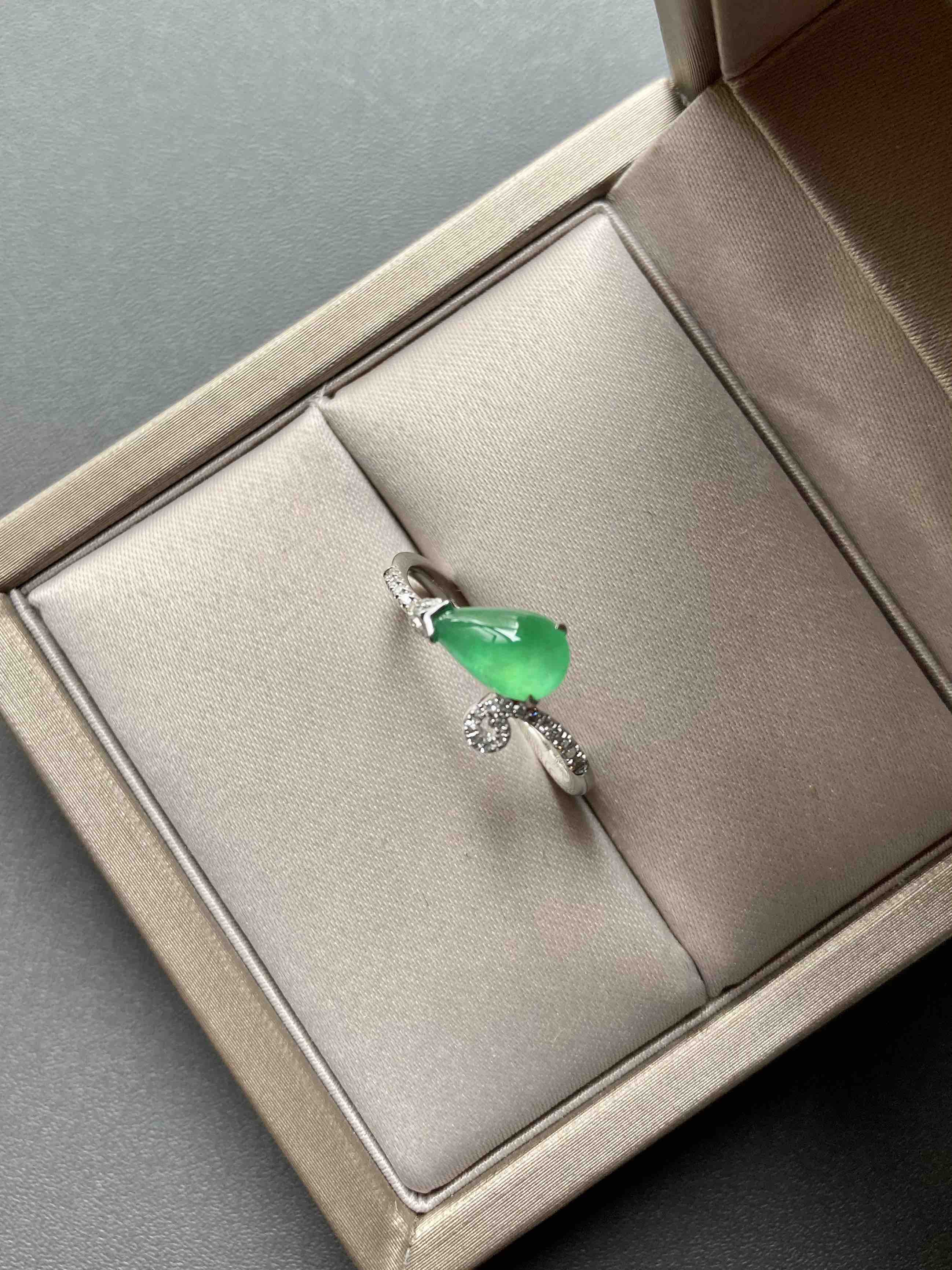高冰种阳绿翡翠水滴戒指18k白金钻石镶嵌
