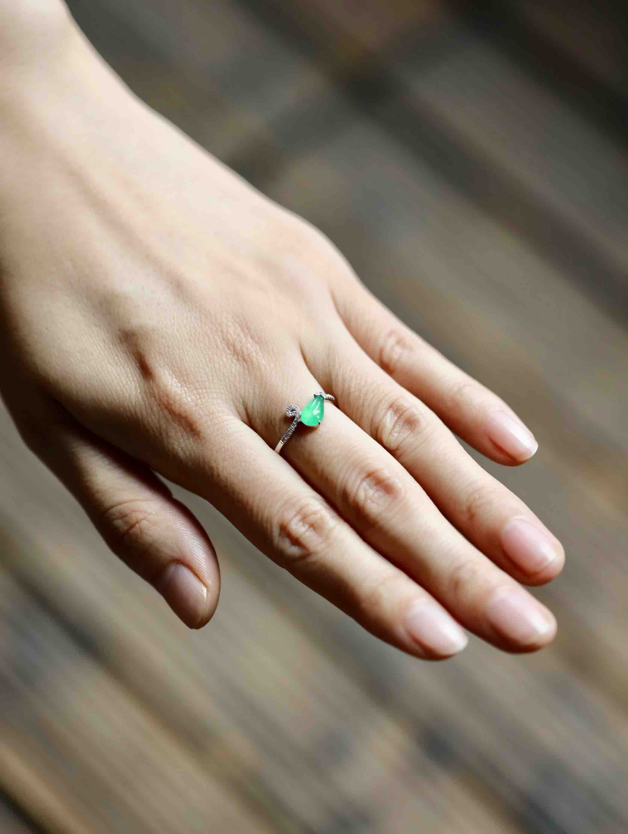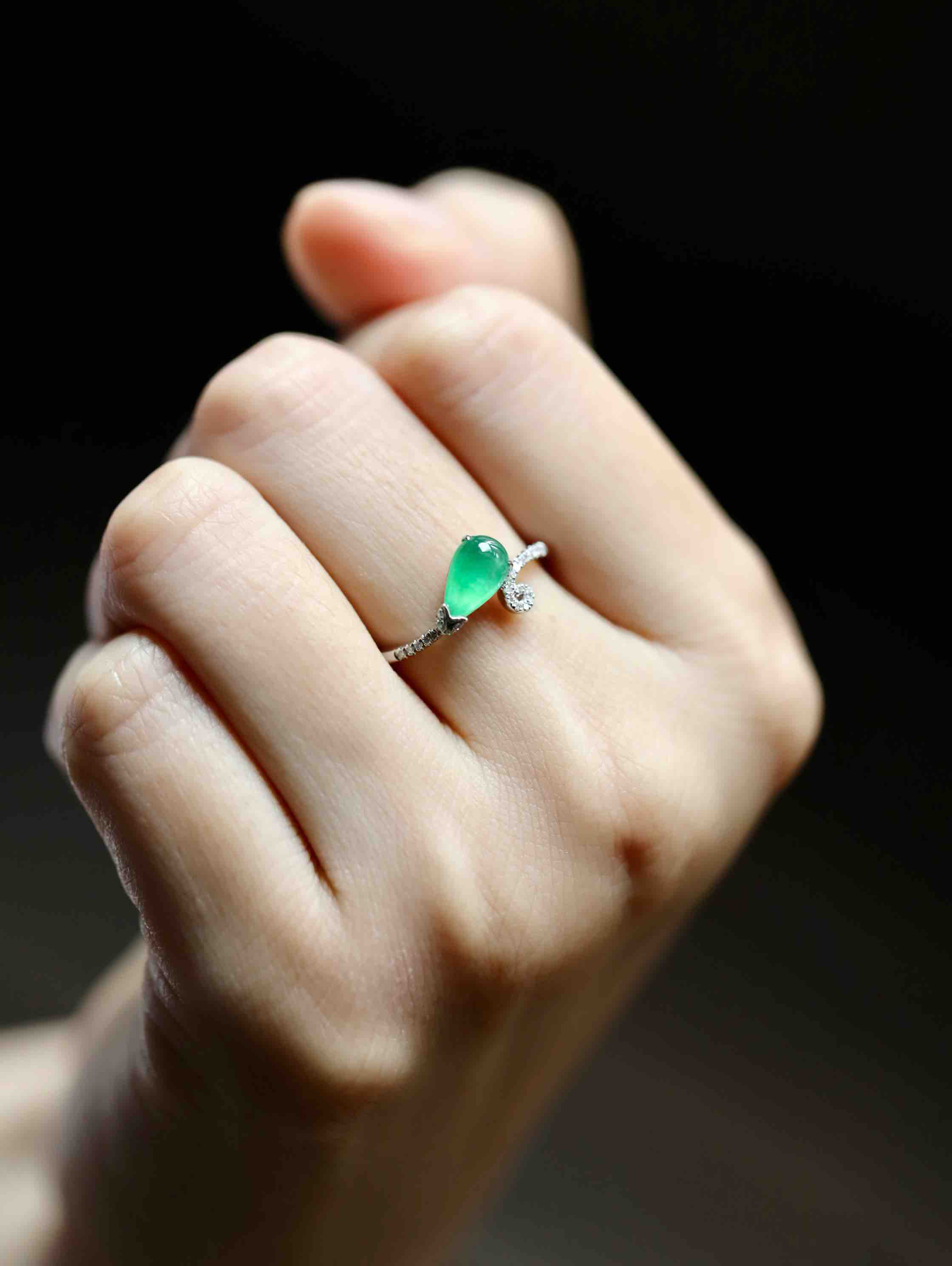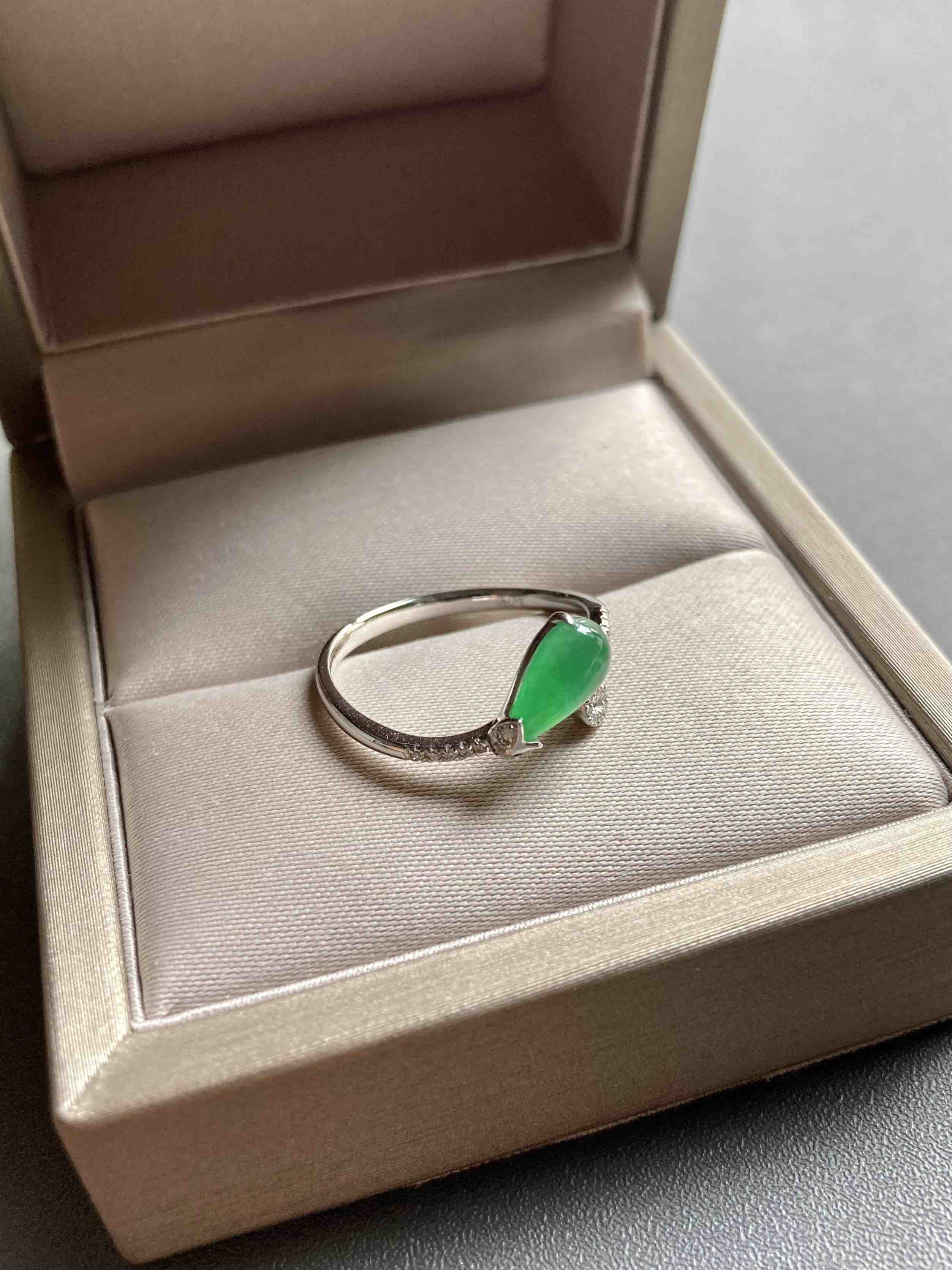 高冰种阳绿翡翠水滴戒指18k白金钻石镶嵌